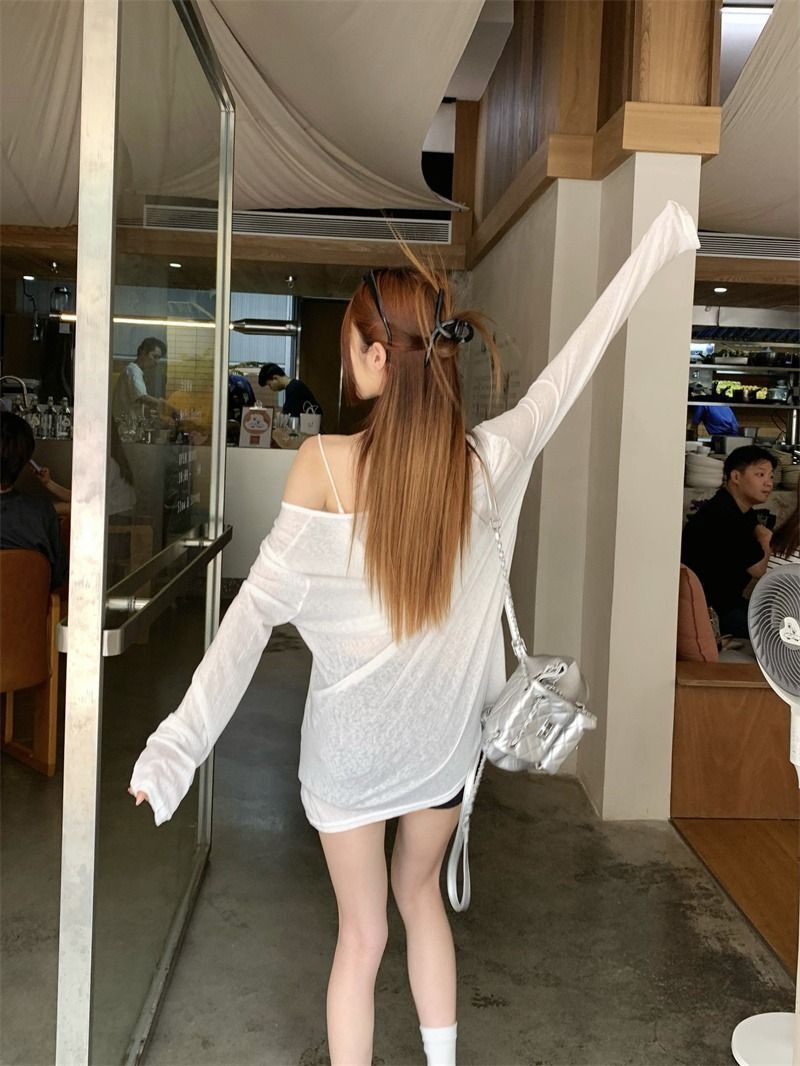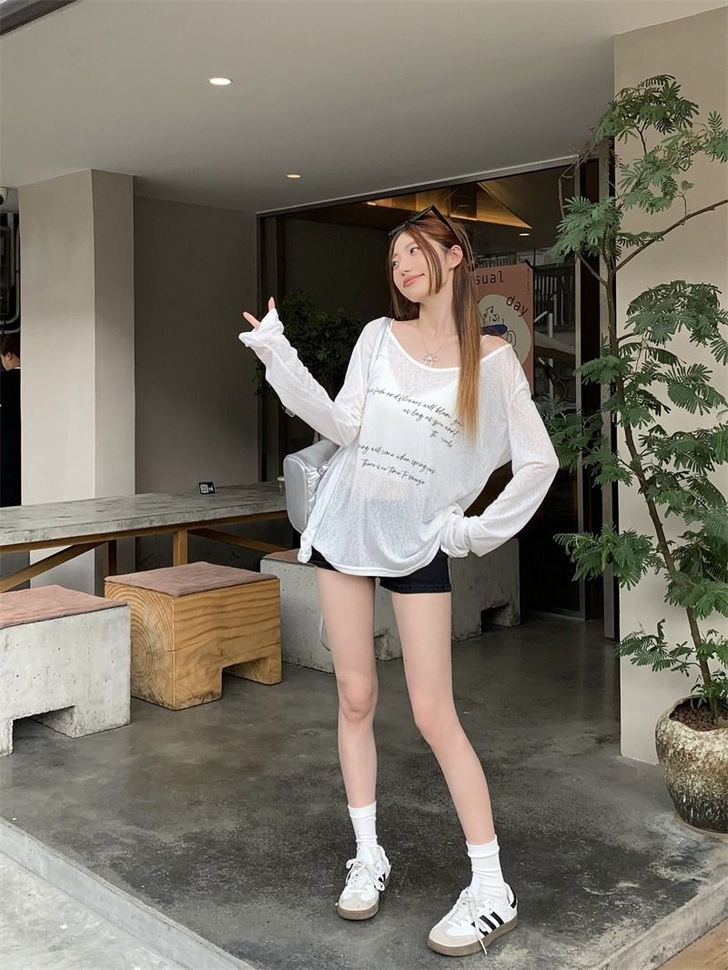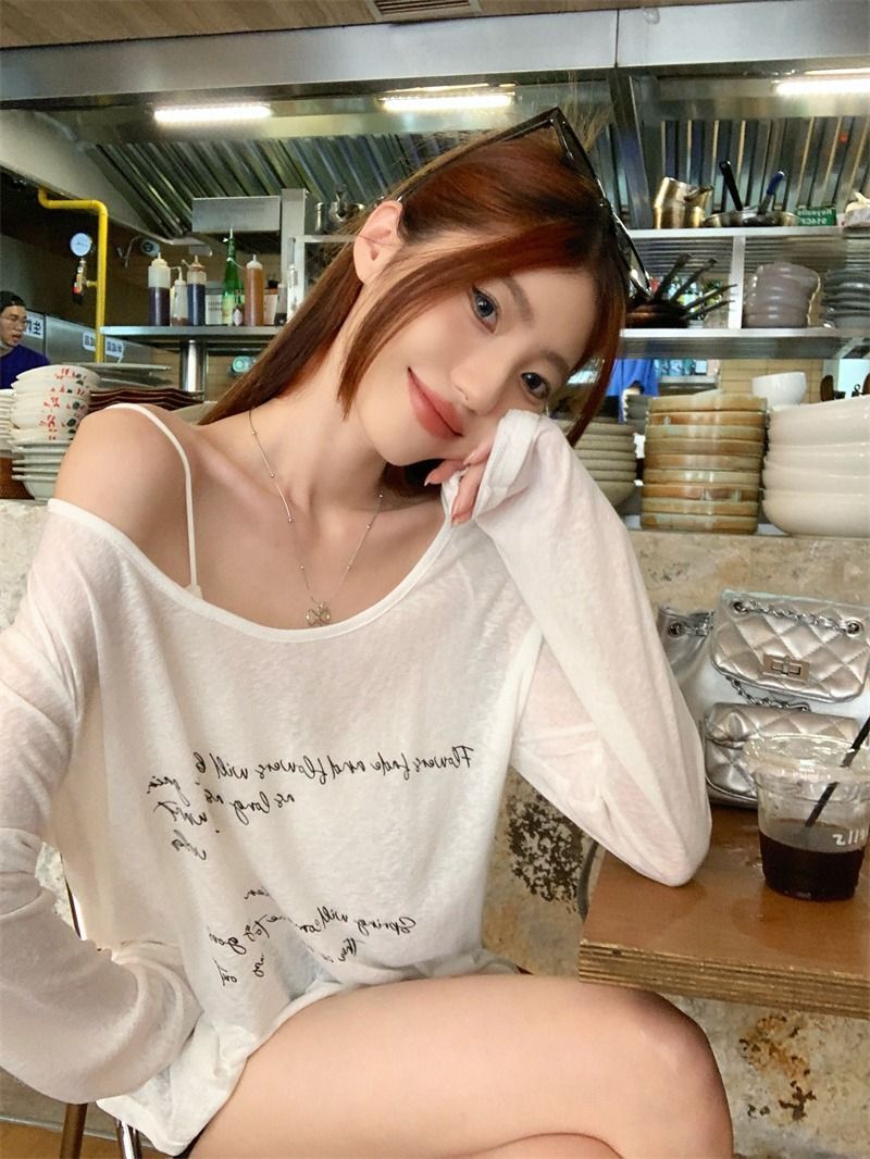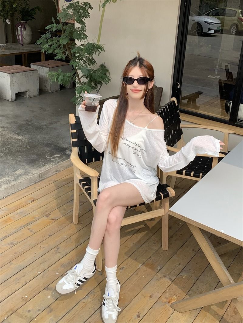 ![MR [Bamboo Ribbed] Korean Style Lazy White Letter Long Sleeve Women's Off-Shoulder Loose Thin Sun Protection Cover-up](images/mrwg/mrwg292e_04.jpg)