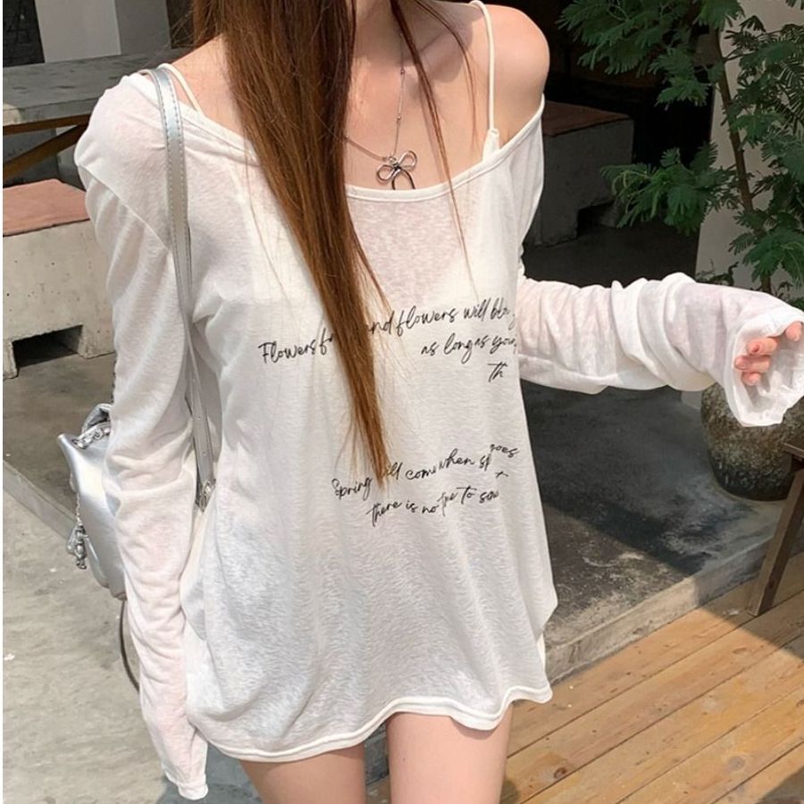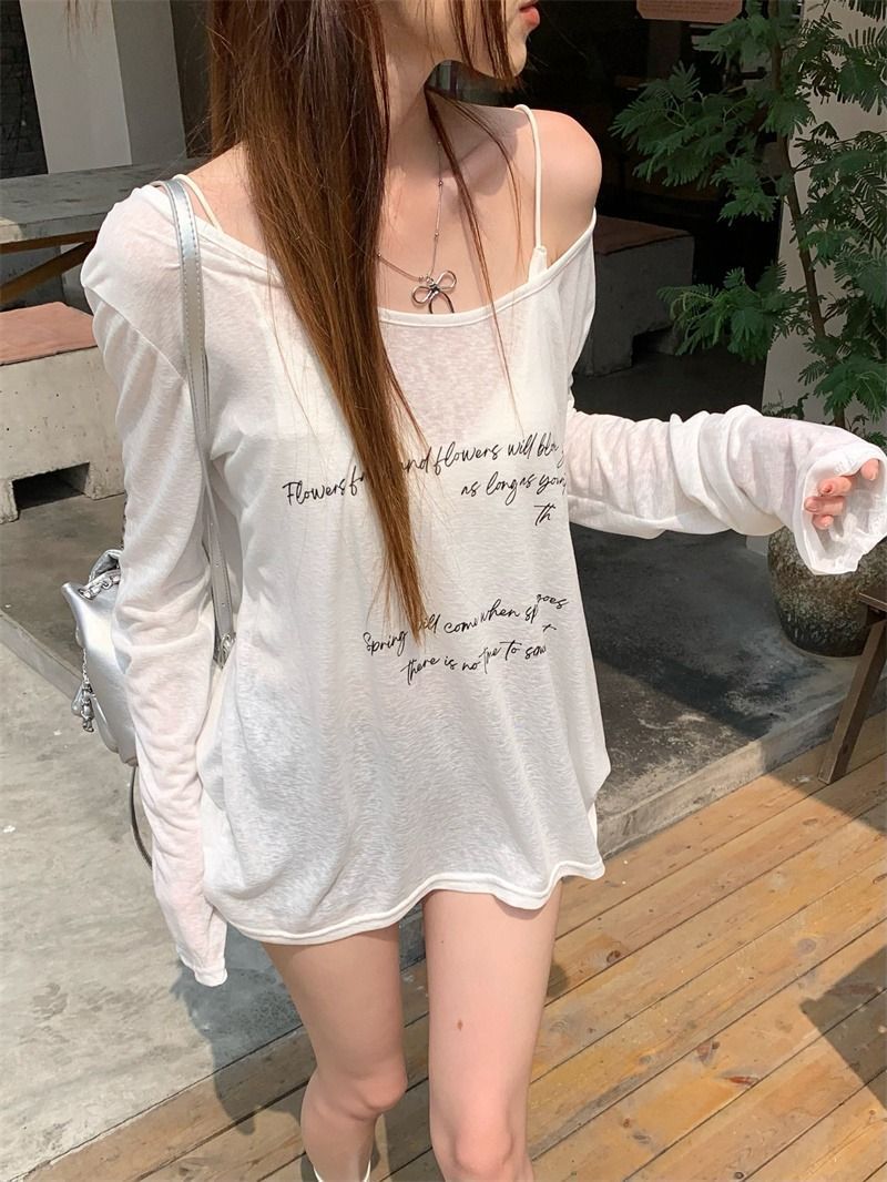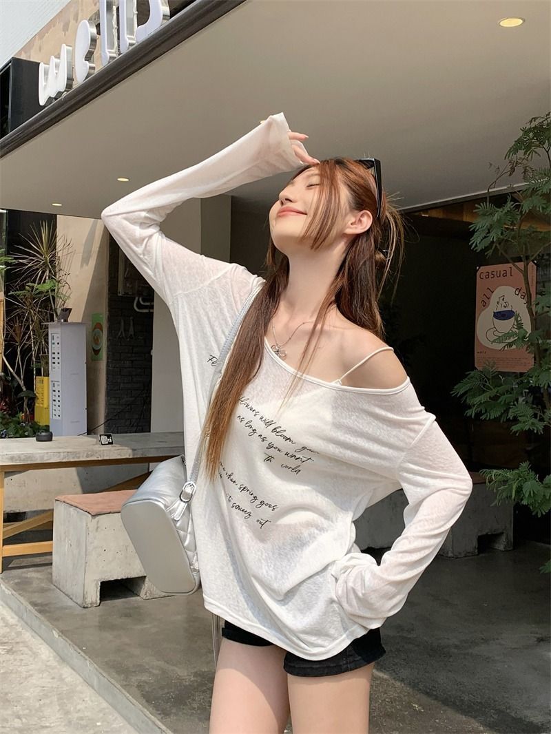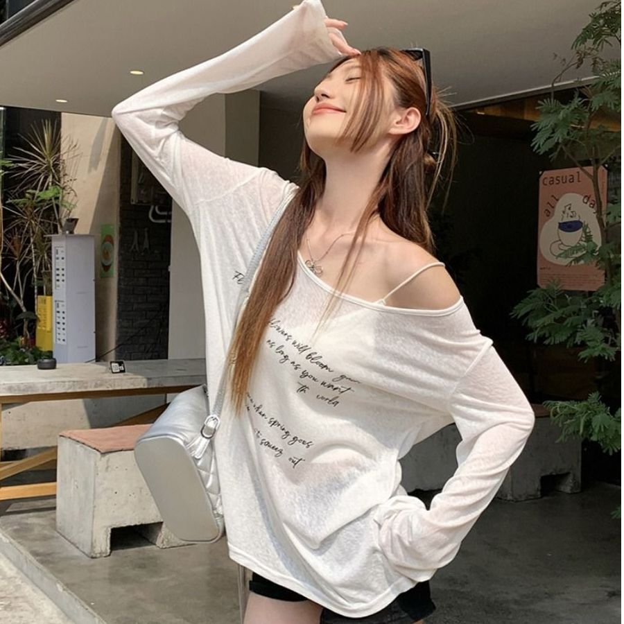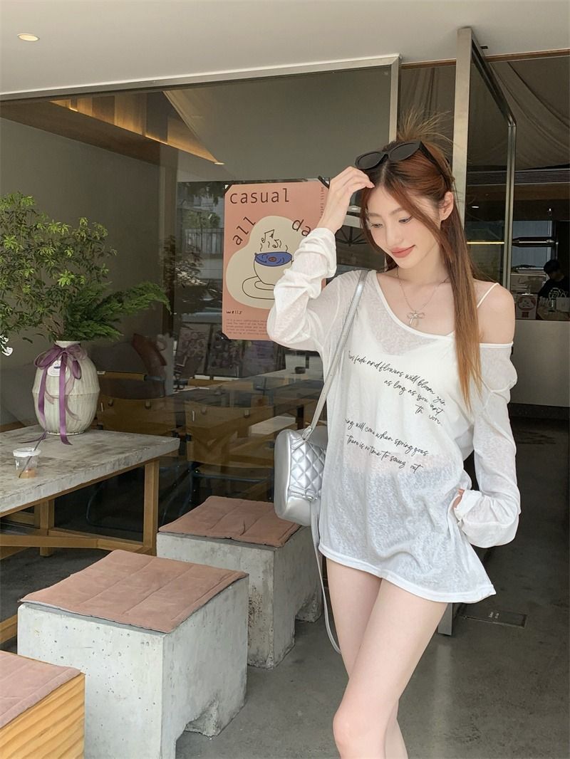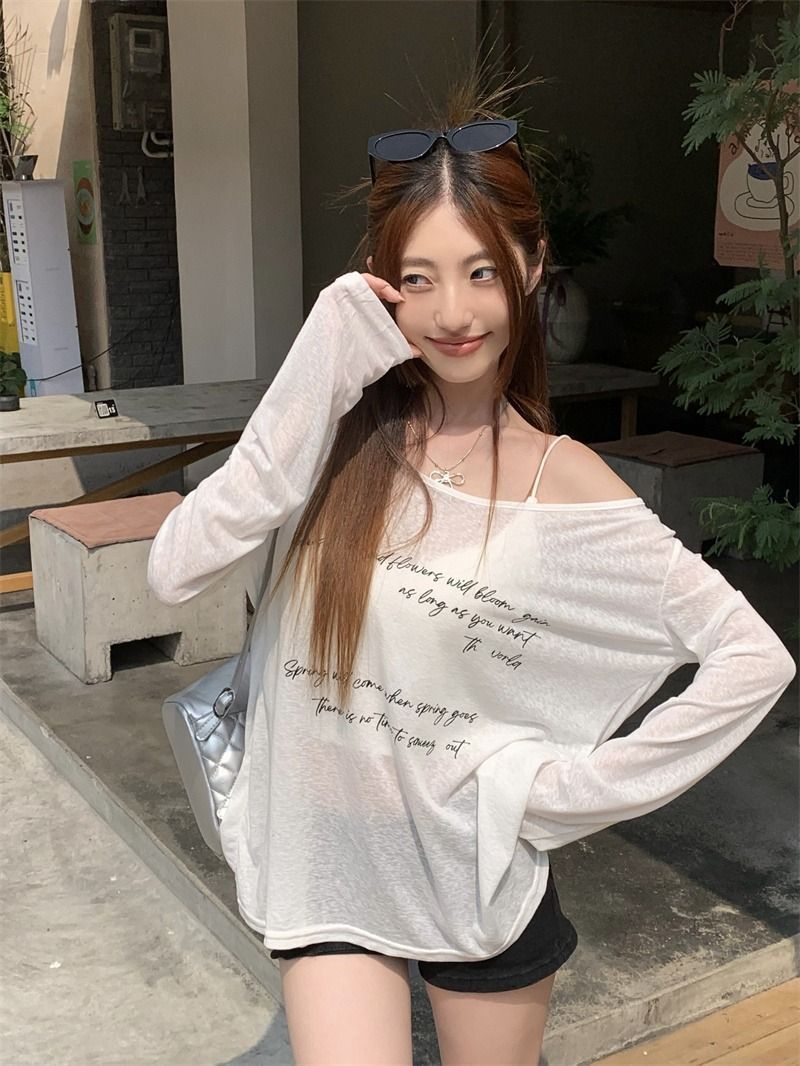 ![MR [Bamboo Ribbed] Korean Style Lazy White Letter Long Sleeve Women's Off-Shoulder Loose Thin Sun Protection Cover-up](images/mrwg/mrwg292e_01.jpg)
