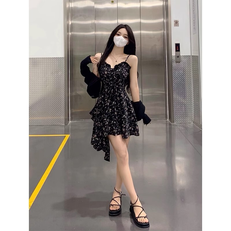 Plus-size French-style sexy slip dress, summer irregular short skirt, unique design floral dress for women.