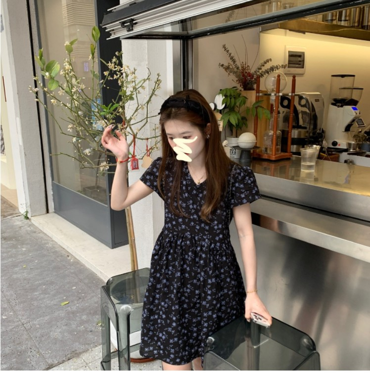 Black petite dress, 2024 new style, summer floral tea dress, French style, lisianthus, slim fit, Mori girl look.