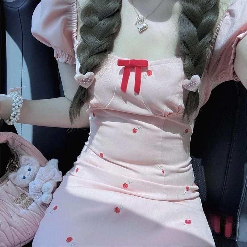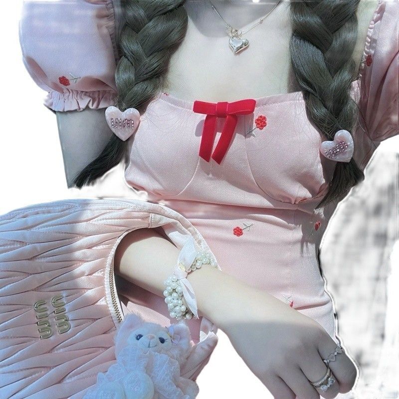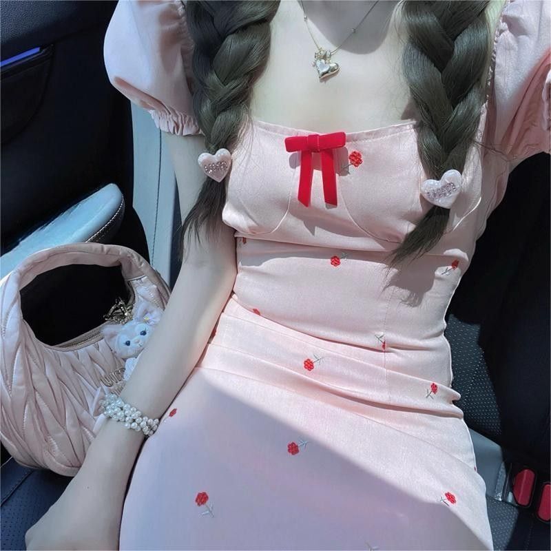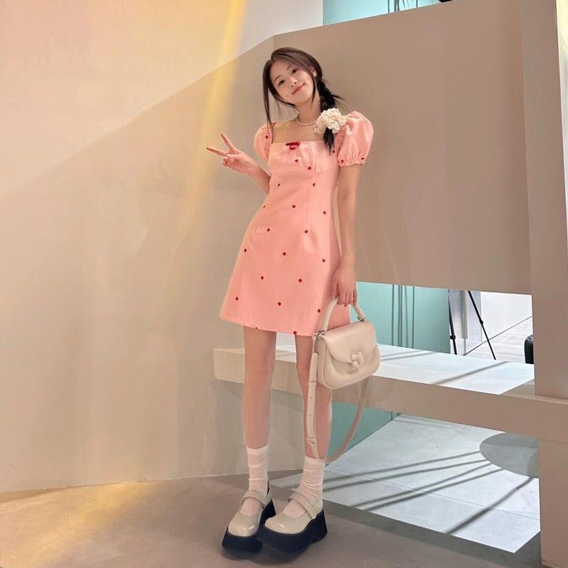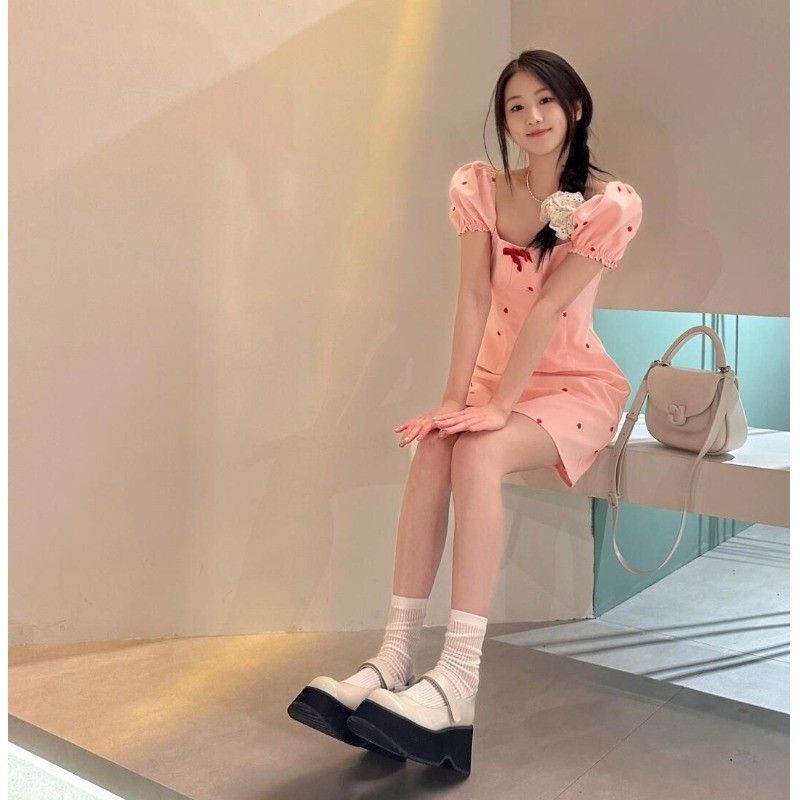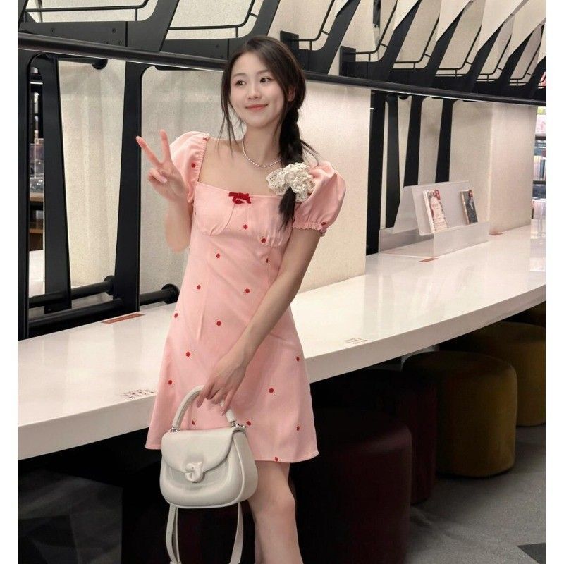 • 2024 Summer New Arrival: Pink Square Neck Short-Sleeve Dress with a Chanel-Inspired Style, Feminine and Petite Fit, French Sweet and Spicy