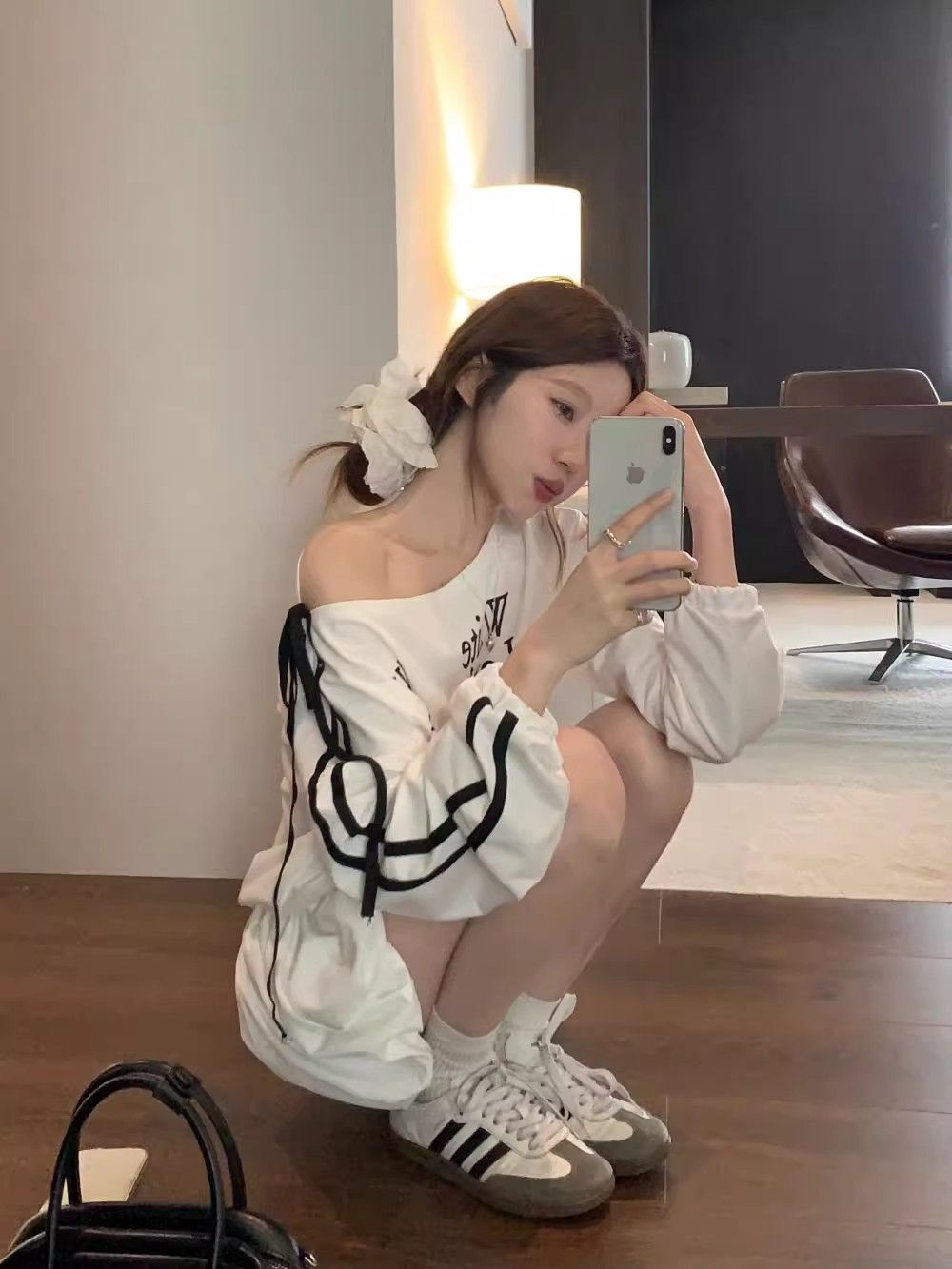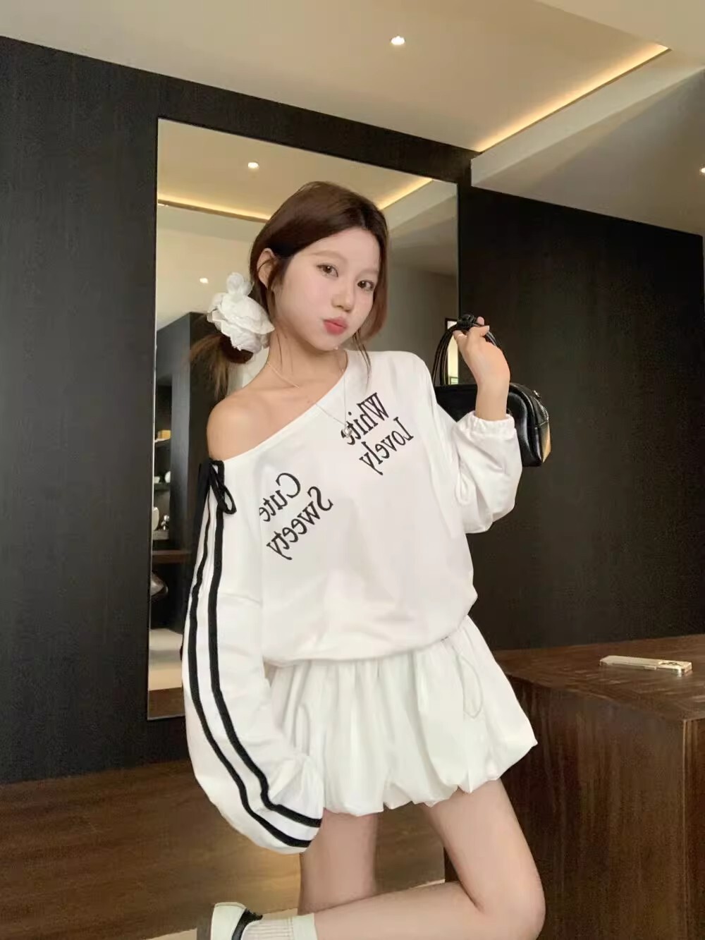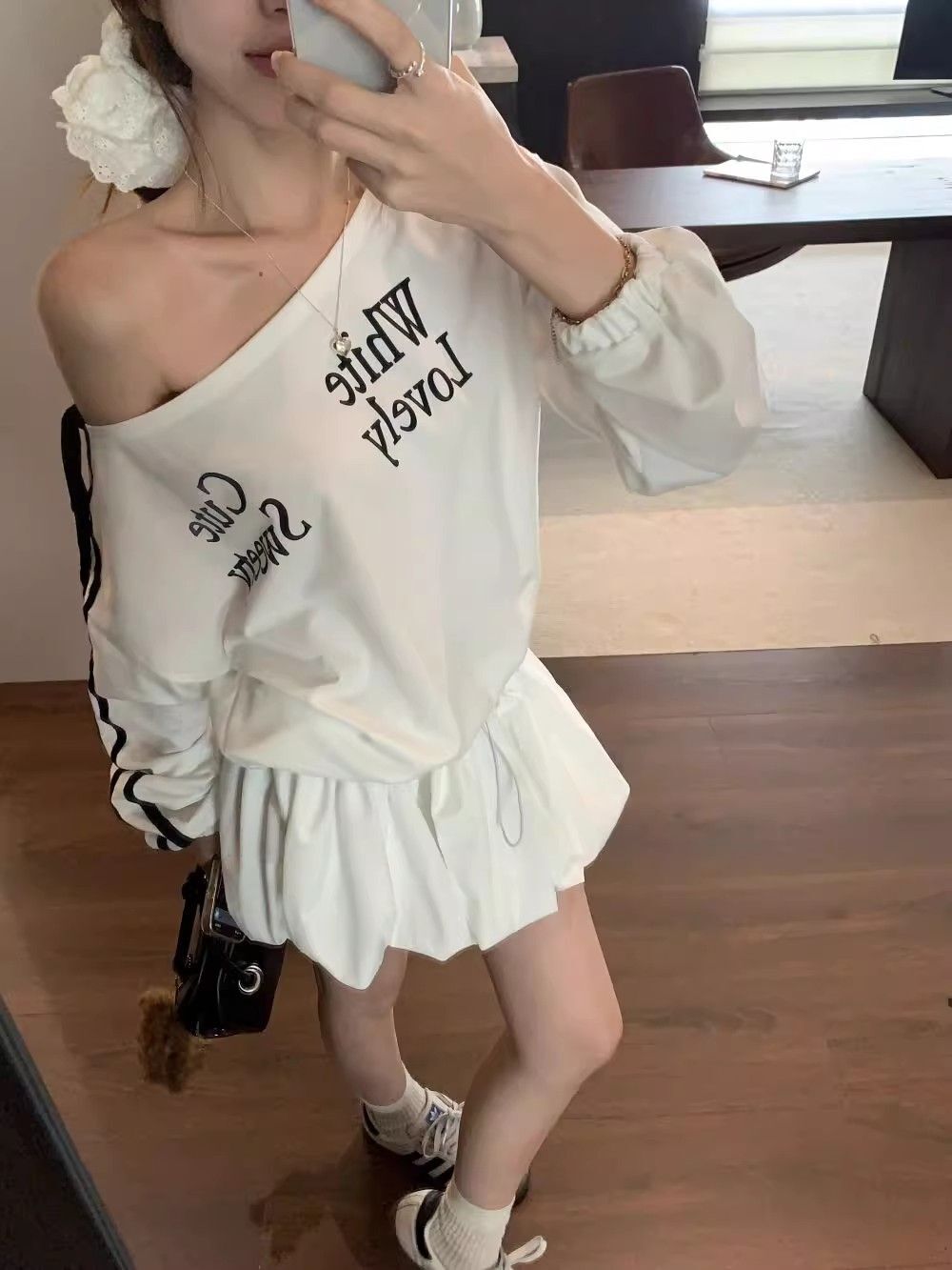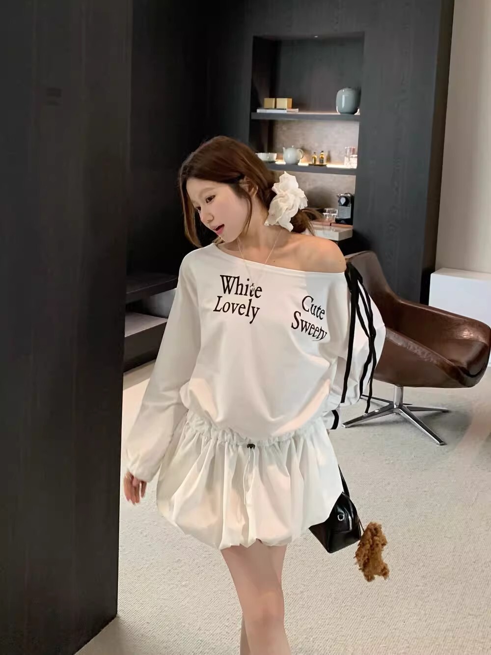 Letter print off-shoulder long-sleeved sweatshirt dress for women, autumn color-blocked striped short skirt, slimming waist tulip skirt