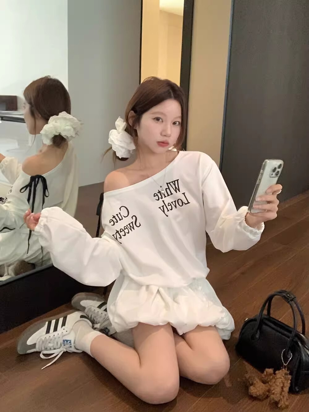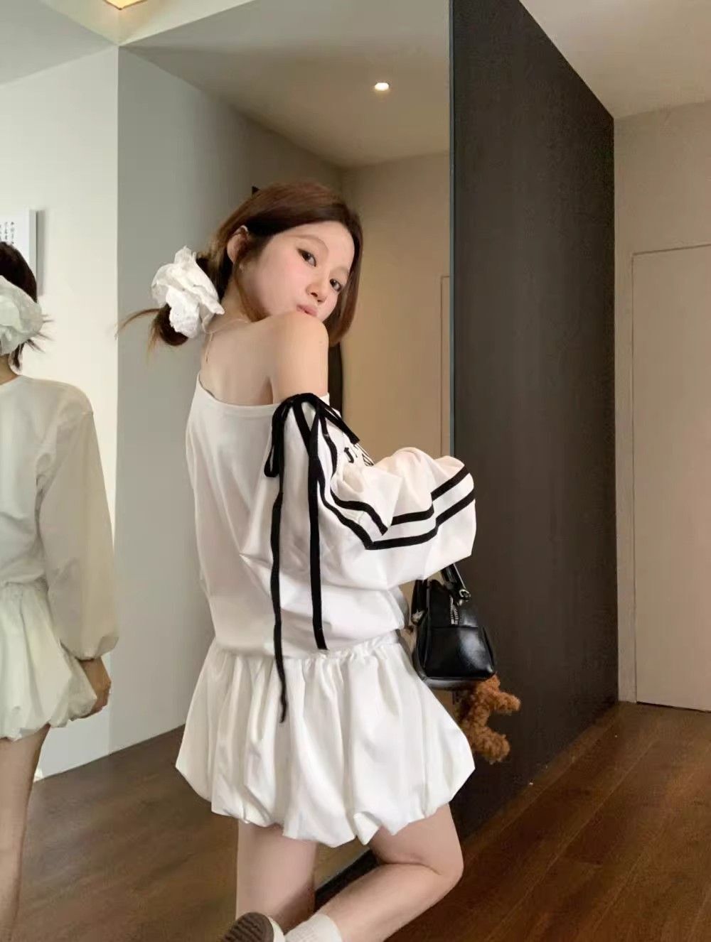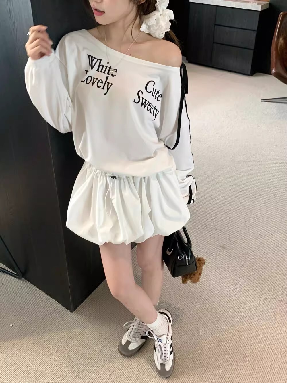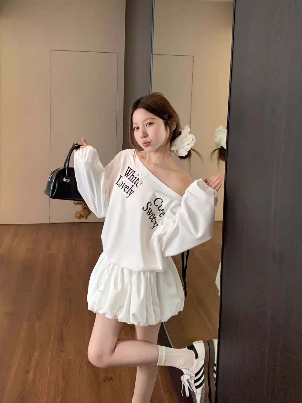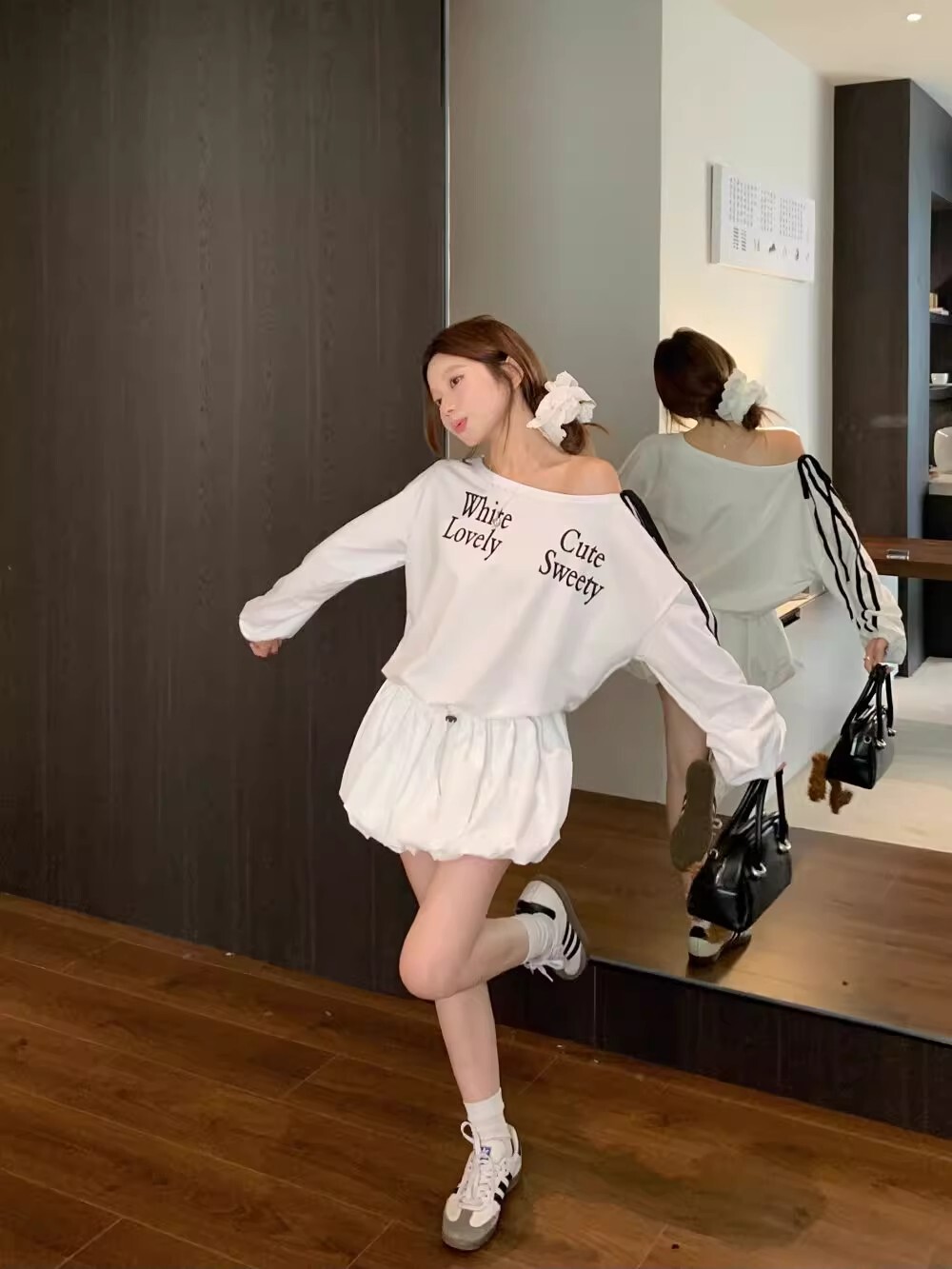 Letter print off-shoulder long-sleeved sweatshirt dress for women, autumn color-blocked striped short skirt, slimming waist tulip skirt