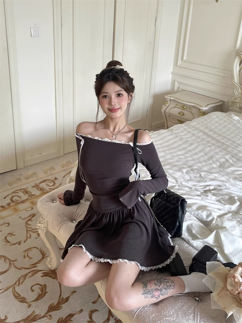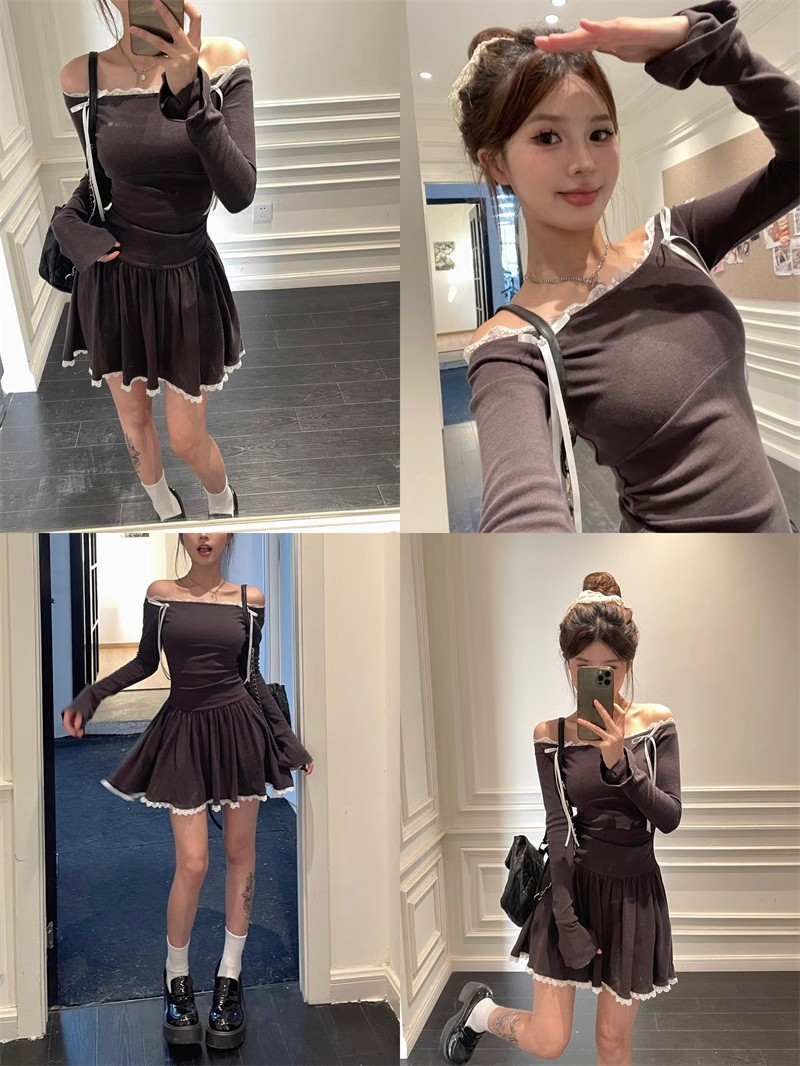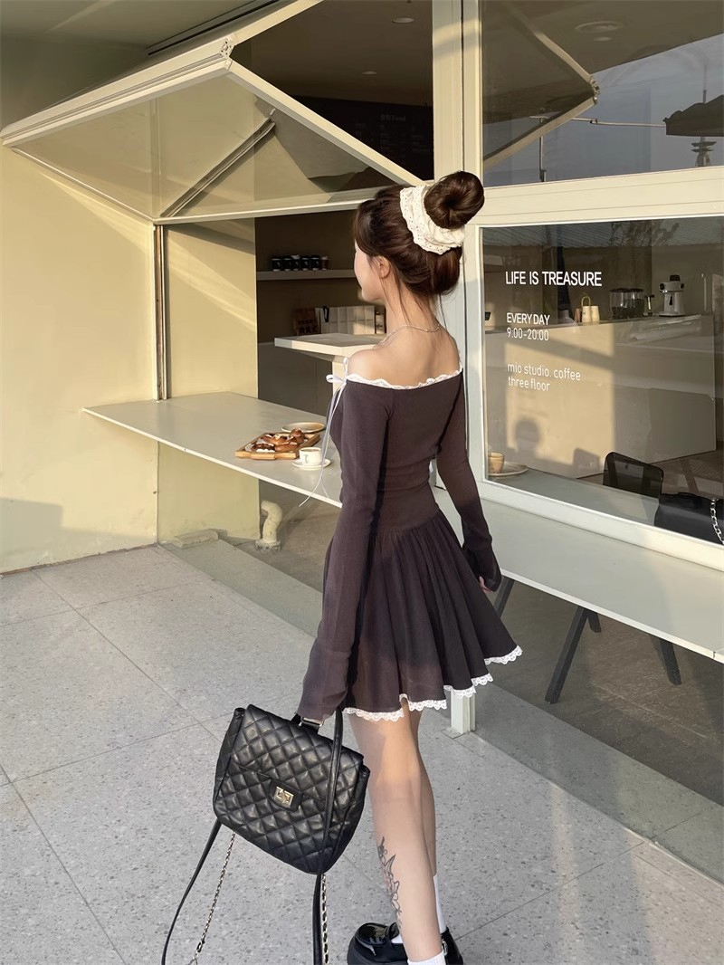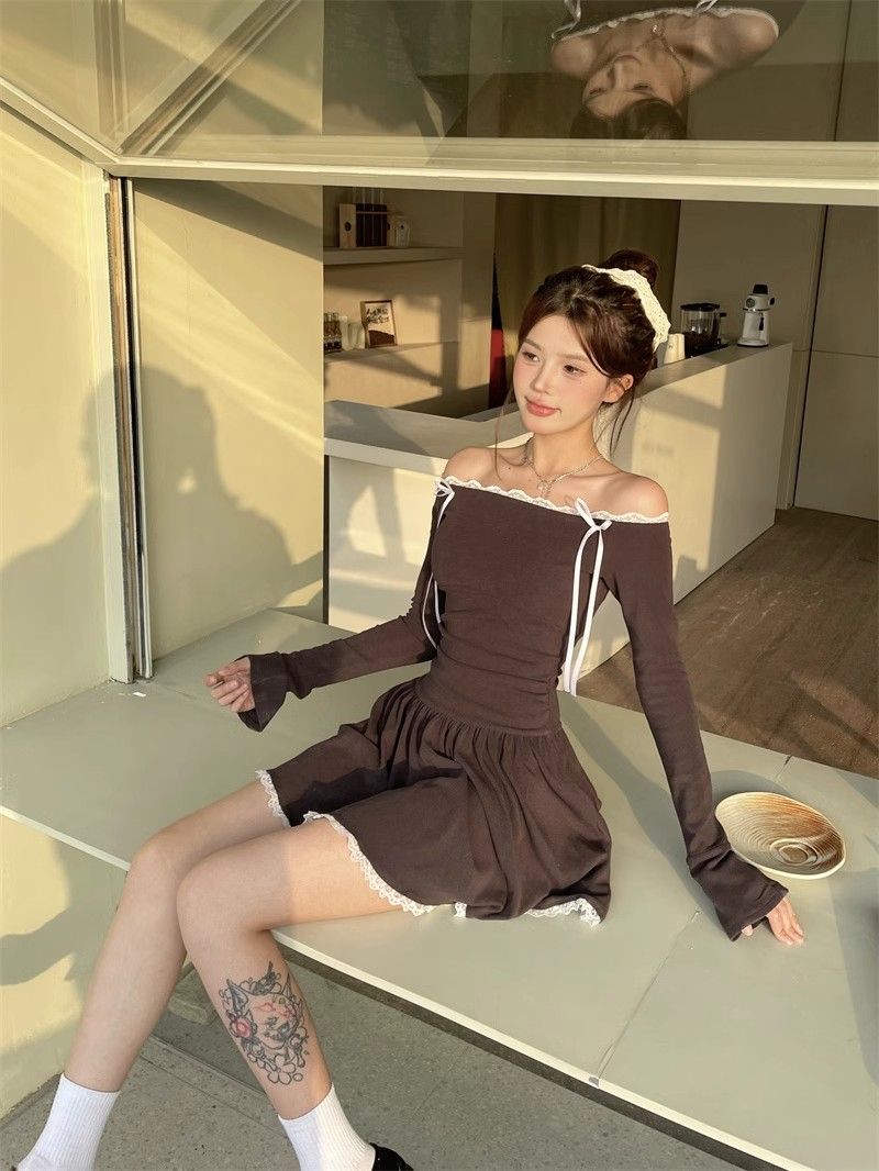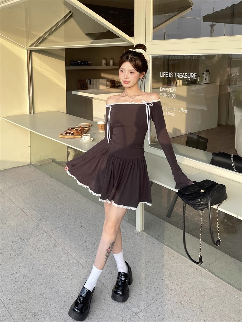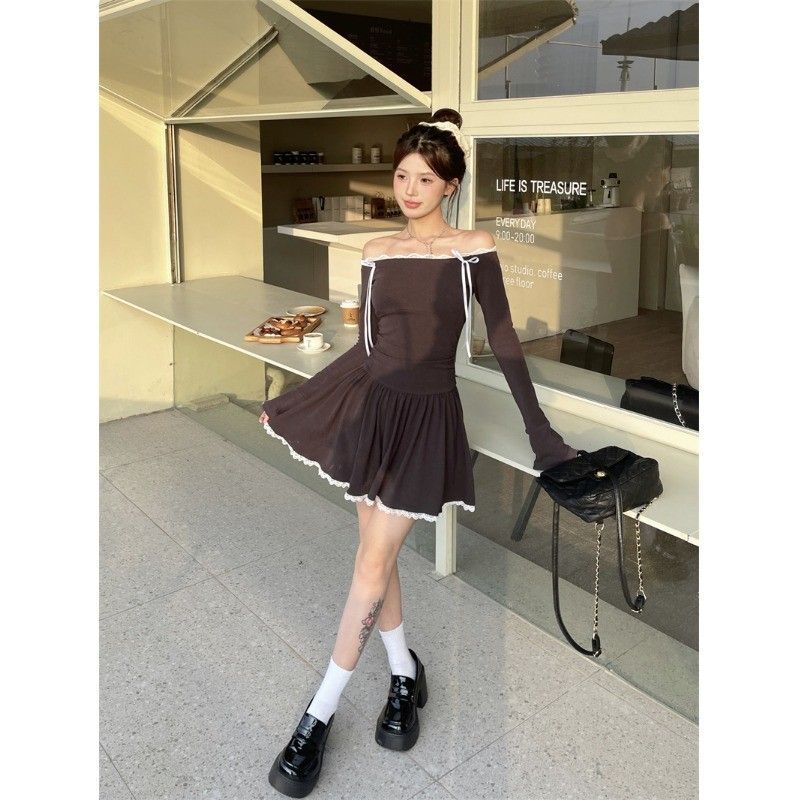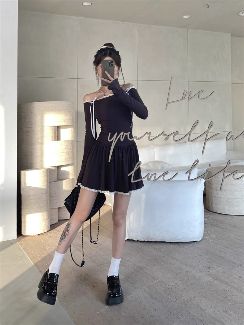 • Ballet-inspired off-shoulder dress for women, autumn style, bow-tie waist-cinching A-line skirt, elegant and sophisticated short skirt.