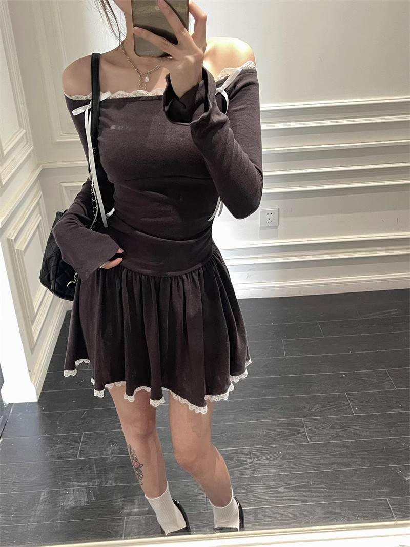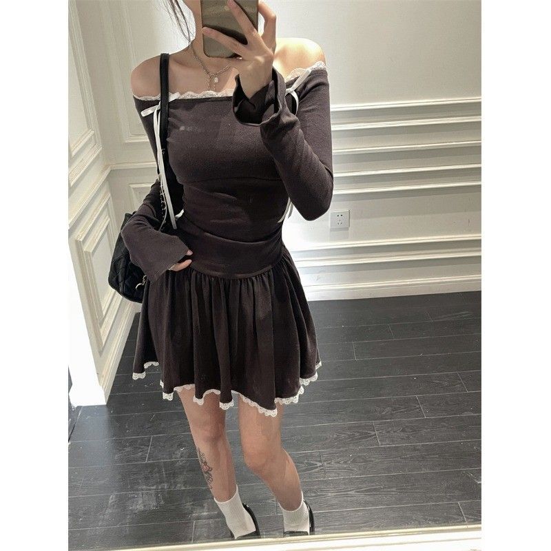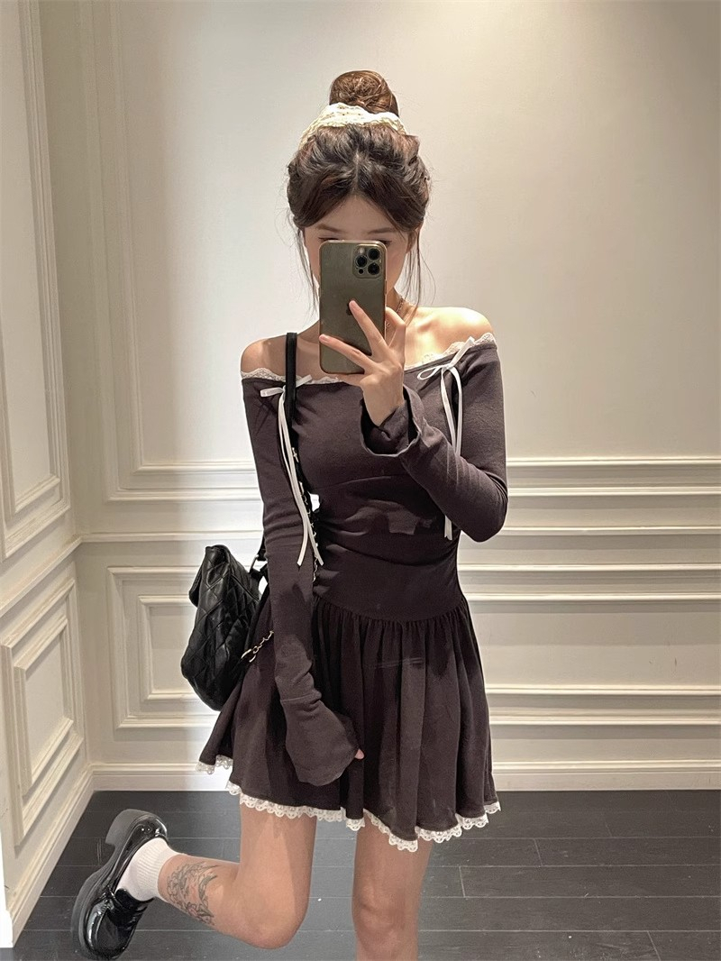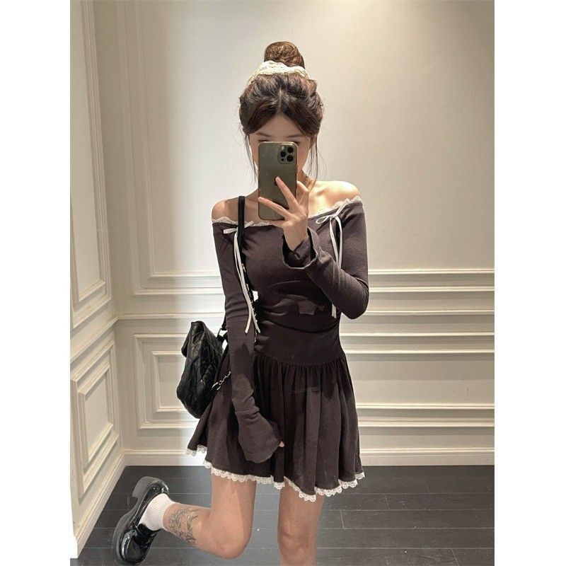 Ballet-inspired off-shoulder dress for women, autumn style, bow-tie waist-cinching A-line skirt, elegant and sophisticated short skirt.