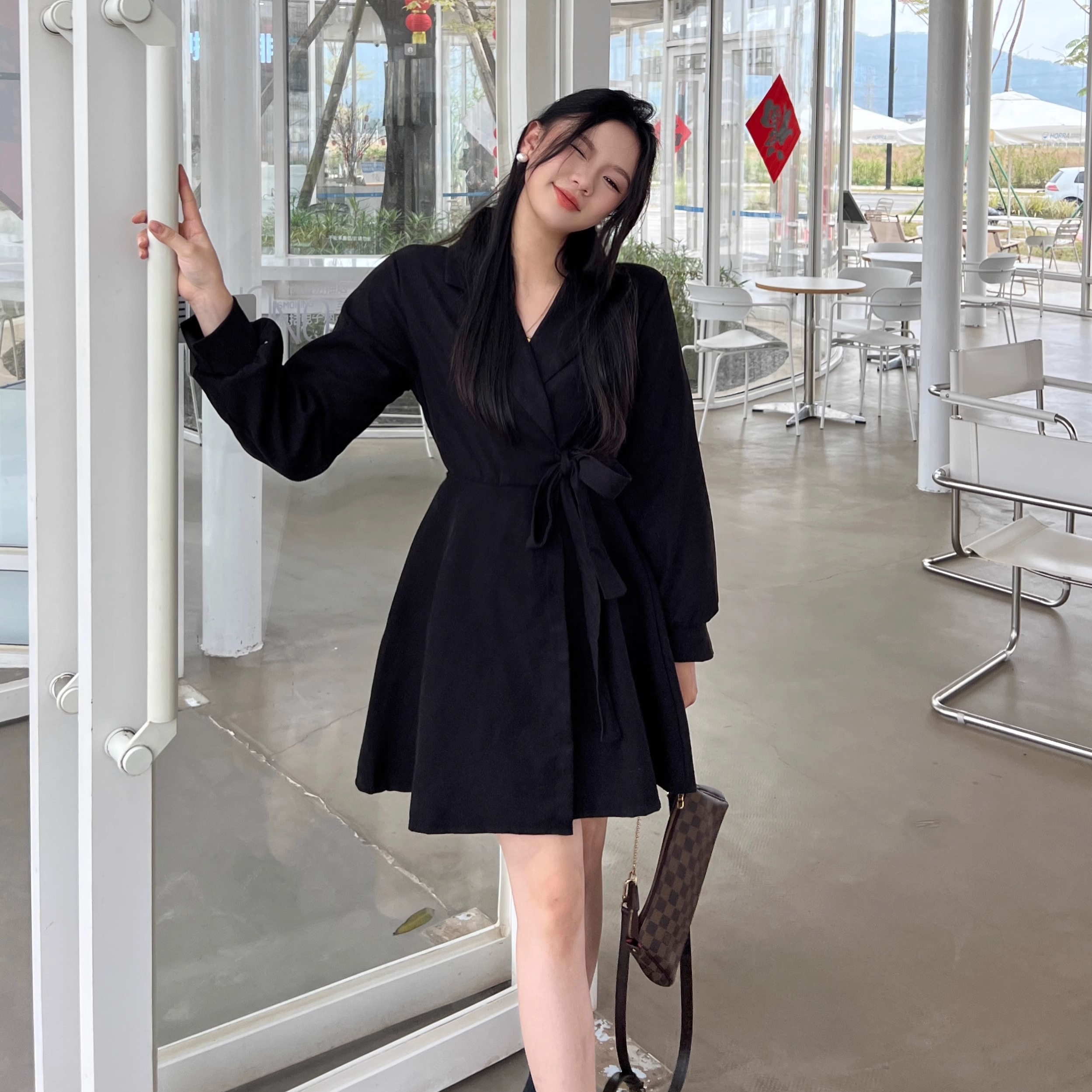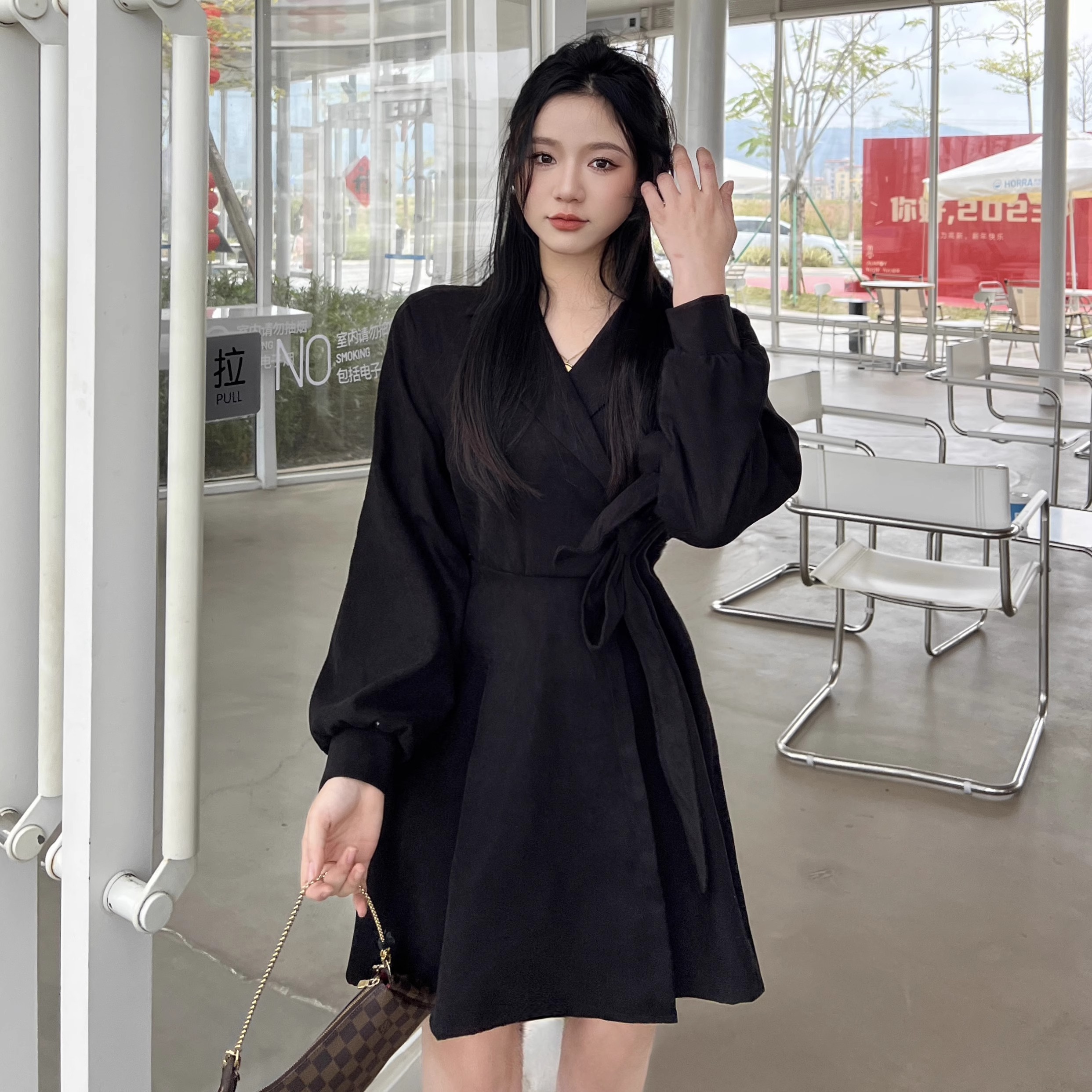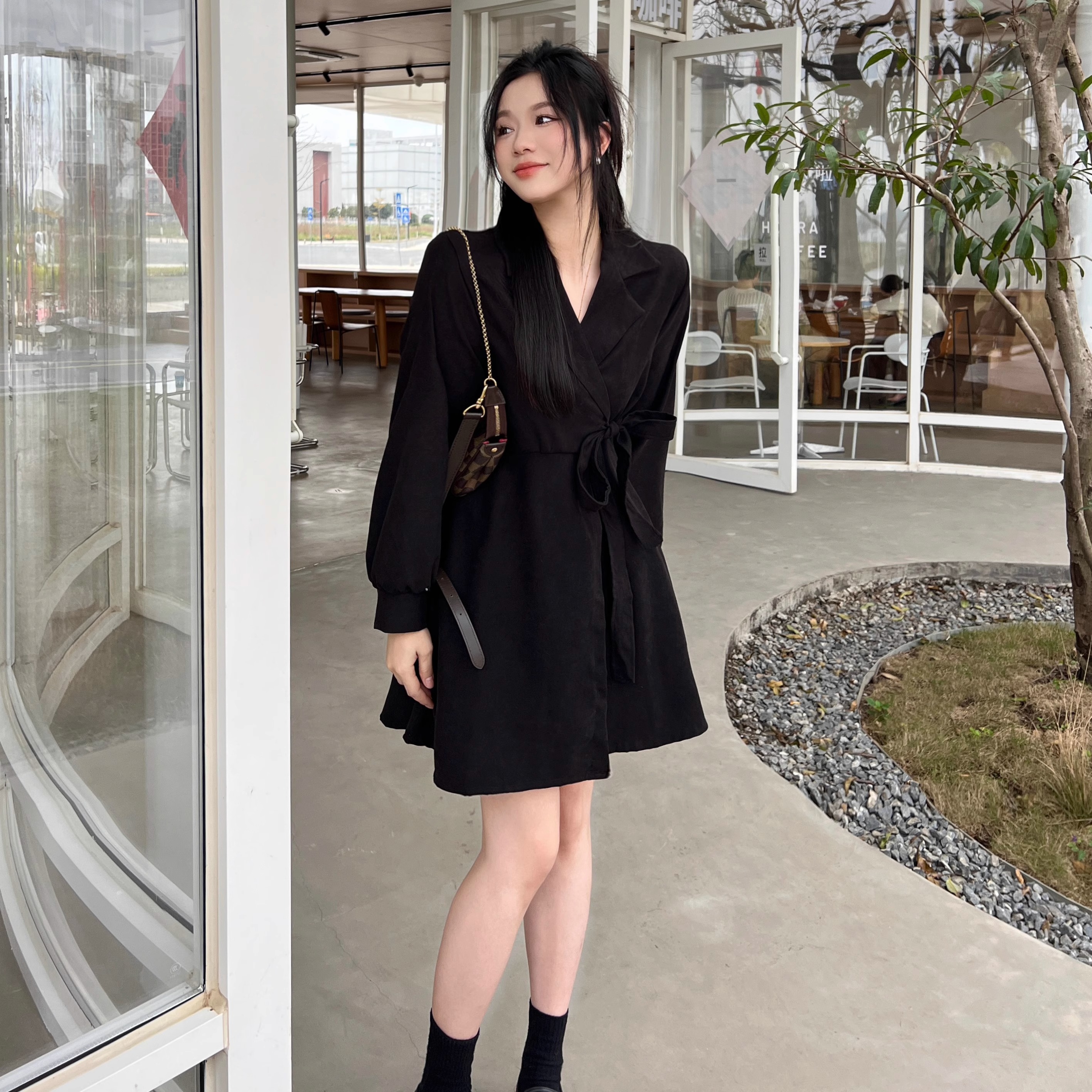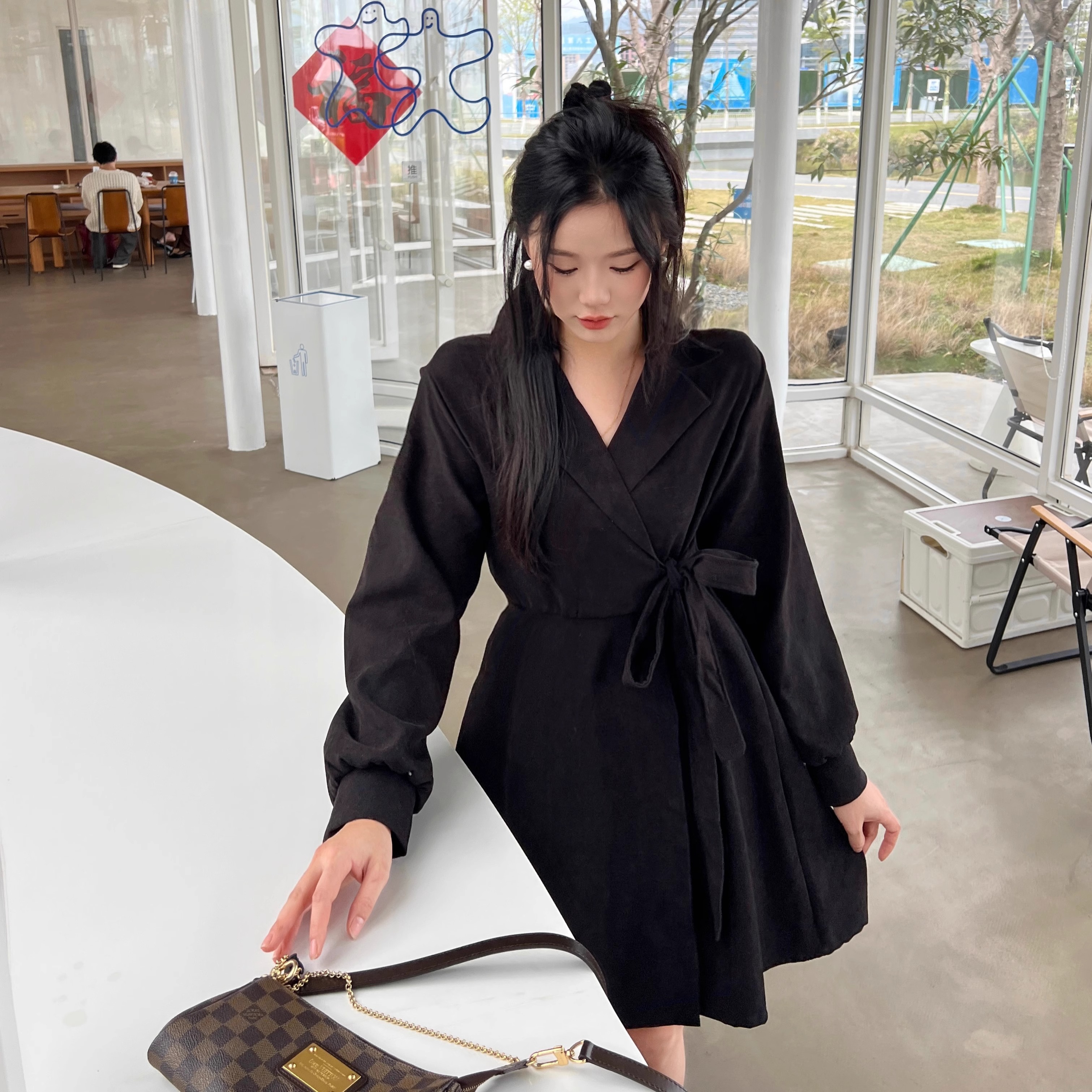 • French Hepburn-inspired corduroy black long-sleeved suit dress, sophisticated autumn/winter style, unique fitted waist short skirt