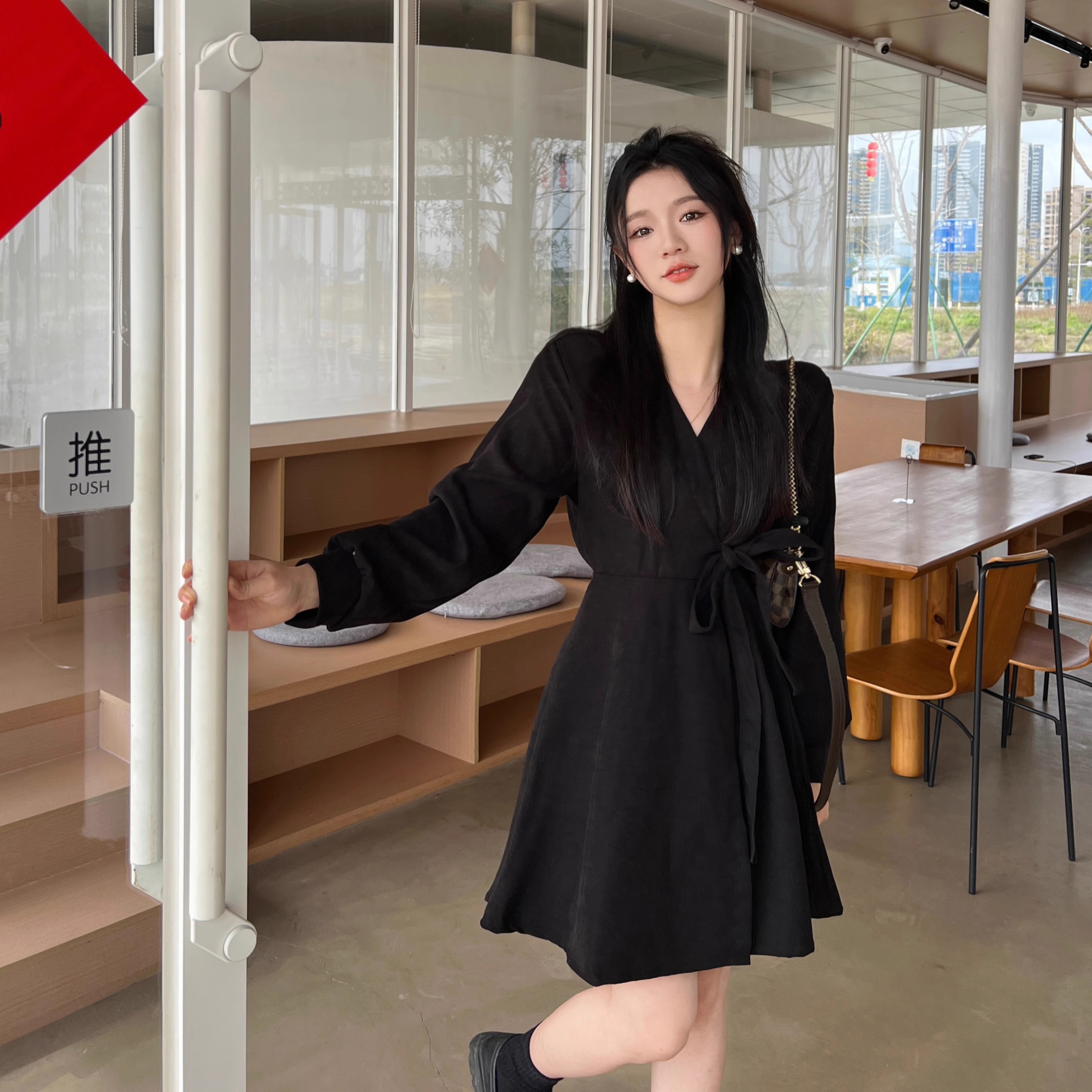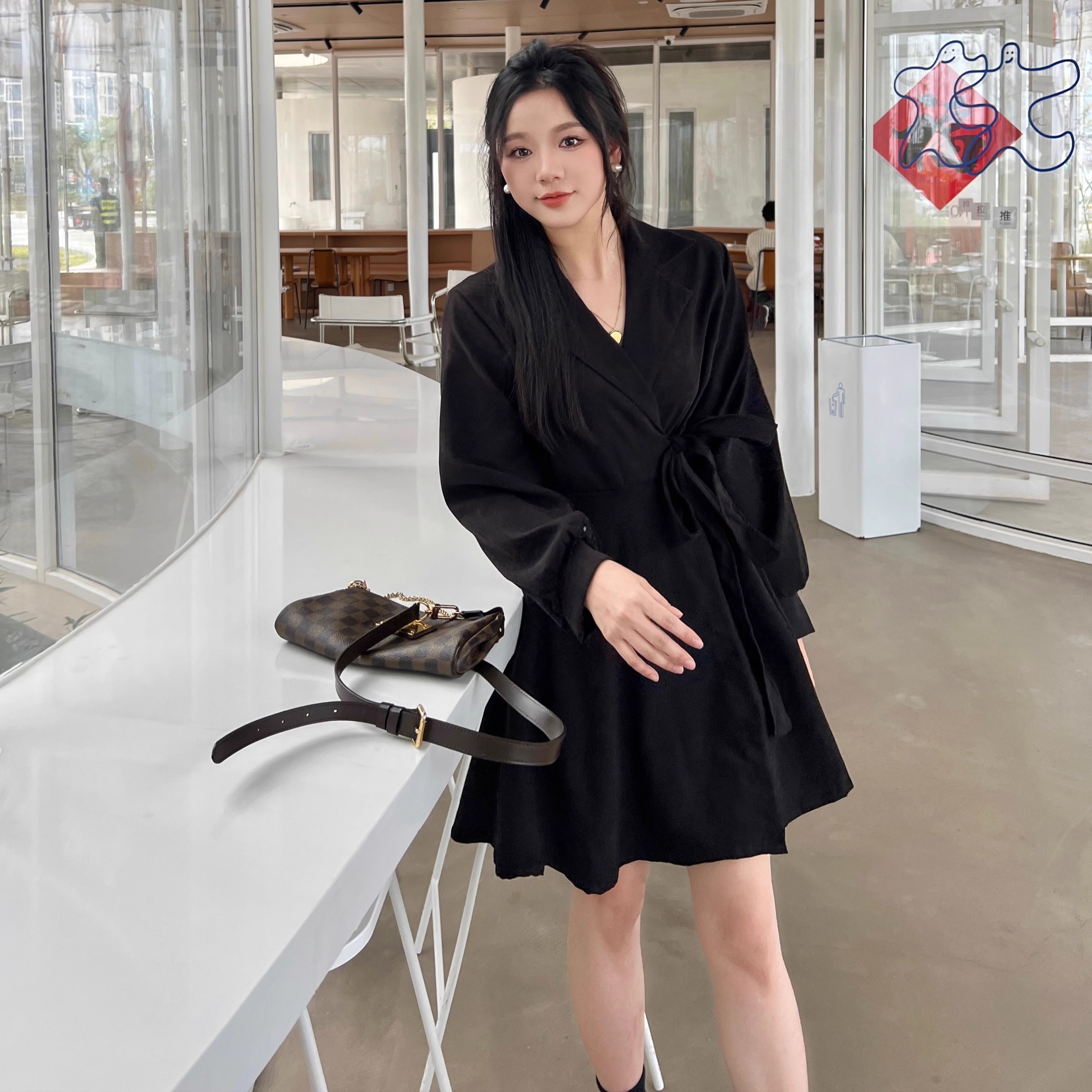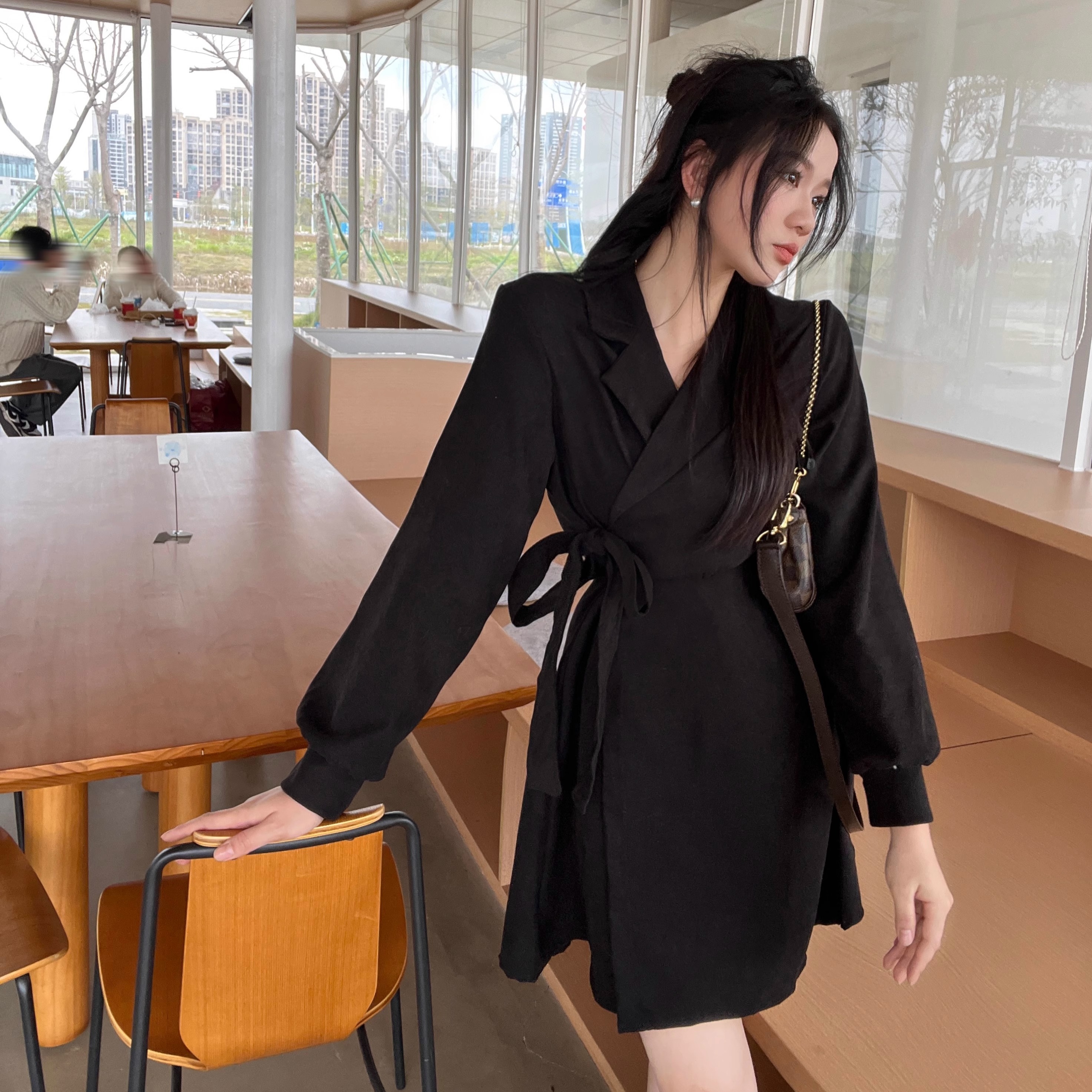 • French Hepburn-inspired corduroy black long-sleeved suit dress, sophisticated autumn/winter style, unique fitted waist short skirt