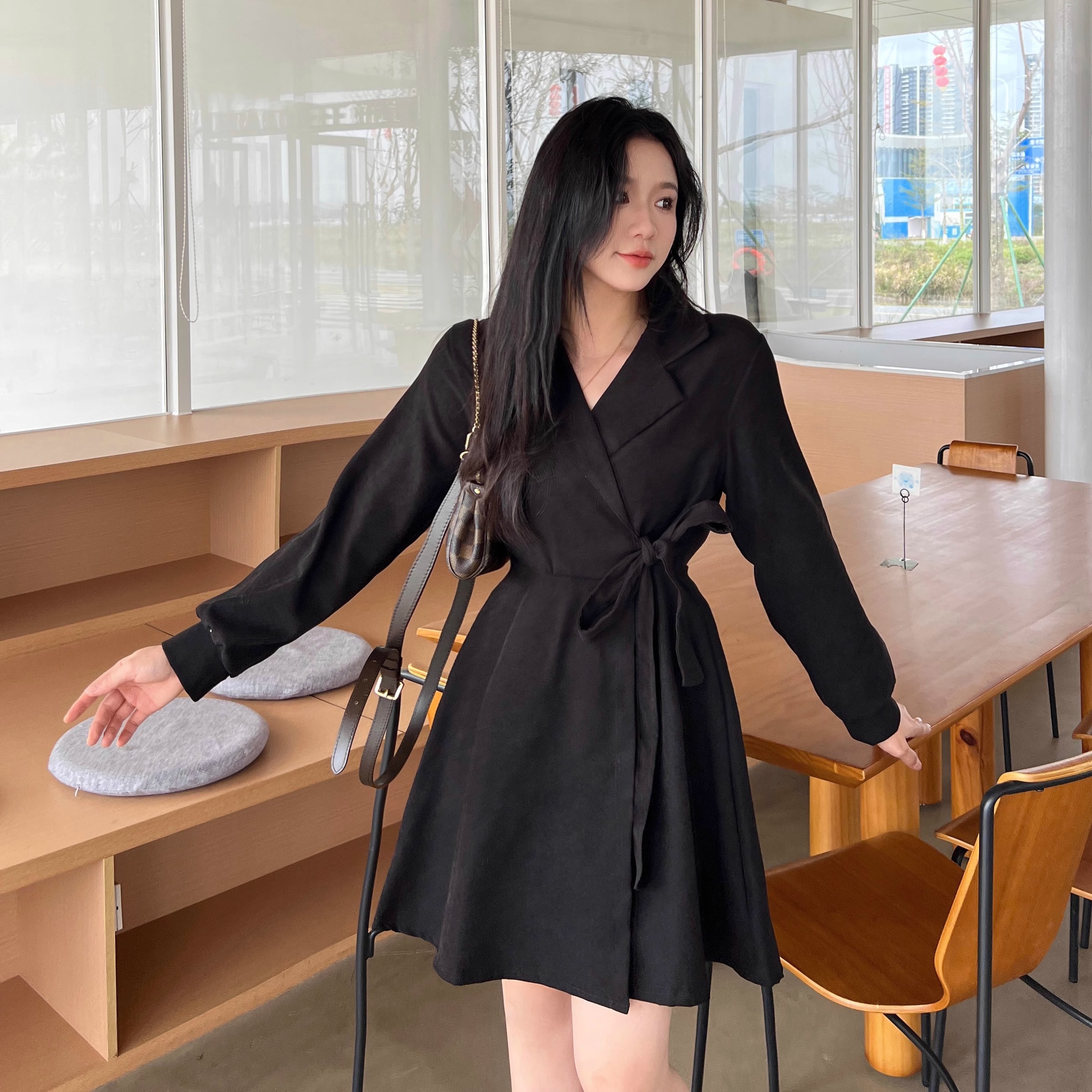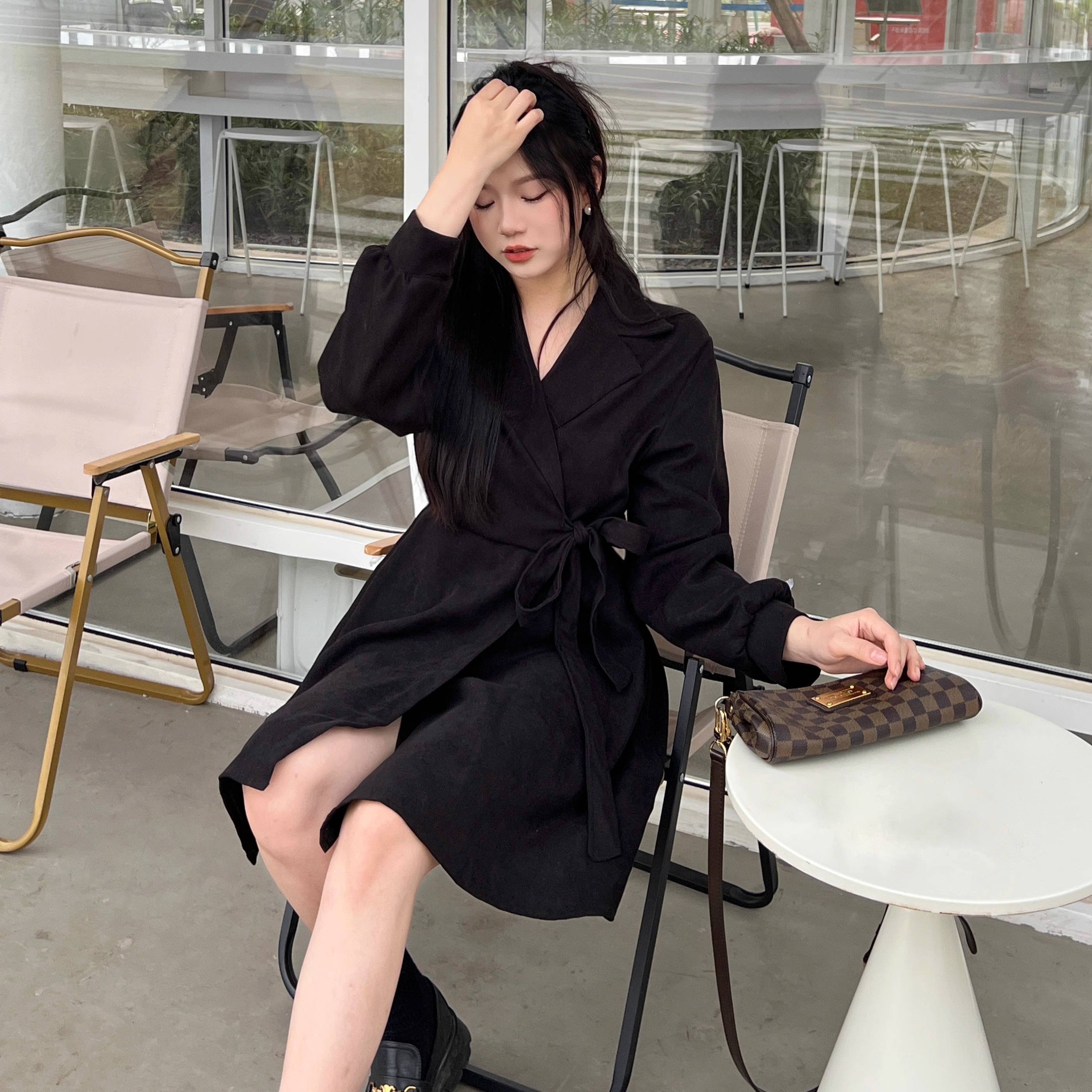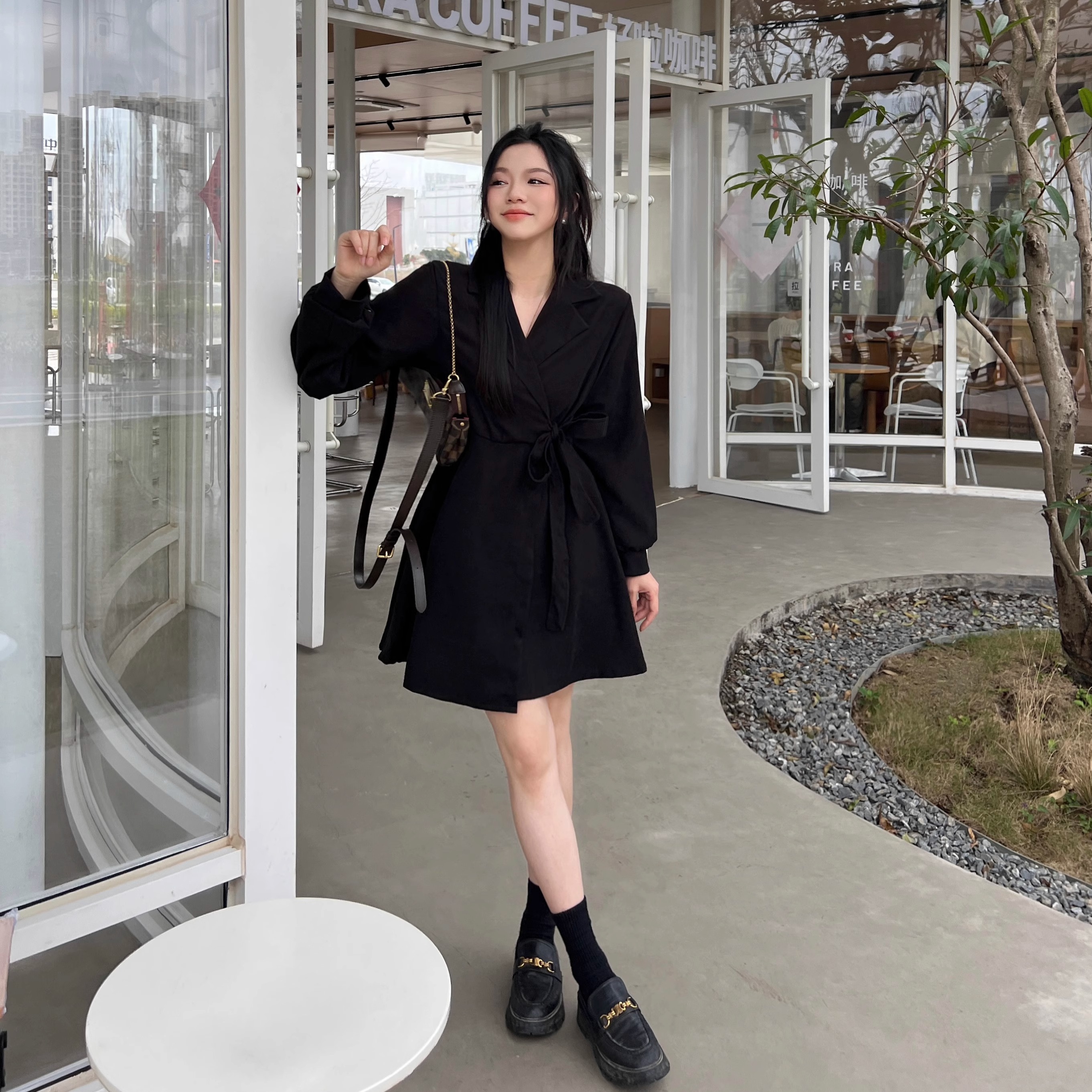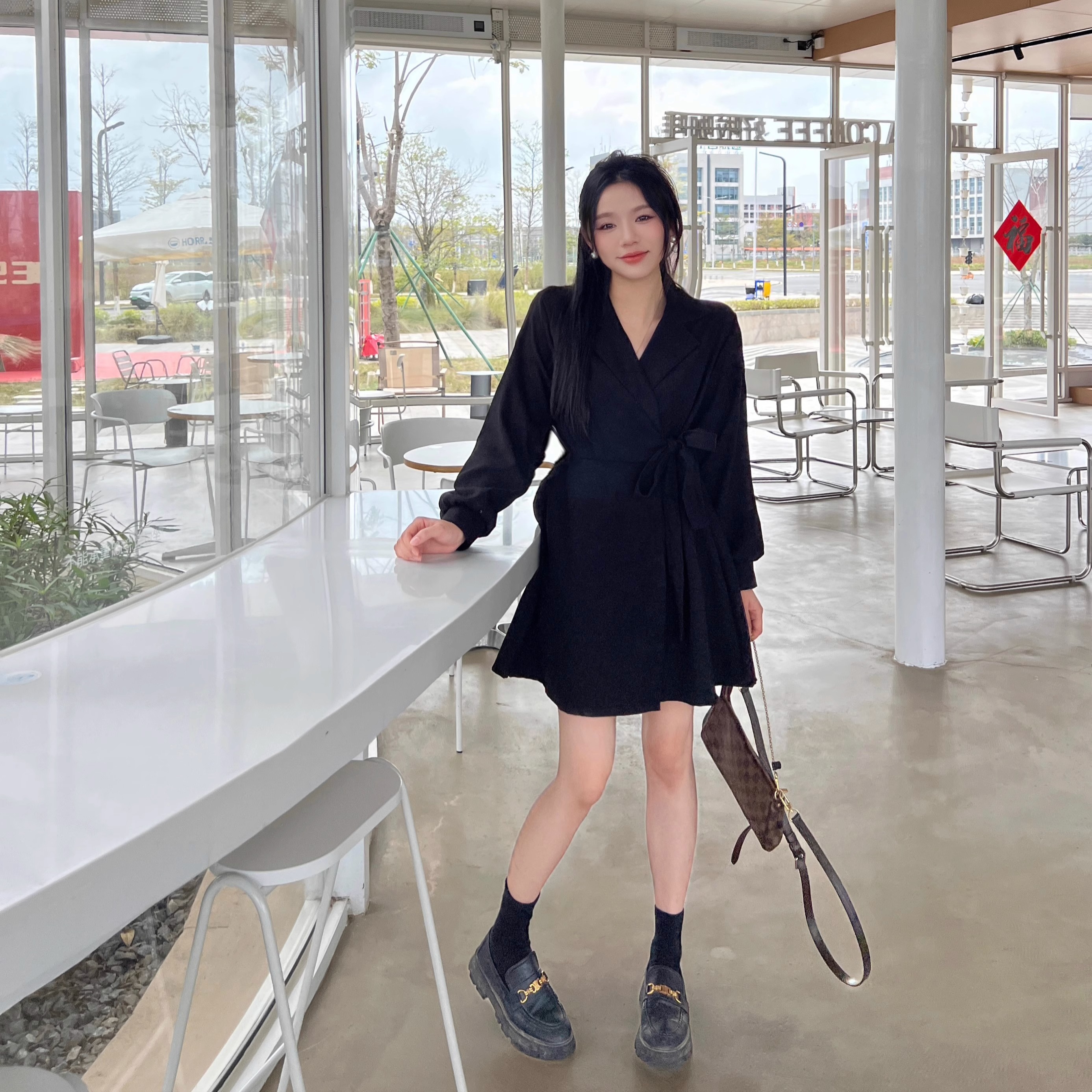 • French Hepburn-inspired corduroy black long-sleeved suit dress, sophisticated autumn/winter style, unique fitted waist short skirt