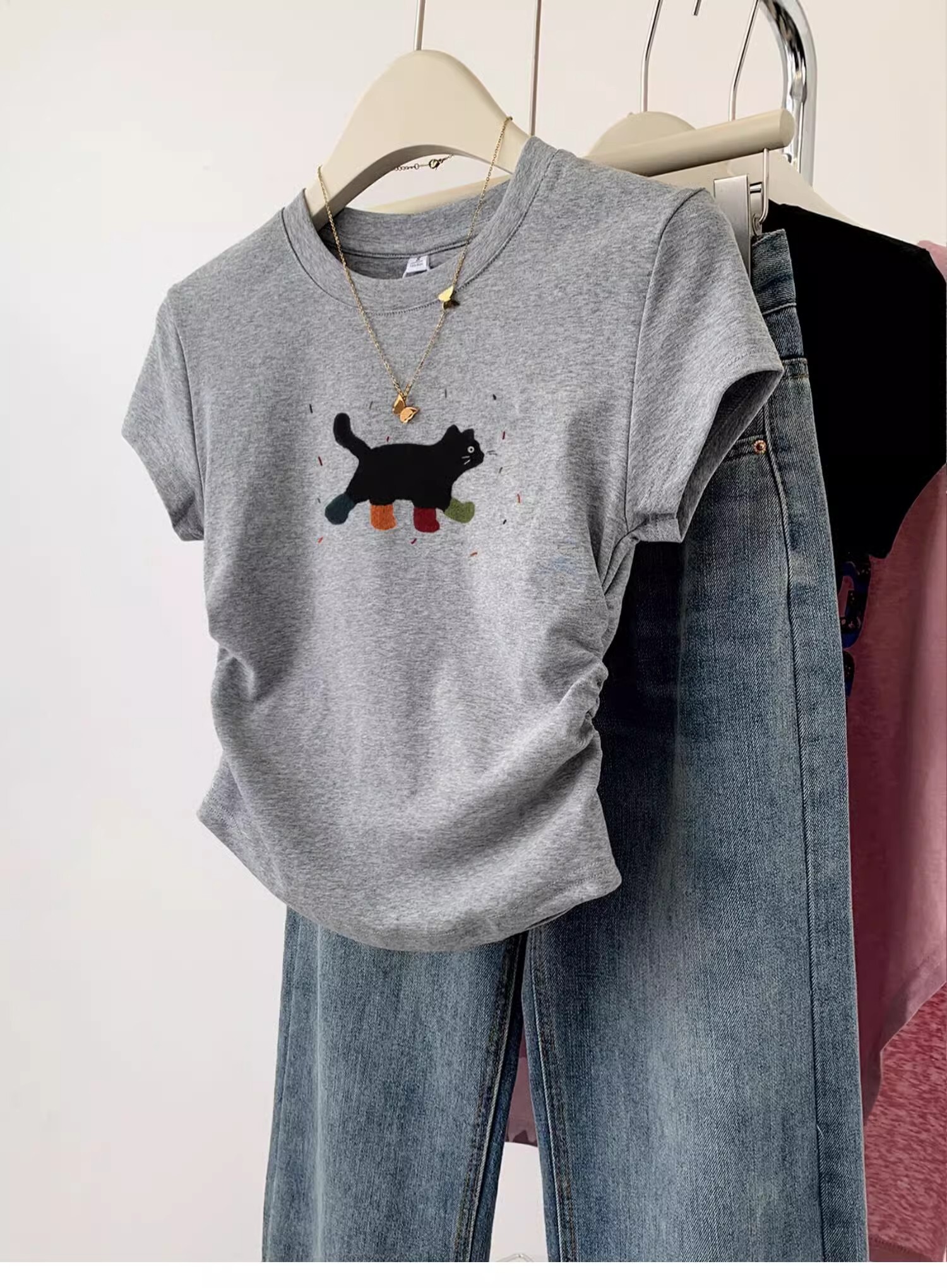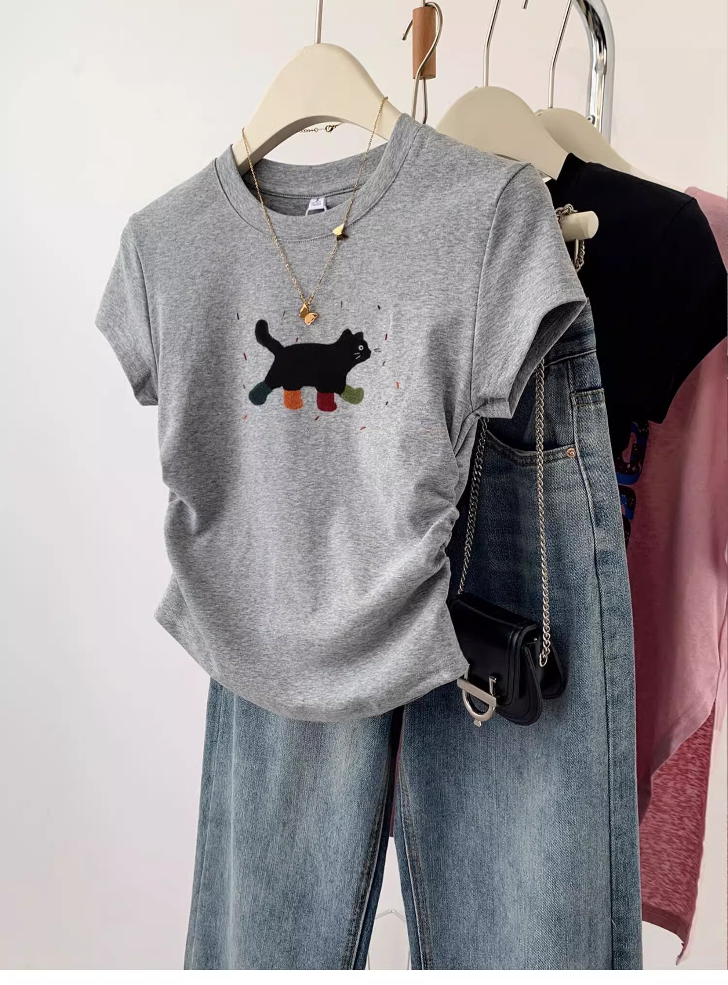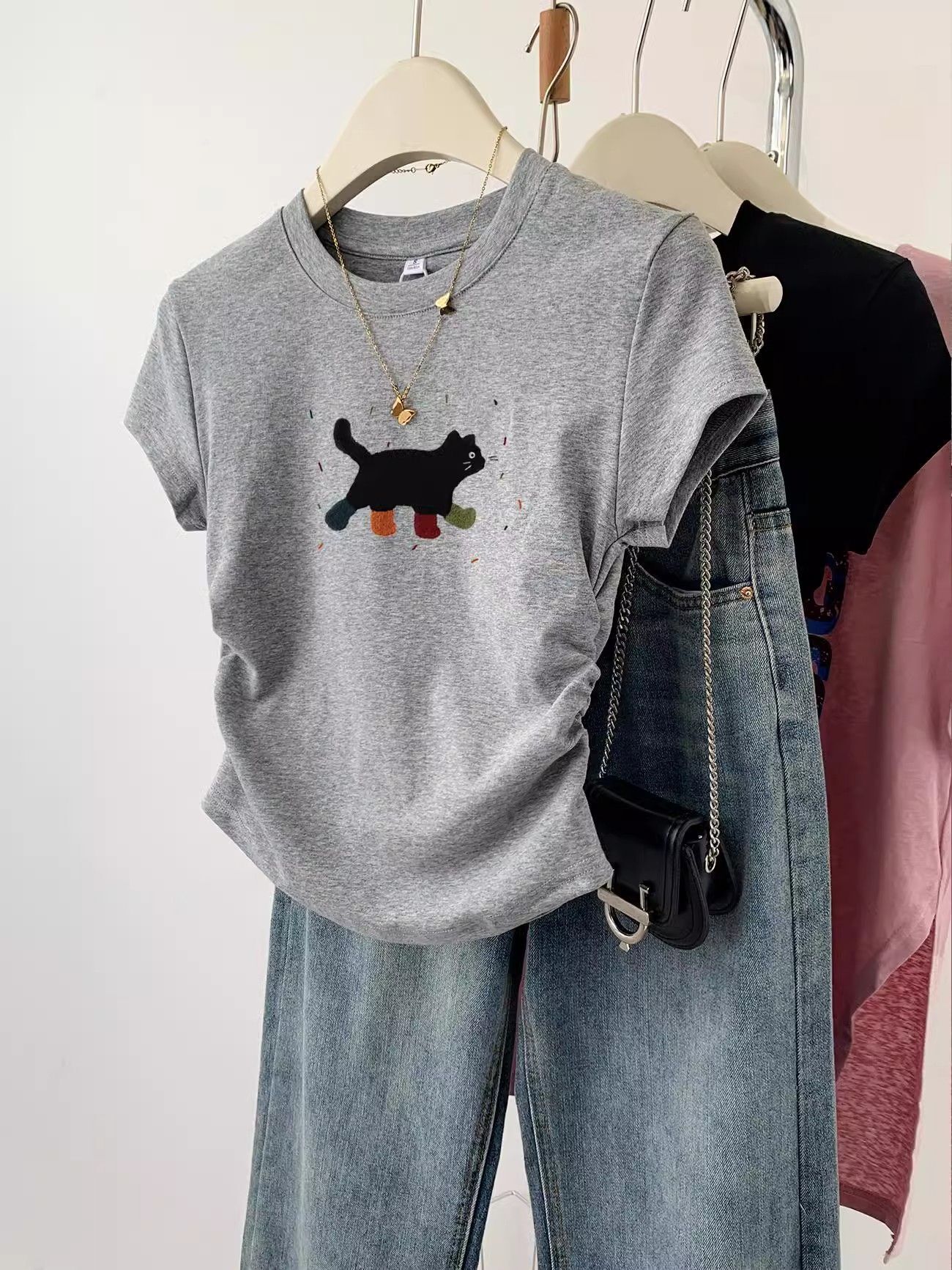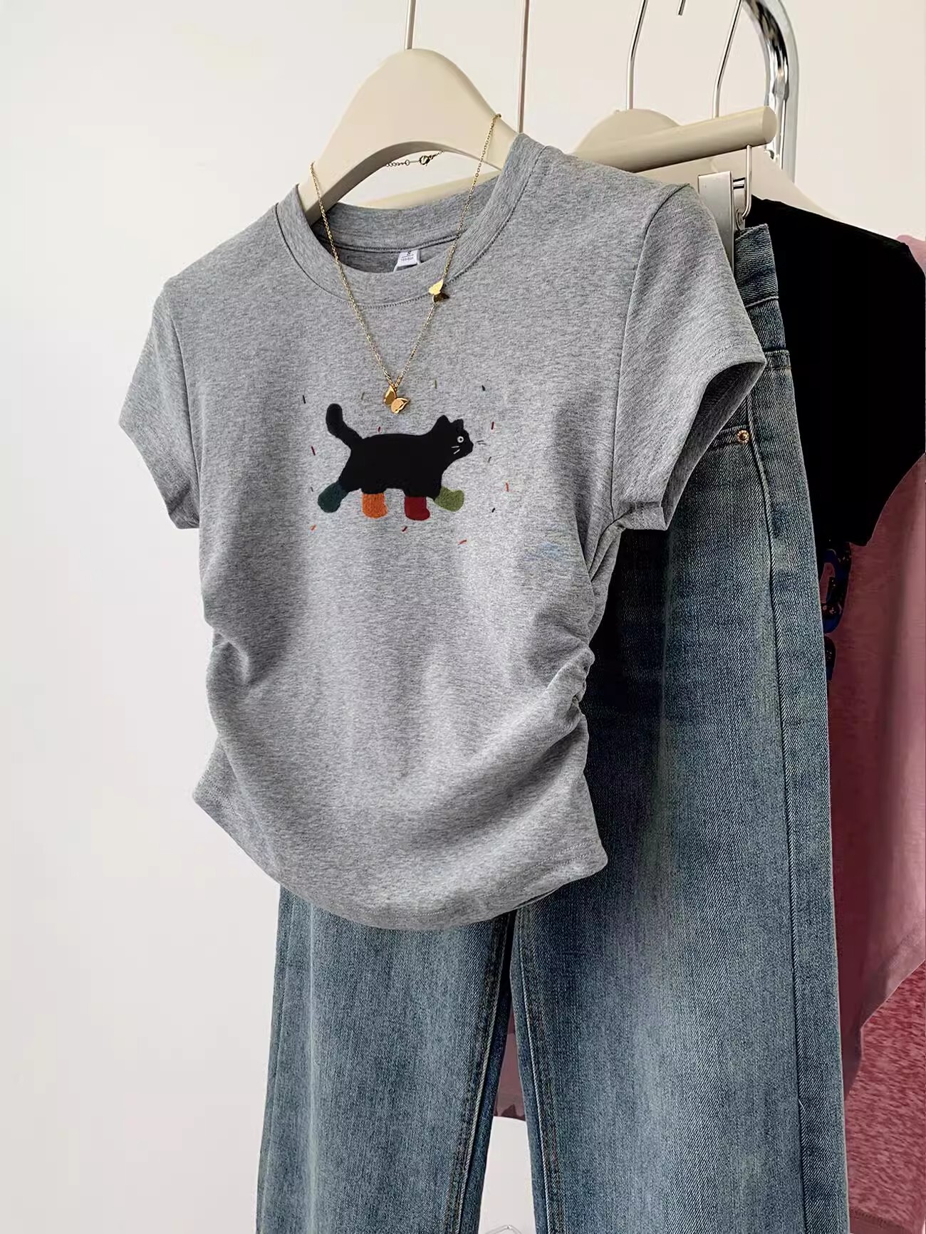 ![[1*1 Pure Cotton High Elasticity] Pleated Waist-Slimming Short-Sleeve T-Shirt for Women, New Summer Style, Slim Fit T-Shirt](images/zmwp6962_03.jpg)