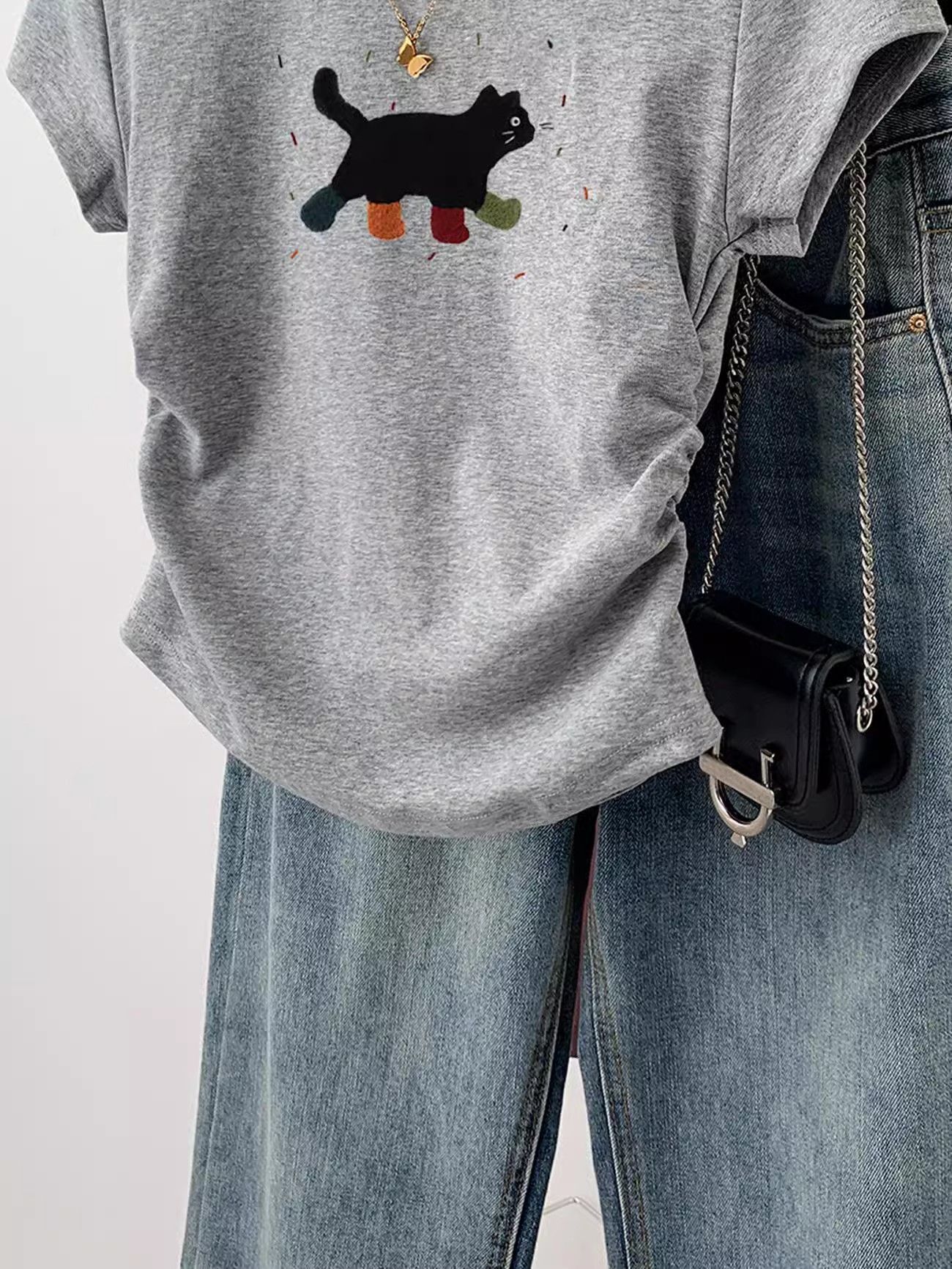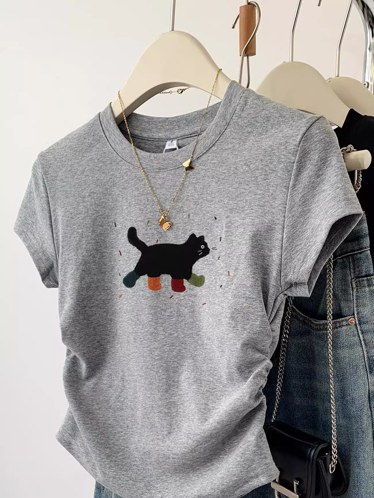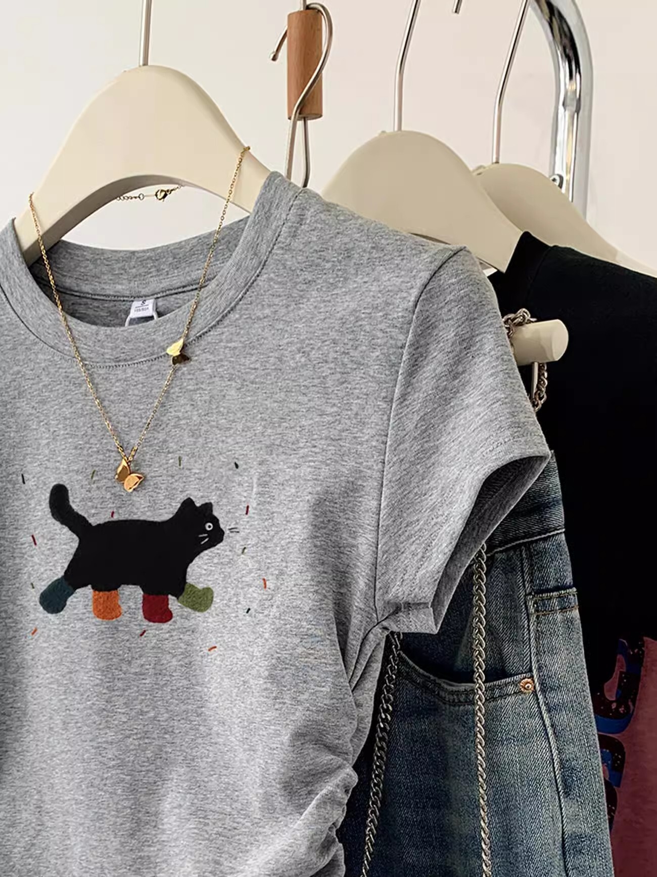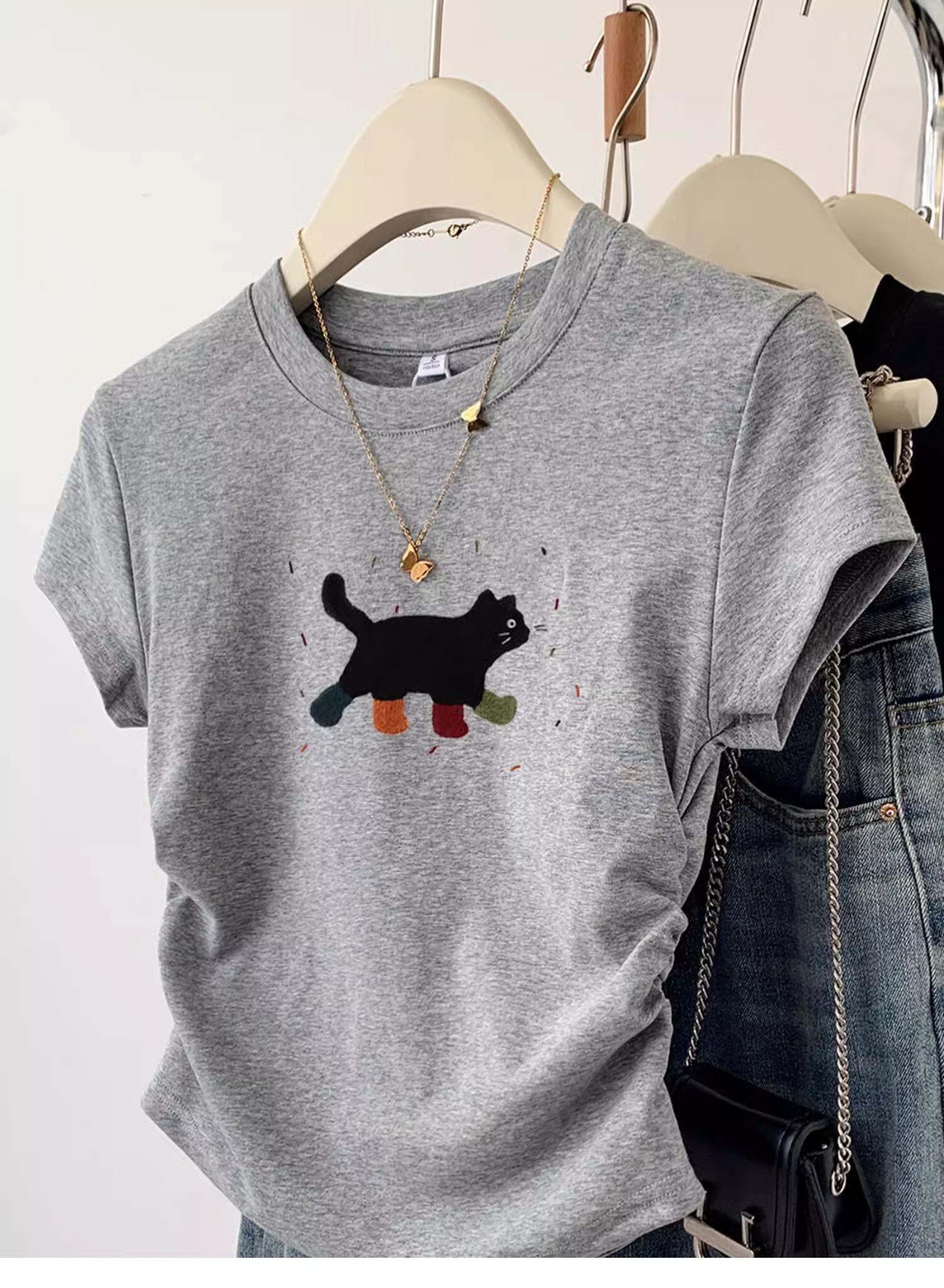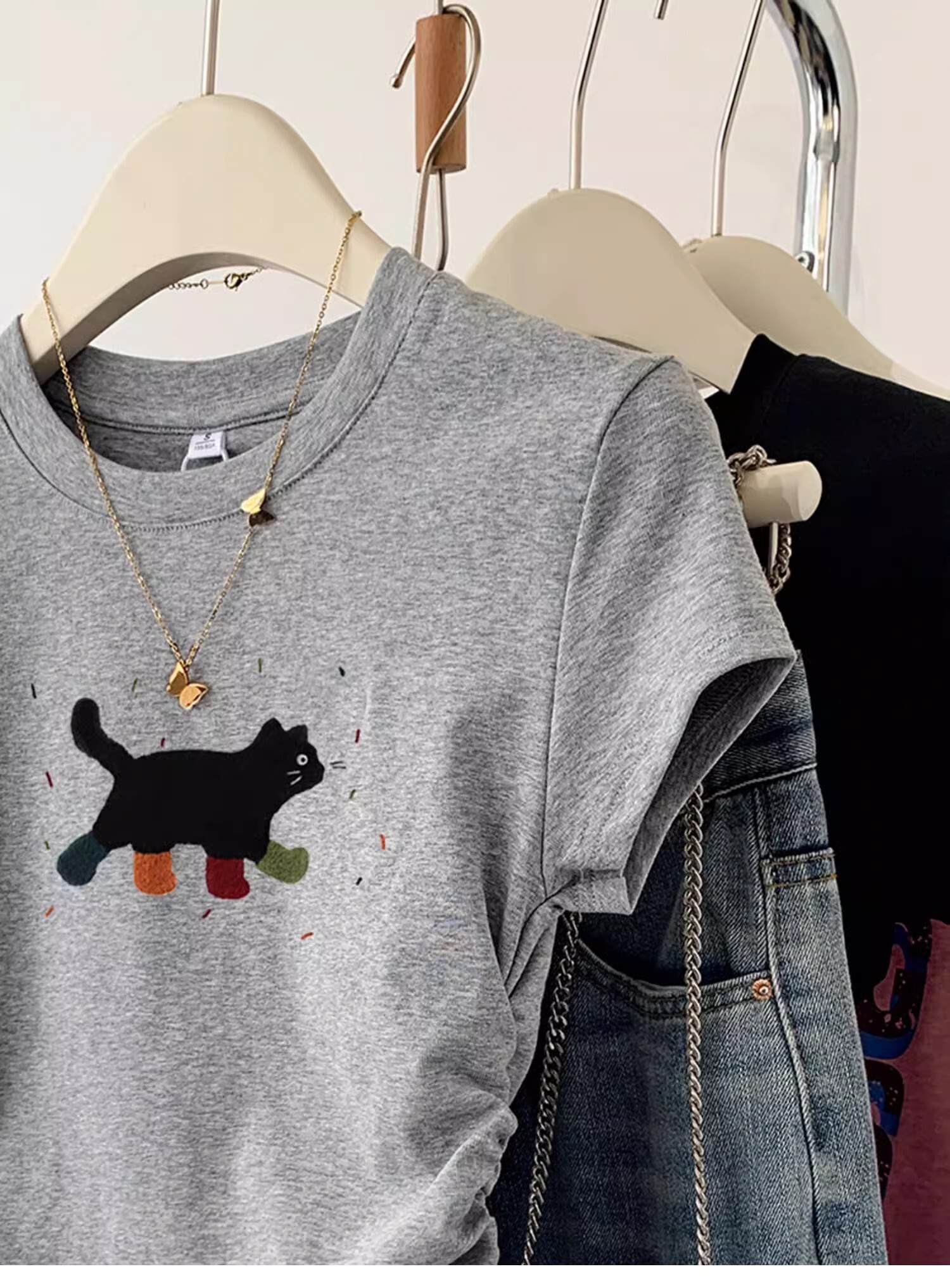![[1*1 Pure Cotton High Elasticity] Pleated Waist-Slimming Short-Sleeve T-Shirt for Women, New Summer Style, Slim Fit T-Shirt](images/zmwp6962_03.jpg)