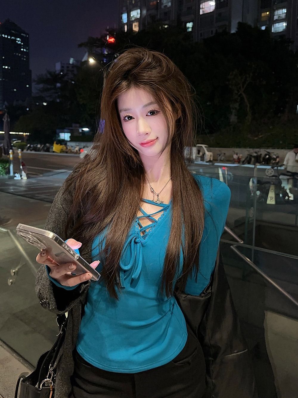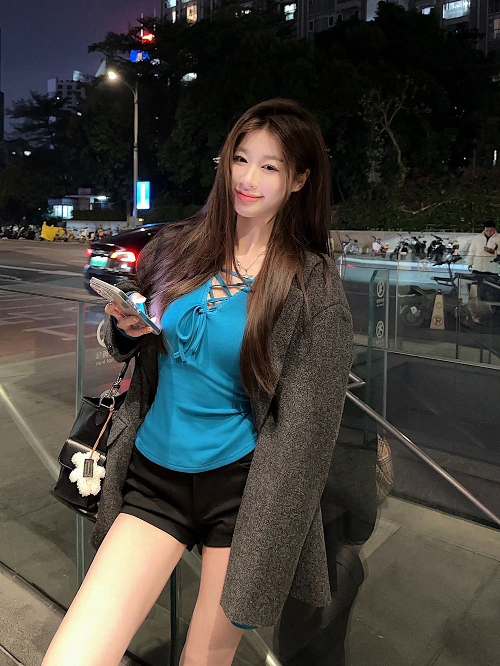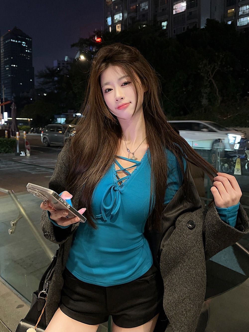 ![MR [Original Version] Pure and Desire Style Tie-up V-neck Knit Sweater for Women, Slim Fit, Blue Brushed Textured Top](images/mrwg/mrwg1055e_01.jpg)