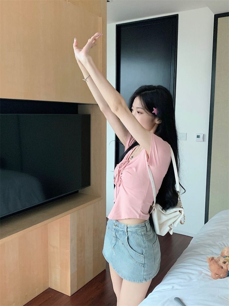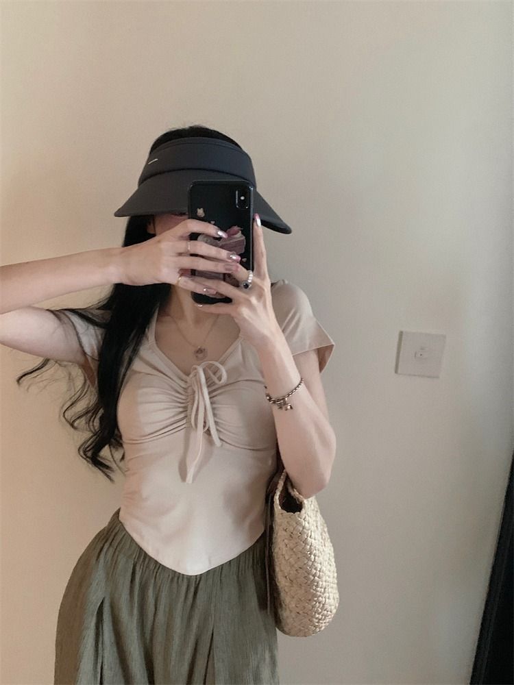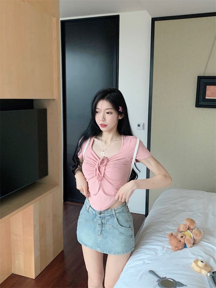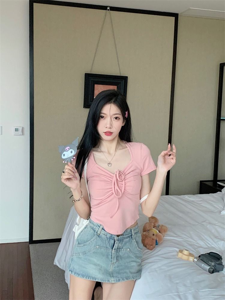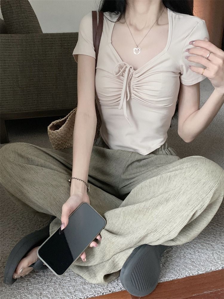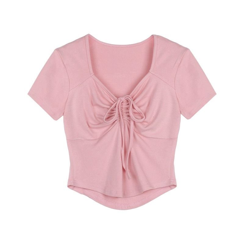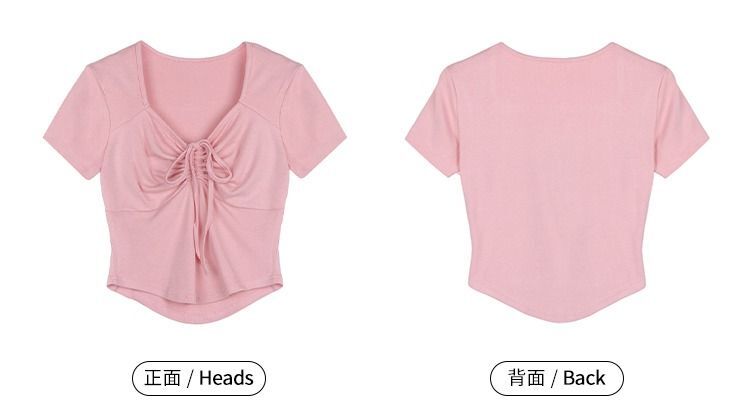 ![[In Stock] Sweet and Spicy Slim Fit Short-Sleeve T-Shirt for Women, Summer Style, Unique Design, Square Neck, Drawstring, Straight Shoulder, Short Fit](images/mrwg/mrwg222e_03.jpg)