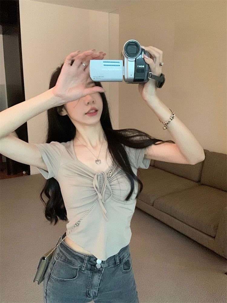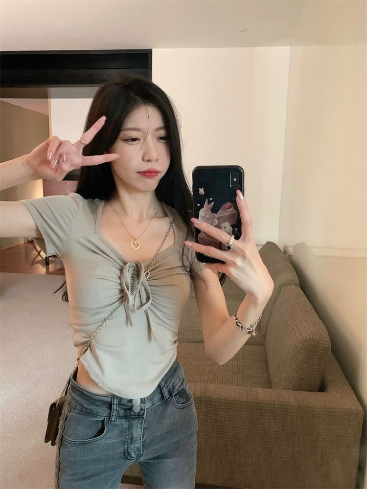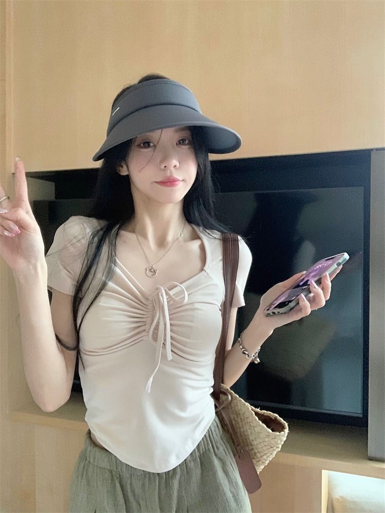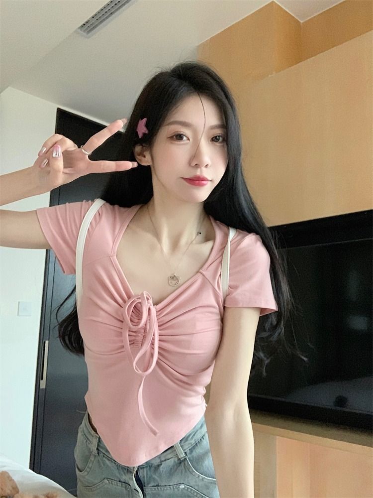 ![[In Stock] Sweet and Spicy Slim Fit Short-Sleeve T-Shirt for Women, Summer Style, Unique Design, Square Neck, Drawstring, Straight Shoulder, Short Fit](images/mrwg/mrwg222e_01.jpg)