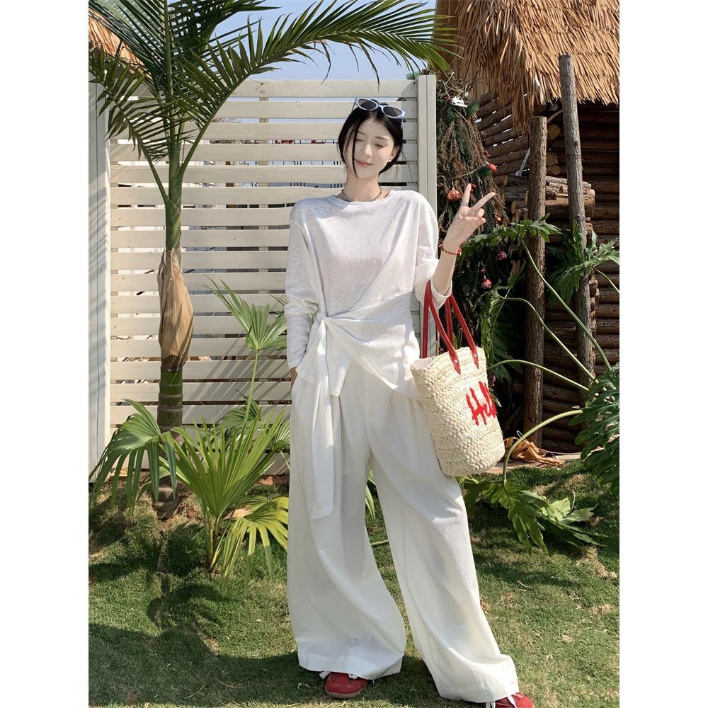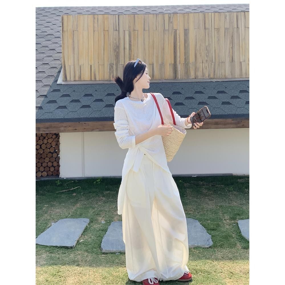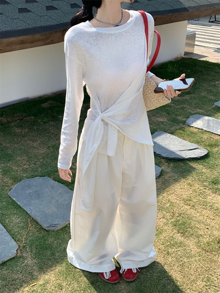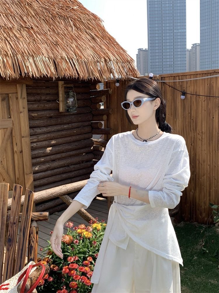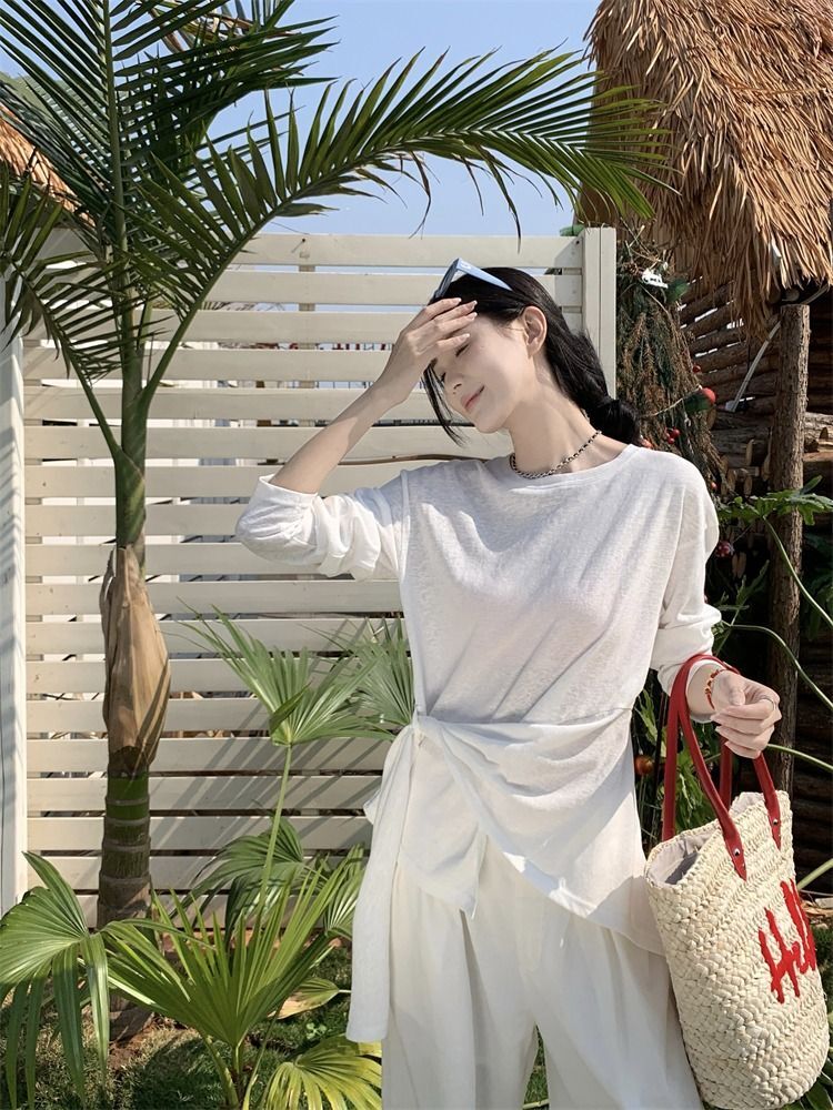 ![MR [High Quality] Relaxed, slightly sheer long-sleeved T-shirt for women, summer style, tie-waist, thin, loose fit, sun protection cover](images/mrwg/mrwg3017_02.jpg)