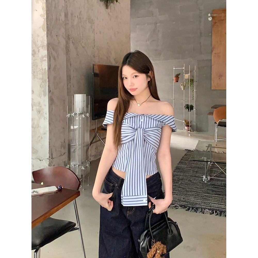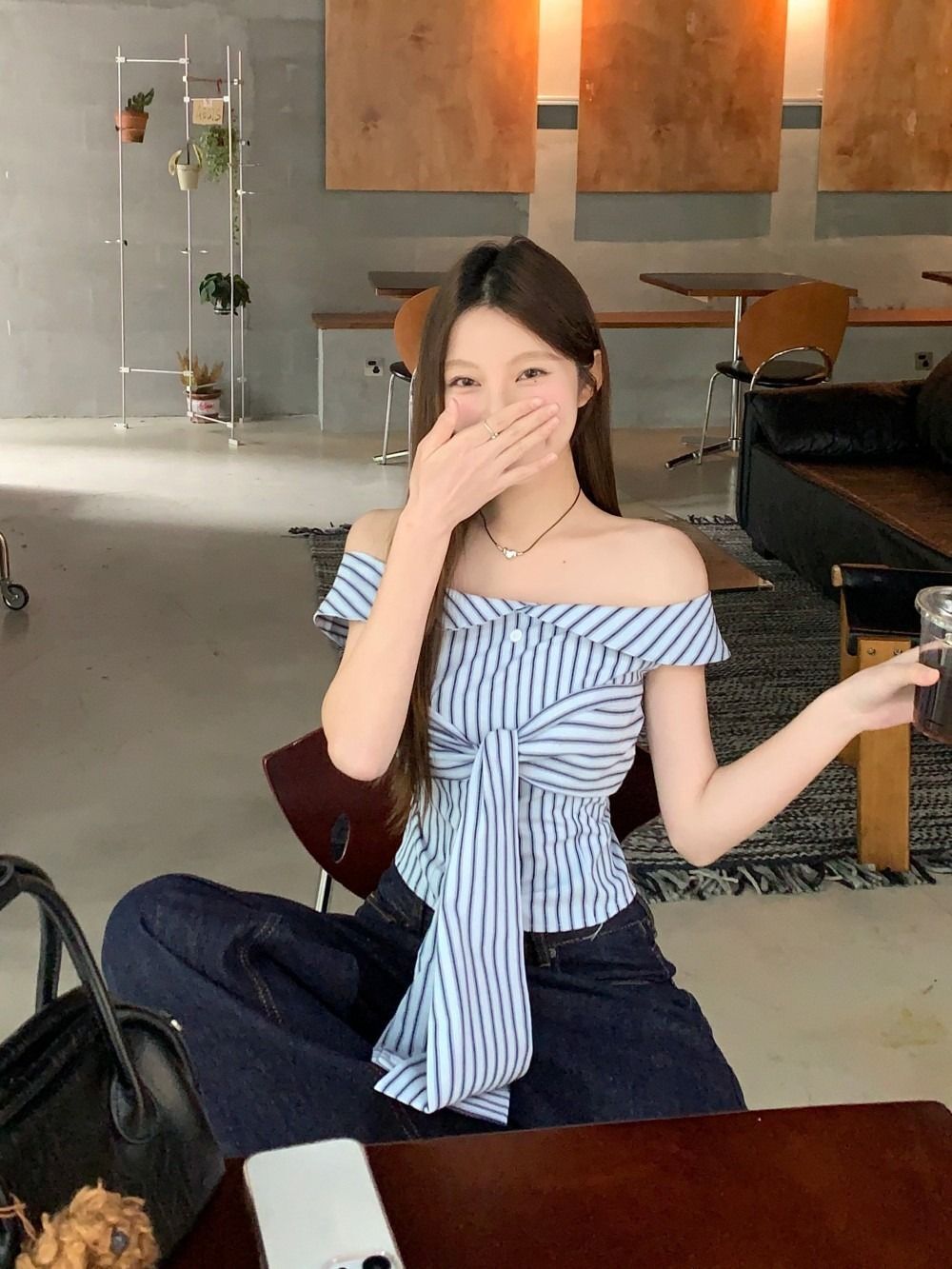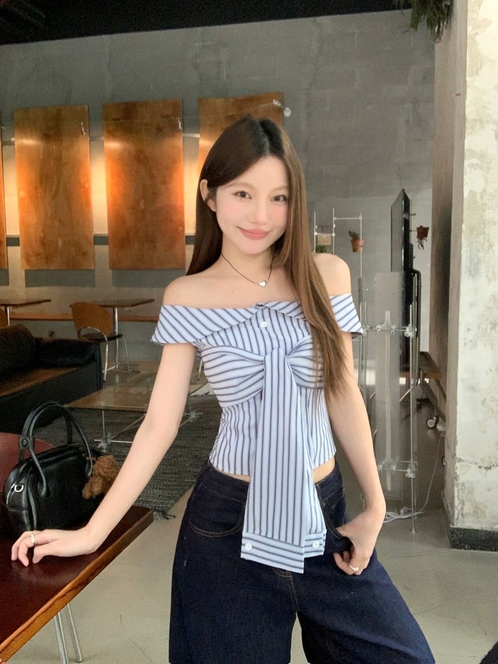 ![MR [Original Recipe] Sweet and Spicy Off-Shoulder Blue Striped Tie-Up Shirt, Summer Slim Fit, Versatile](images/mrwg/mrwg3020e_02.jpg)