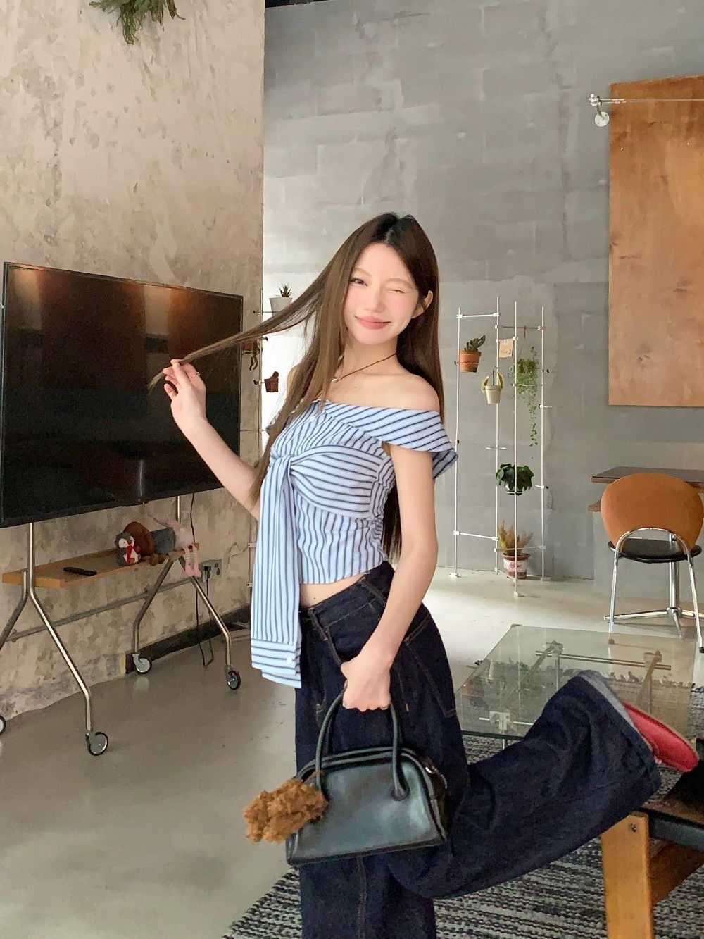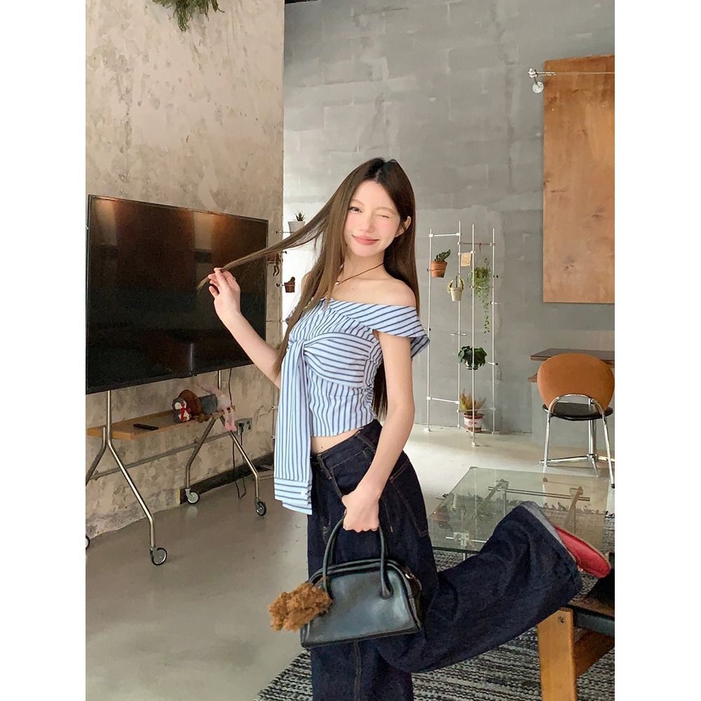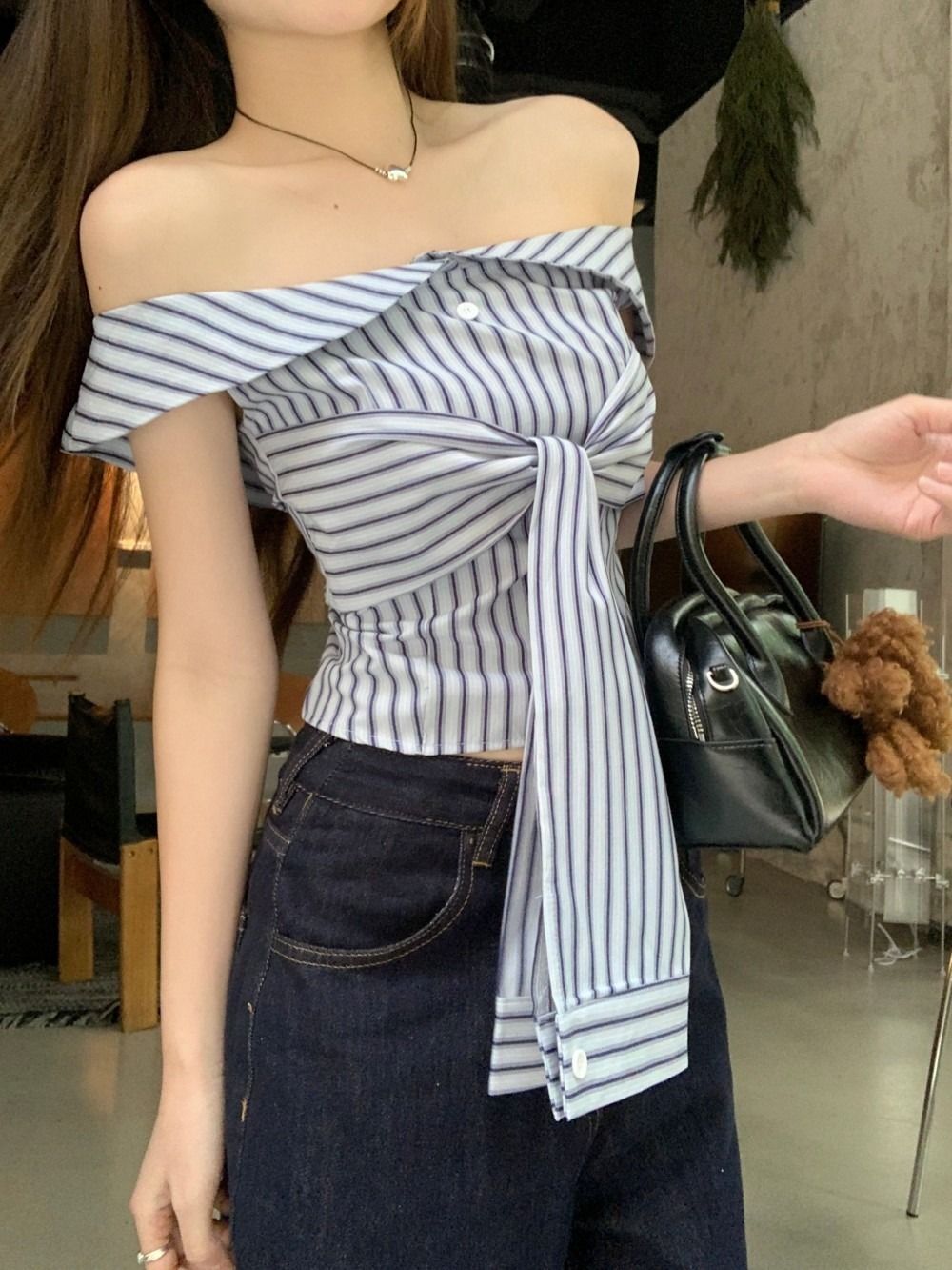 ![MR [Original Recipe] Sweet and Spicy Off-Shoulder Blue Striped Tie-Up Shirt, Summer Slim Fit, Versatile](images/mrwg/mrwg3020e_02.jpg)