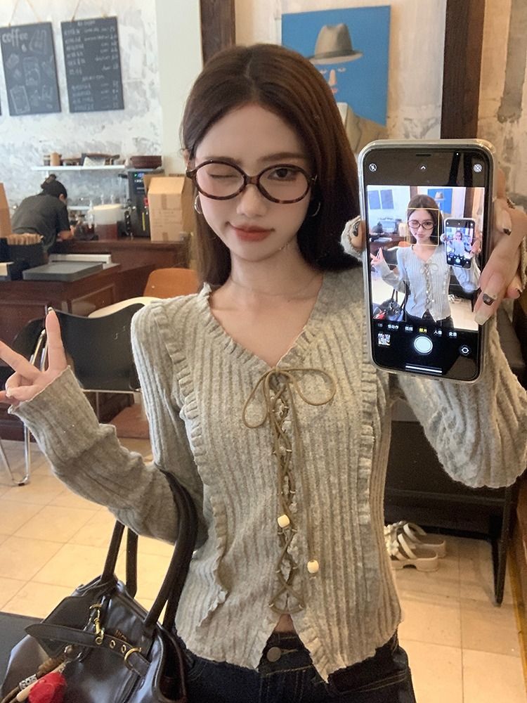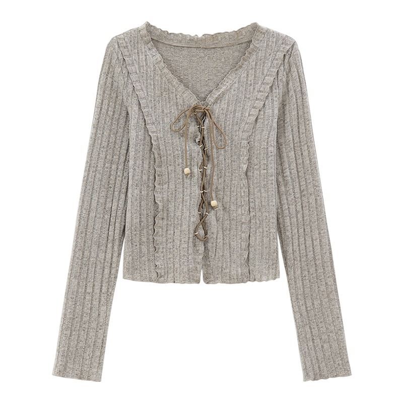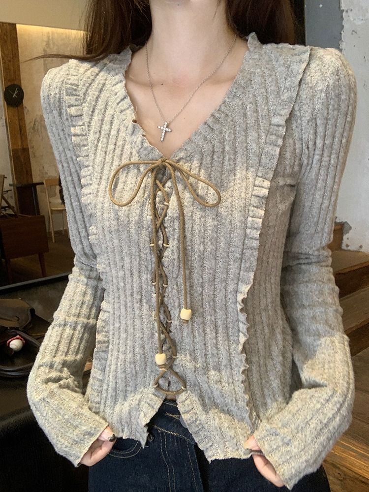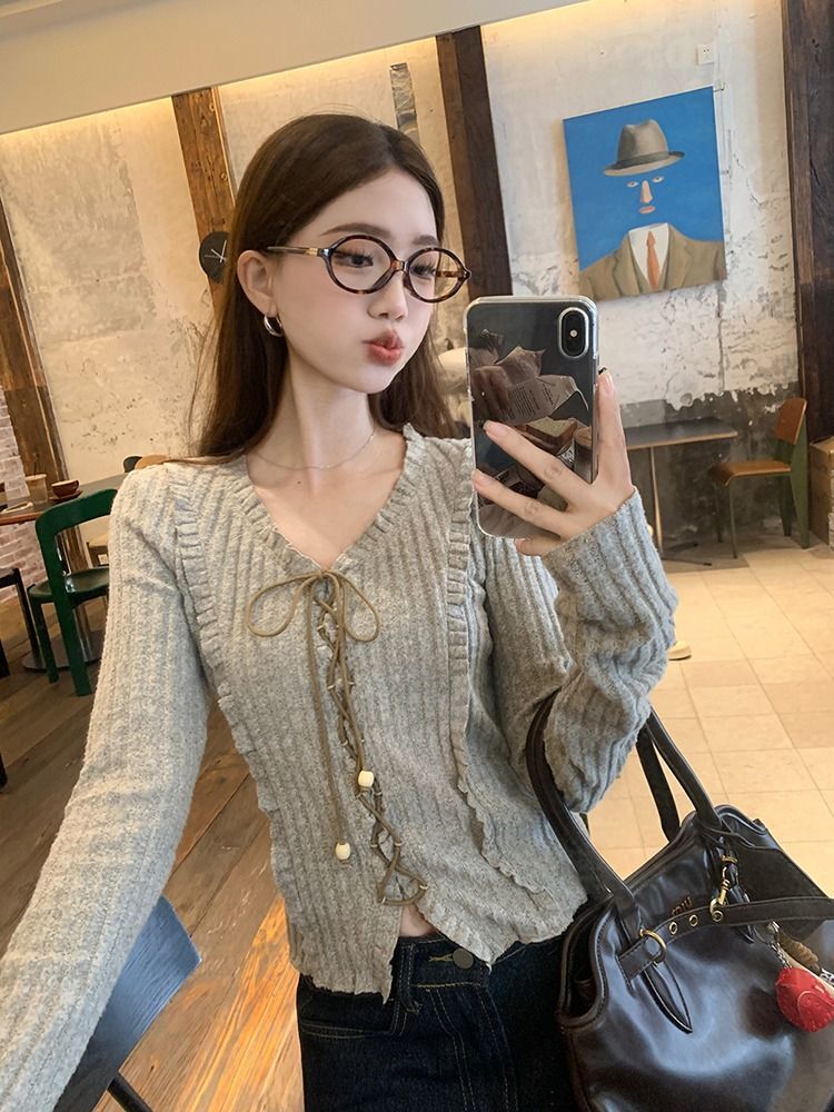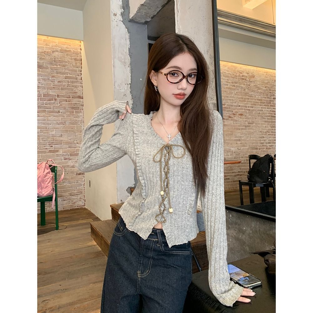 ![MR [Original Fabric Cashmere Ribbed] Sweet and Spicy Slim Fit Long Sleeve Early Autumn Tie-Waist Short V-Neck Long Sleeve Top](images/mrwg/mrwg368e_03.jpg)