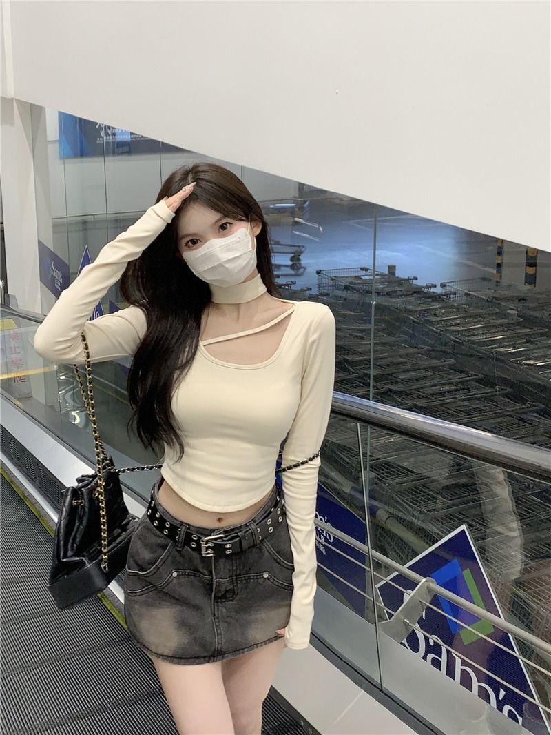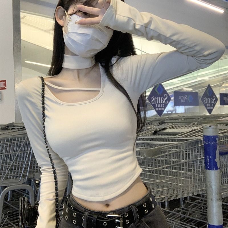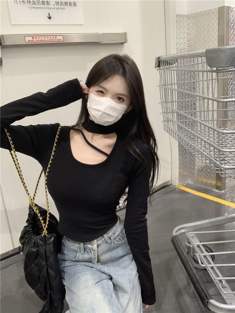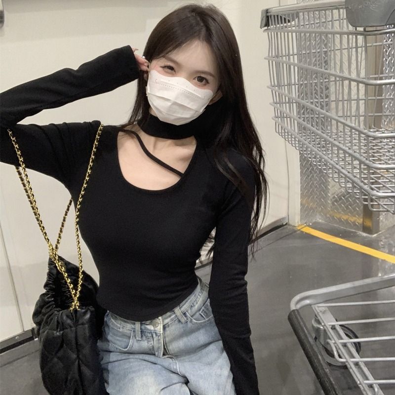![MR [Ribbon Velvet] Autumn/Winter Inner Layer Base Shirt Top with Stylish Halter Neck, Half-High Neck, Slim Fit Short T-Shirt](images/mrwg/mrwg395e_02.jpg)