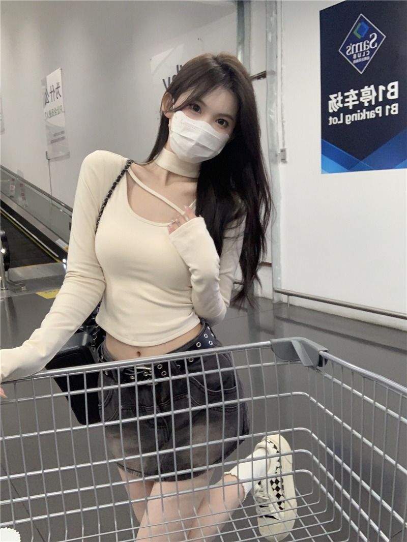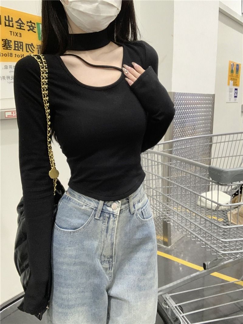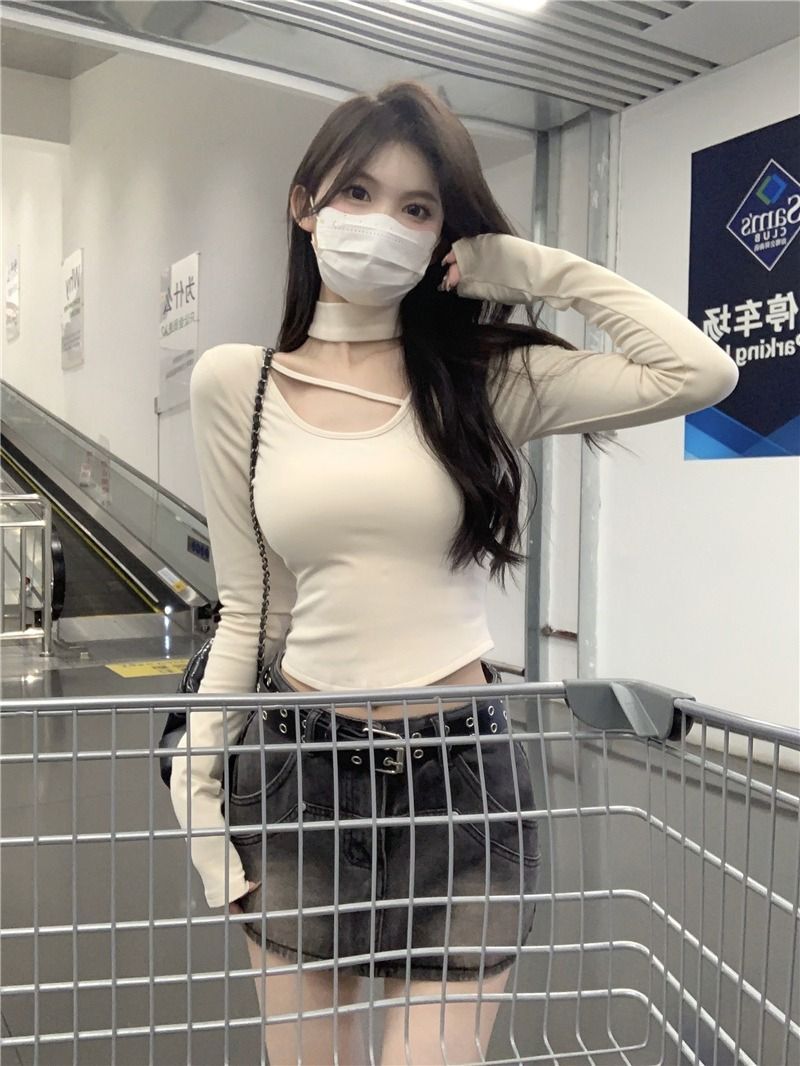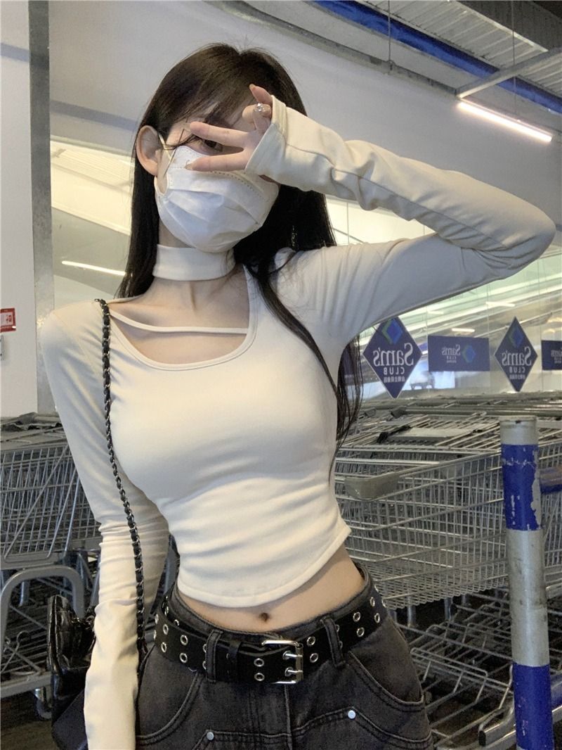 ![MR [Ribbon Velvet] Autumn/Winter Inner Layer Base Shirt Top with Stylish Halter Neck, Half-High Neck, Slim Fit Short T-Shirt](images/mrwg/mrwg395e_02.jpg)