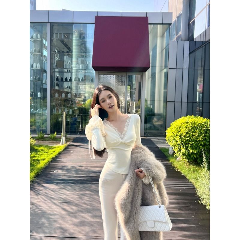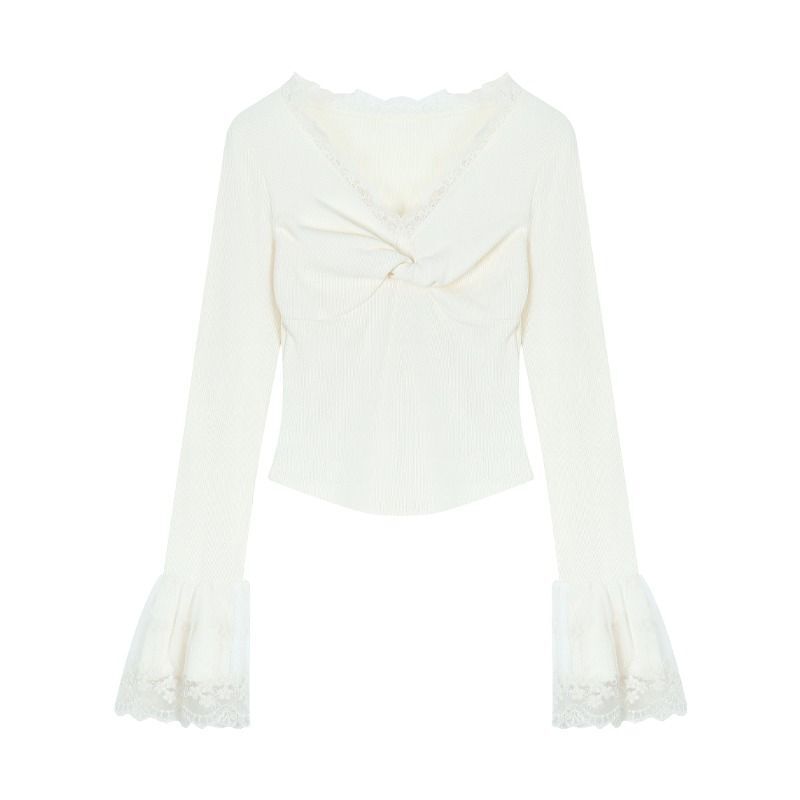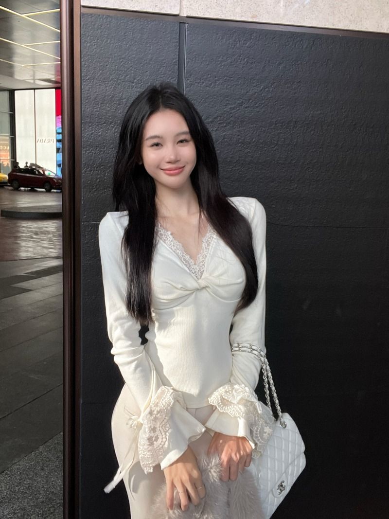 ![MR [Ribbon Velvet] Lace Trim Twisted V-Neck Knitted Sweater Women's Long Sleeve Base Layer Tight-fitting Brushed Top](images/mrwg/mrwg507e_01.jpg)