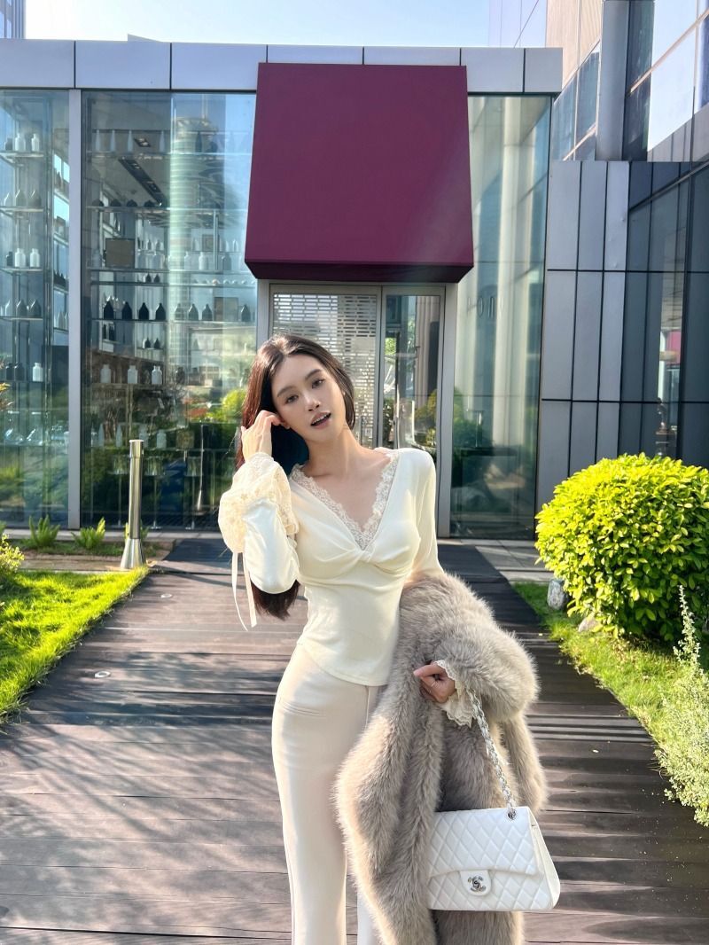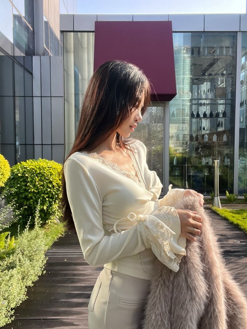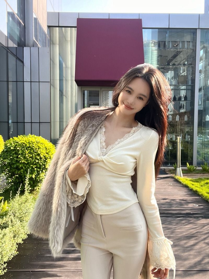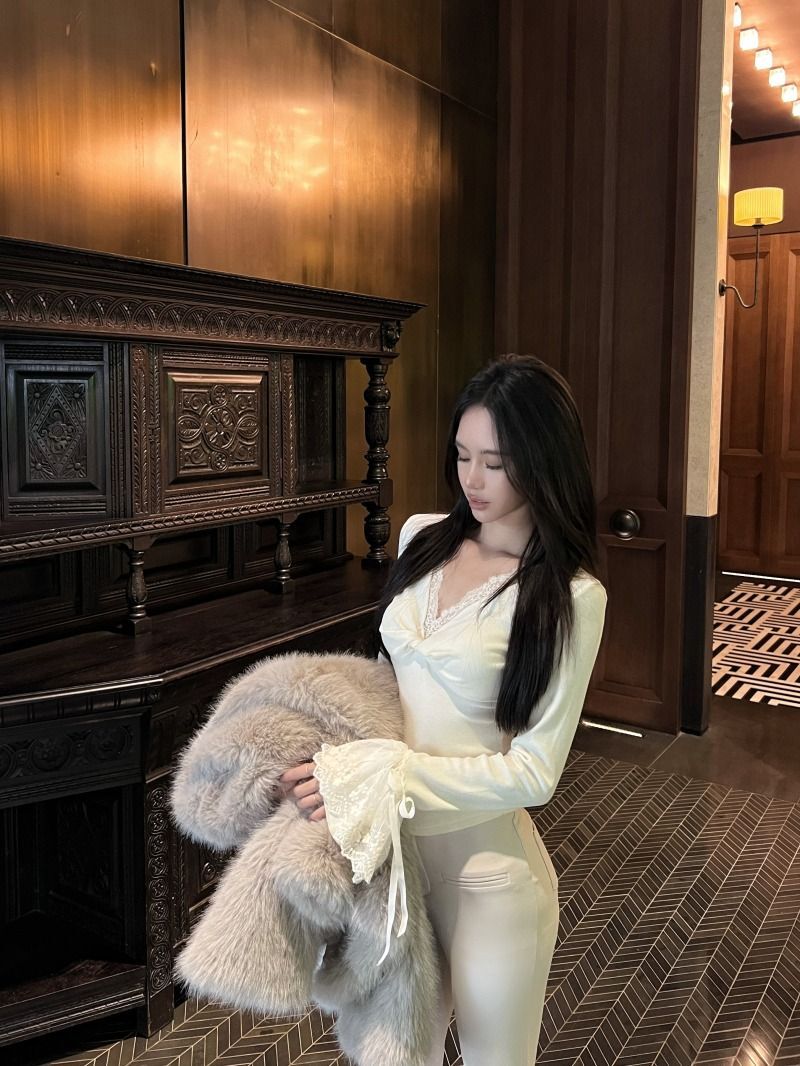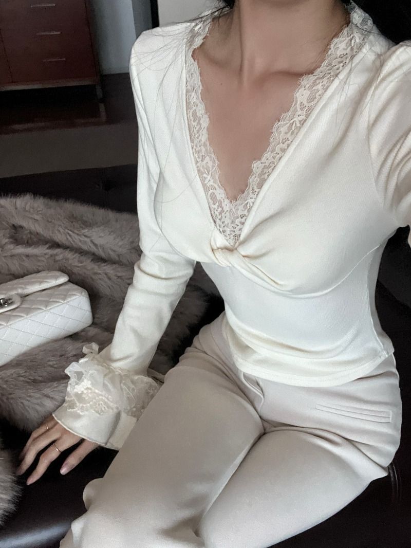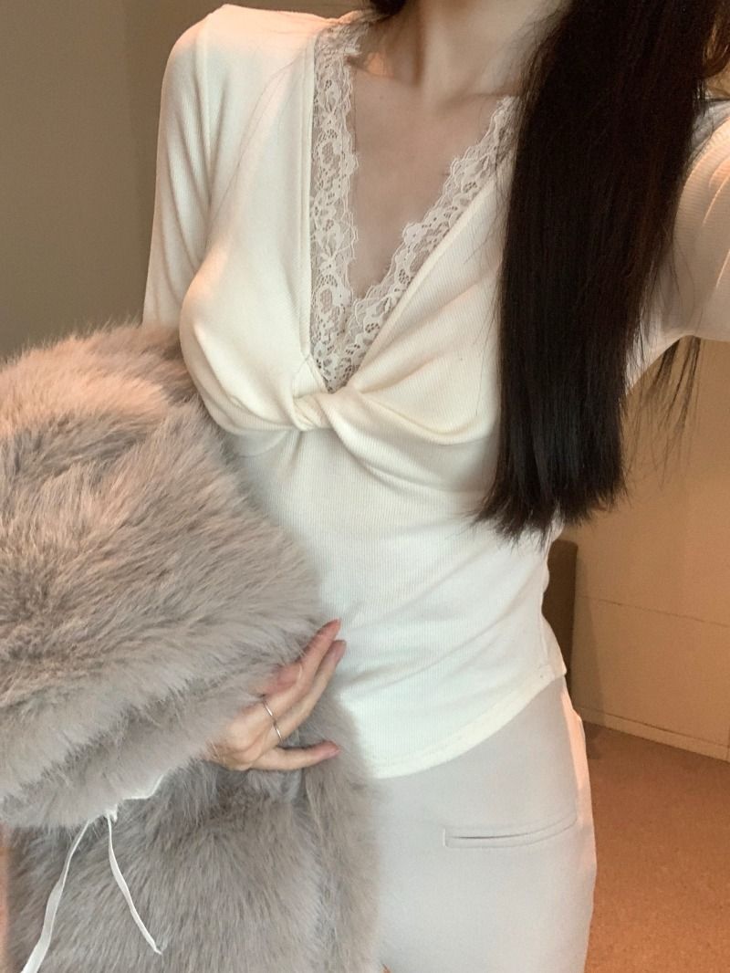![MR [Ribbon Velvet] Lace Trim Twisted V-Neck Knitted Sweater Women's Long Sleeve Base Layer Tight-fitting Brushed Top](images/mrwg/mrwg507e_02.jpg)