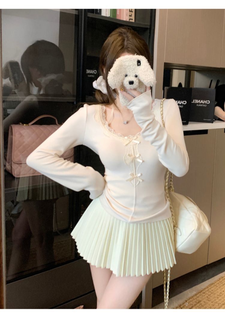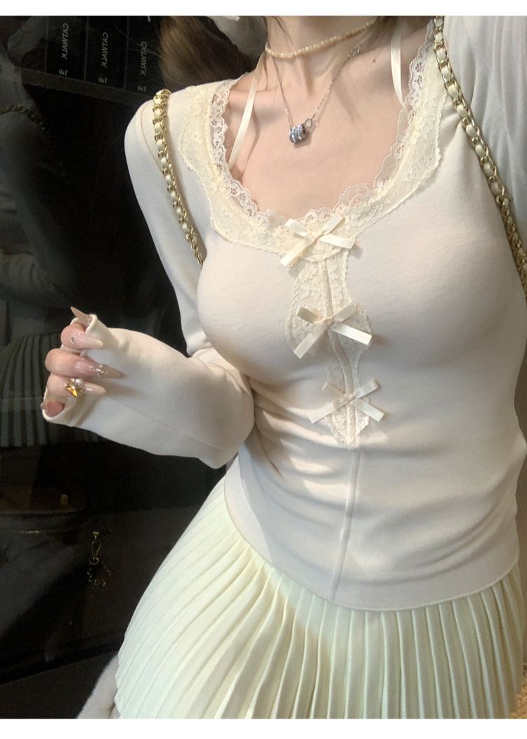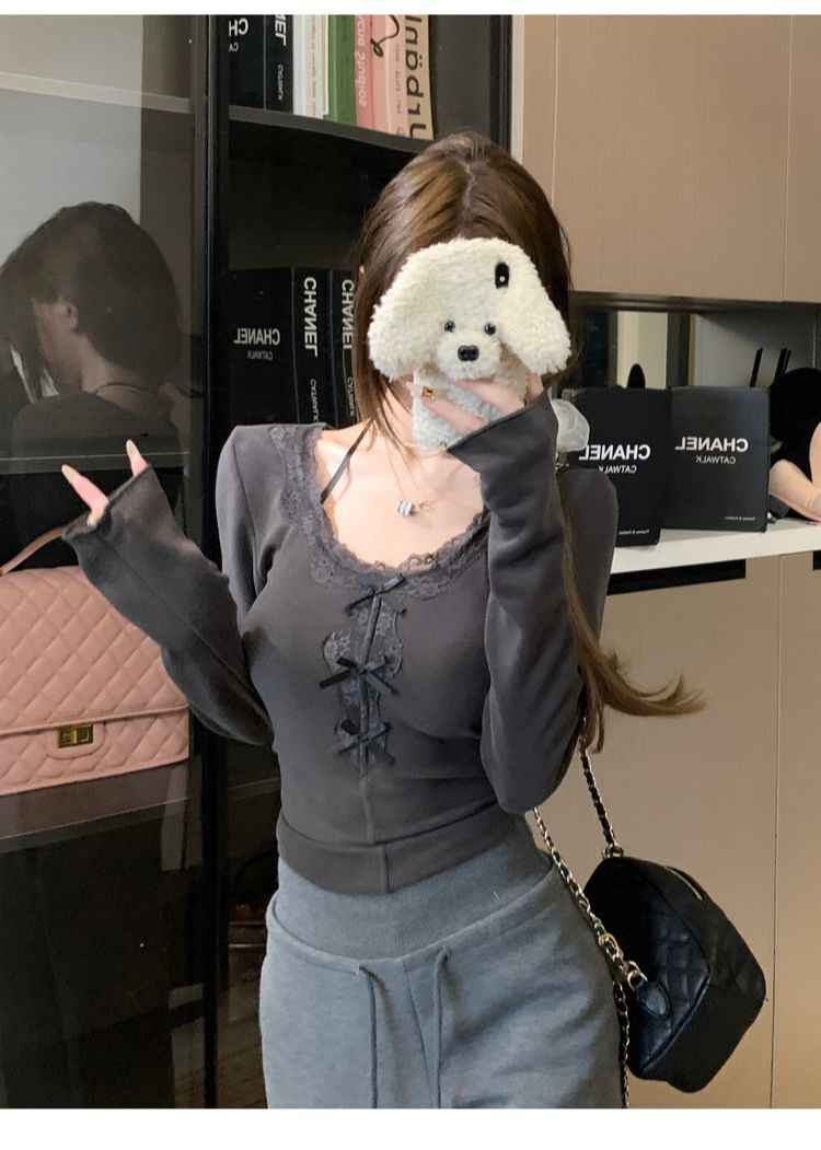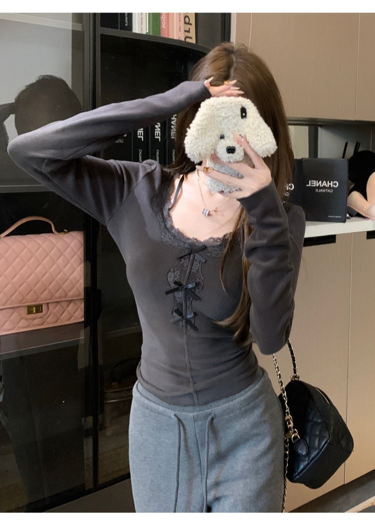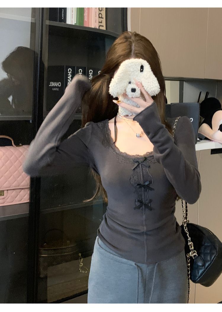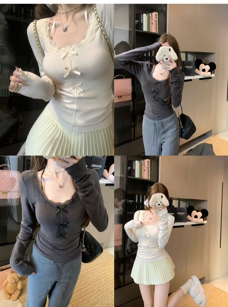 ![MR [Ribbon Velvet] Sweet Bow Lace Patchwork U-Neck Long Sleeve T-Shirt, Slim Fit, Flattering Base Layer](images/mrwg/mrwg508e_04.jpg)