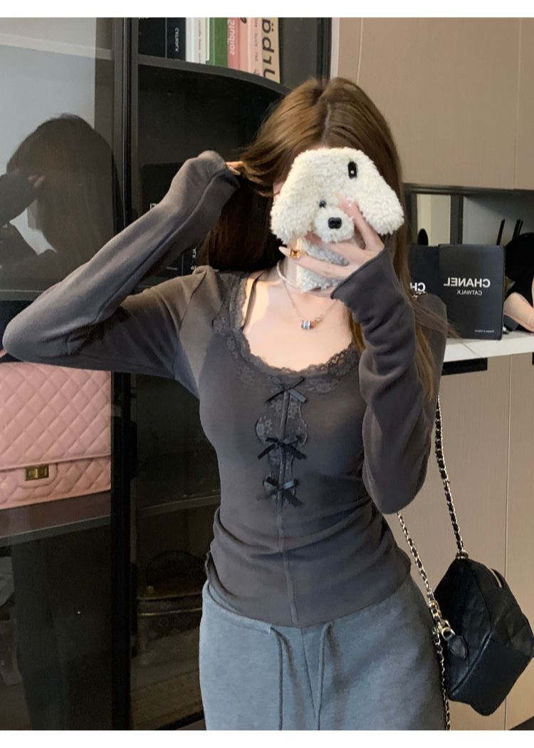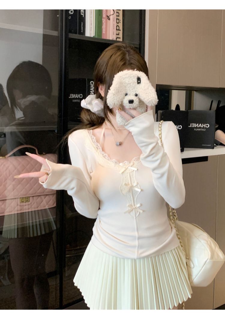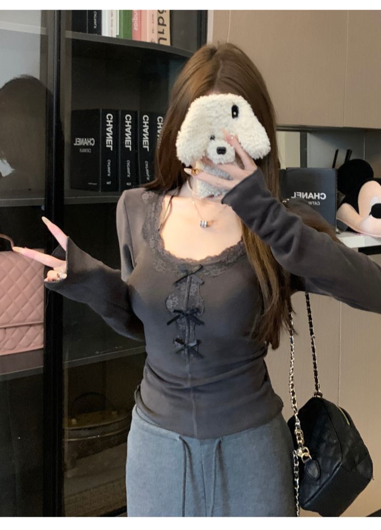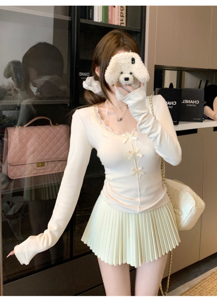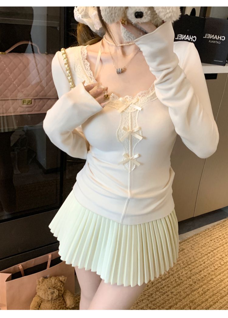 ![MR [Ribbon Velvet] Sweet Bow Lace Patchwork U-Neck Long Sleeve T-Shirt, Slim Fit, Flattering Base Layer](images/mrwg/mrwg508e_04.jpg)