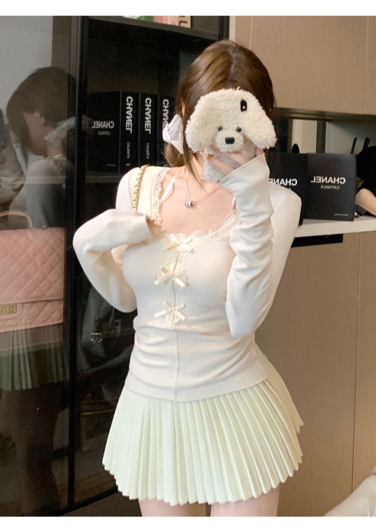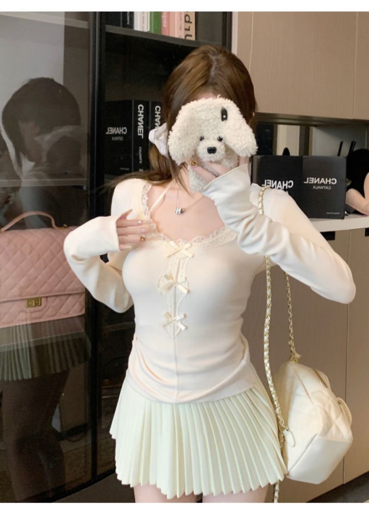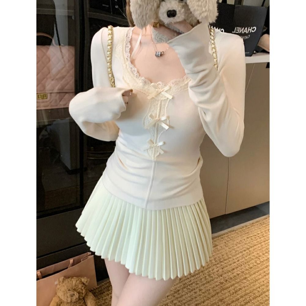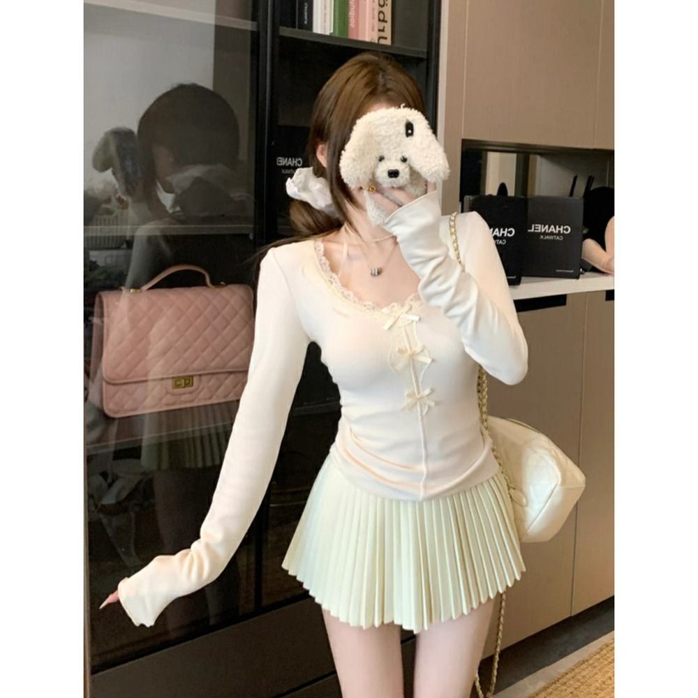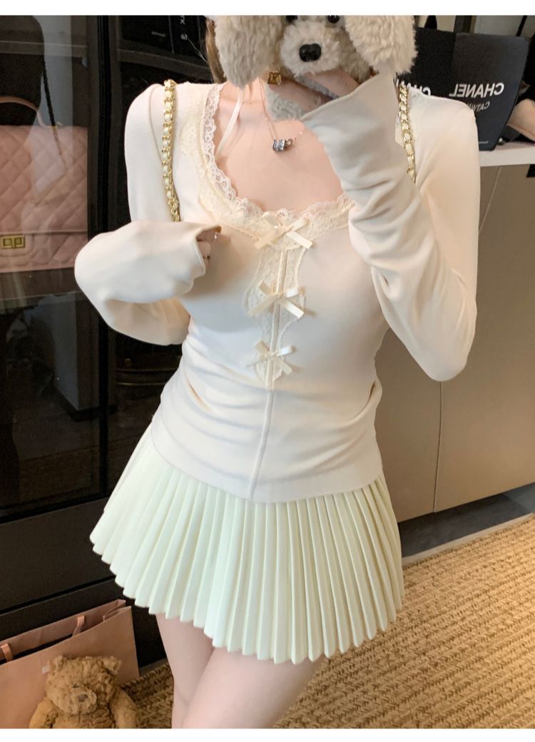 ![MR [Ribbon Velvet] Sweet Bow Lace Patchwork U-Neck Long Sleeve T-Shirt, Slim Fit, Flattering Base Layer](images/mrwg/mrwg508e_04.jpg)