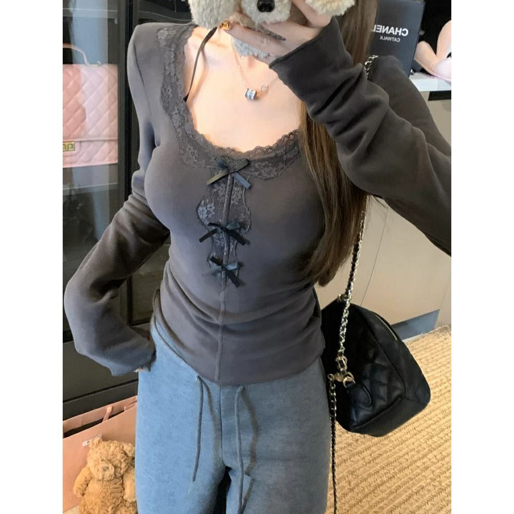 ![MR [Ribbon Velvet] Sweet Bow Lace Patchwork U-Neck Long Sleeve T-Shirt, Slim Fit, Flattering Base Layer](images/mrwg/mrwg508e_03.jpg)