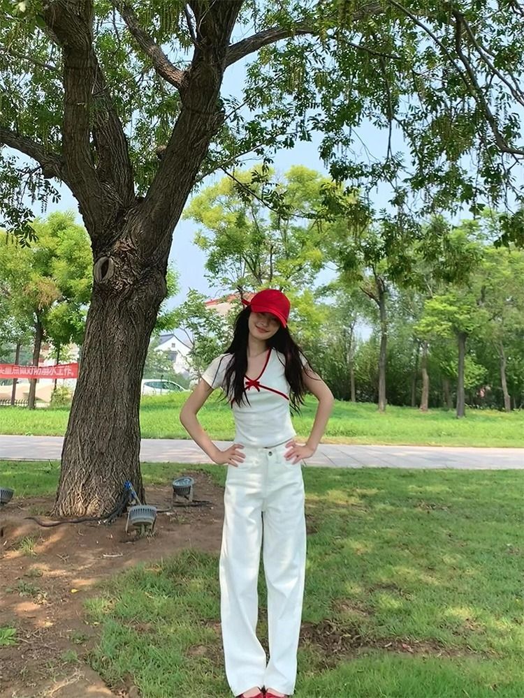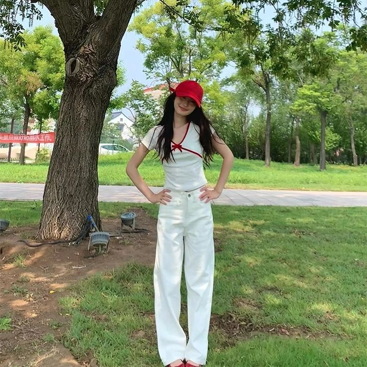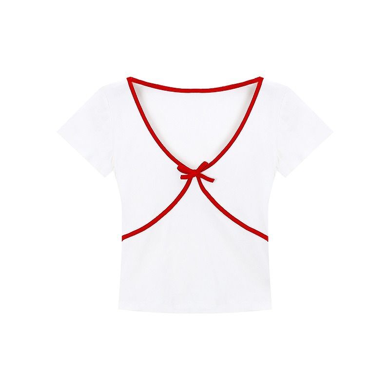 ![MR [40-count fine cotton] Bowknot V-neck white short-sleeved t-shirt for women, summer slim fit, flattering and unique.](images/mrwg/mrwg526e_04.jpg)