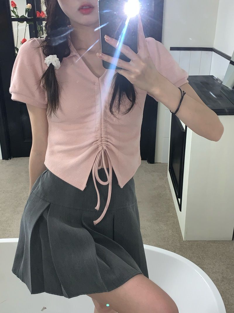![[In Stock] Host's Choice! Short Waffle Polo Collar with Puff Sleeves, Drawstring, V-Neck](images/mrwg/mrwg632e_03.jpg)