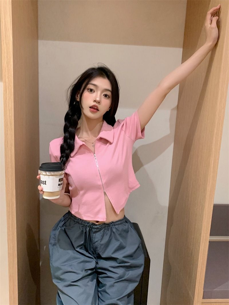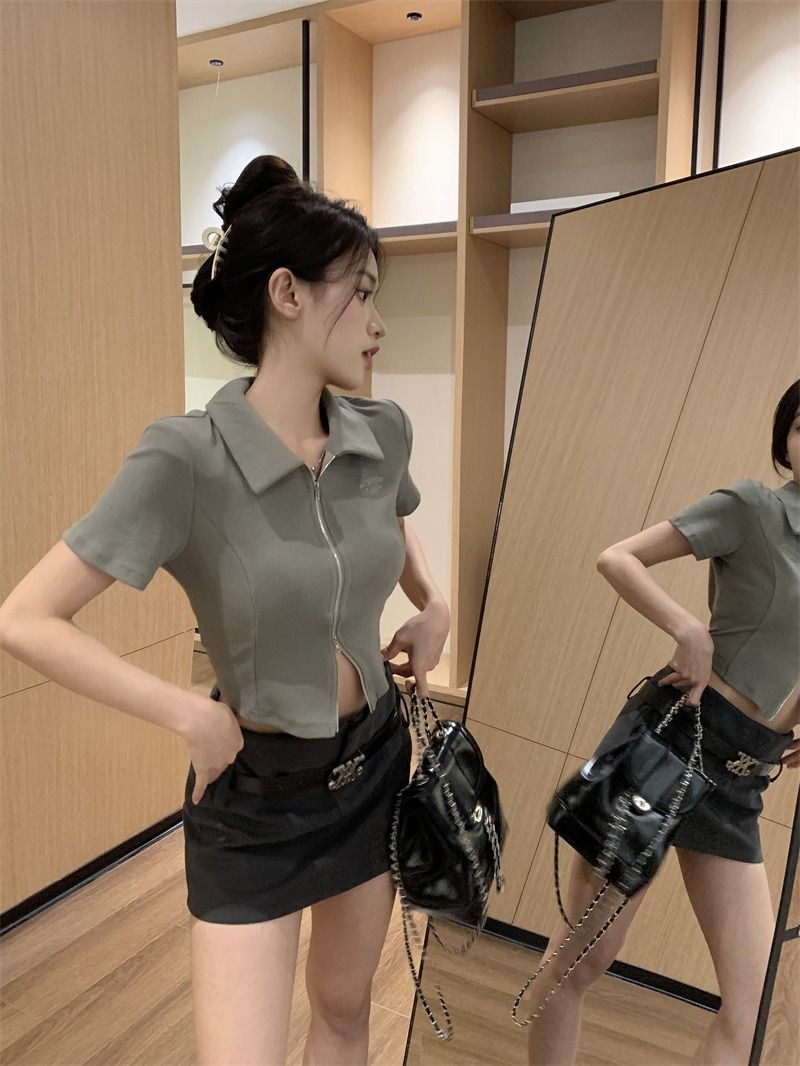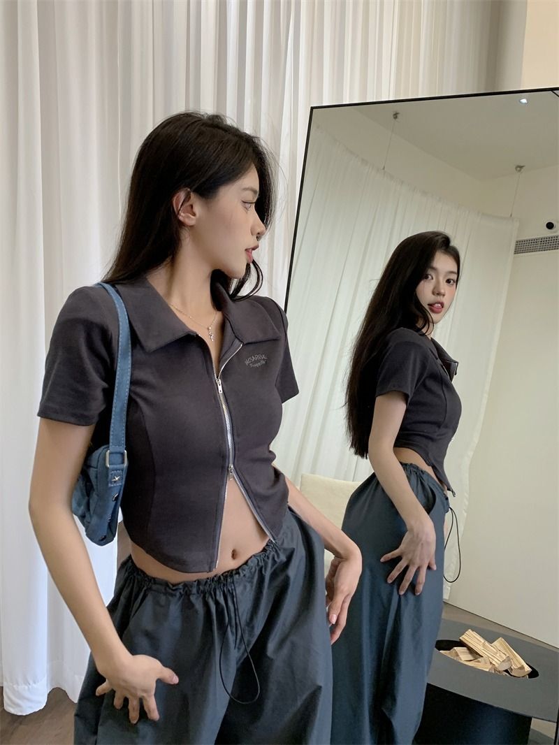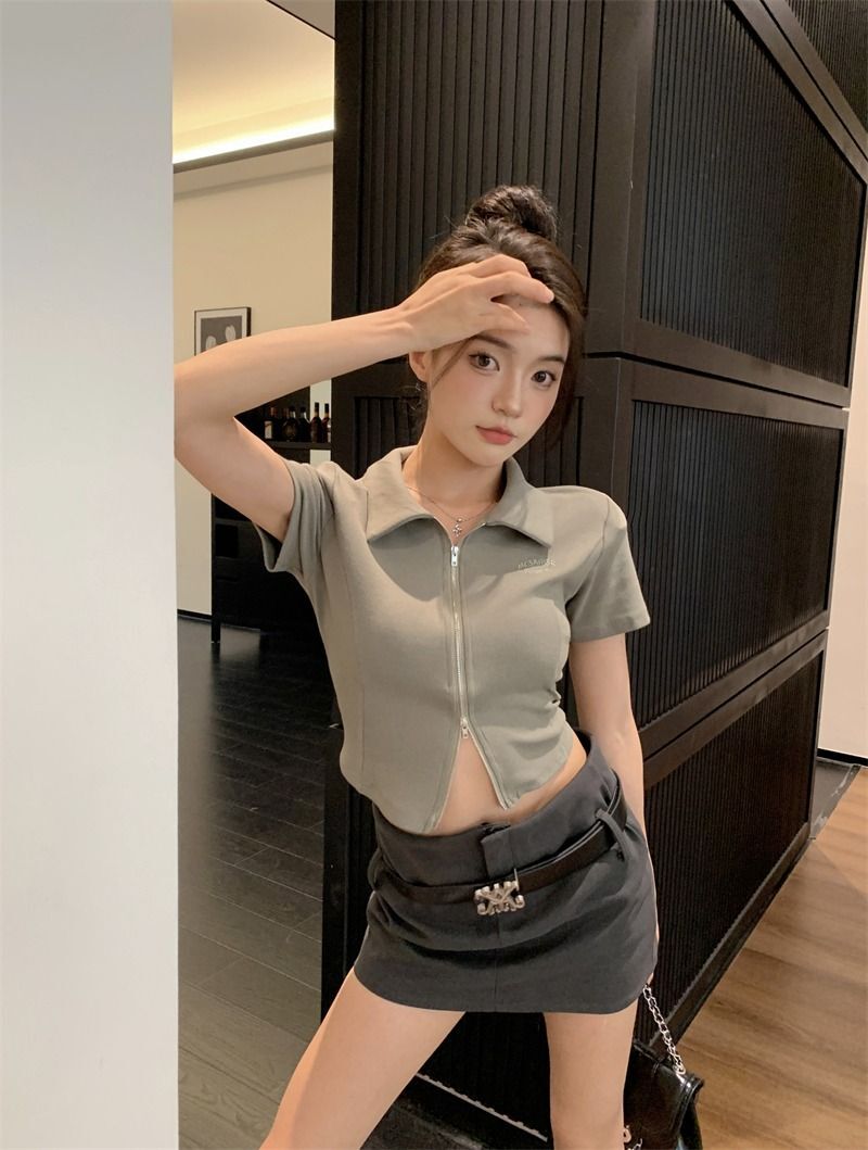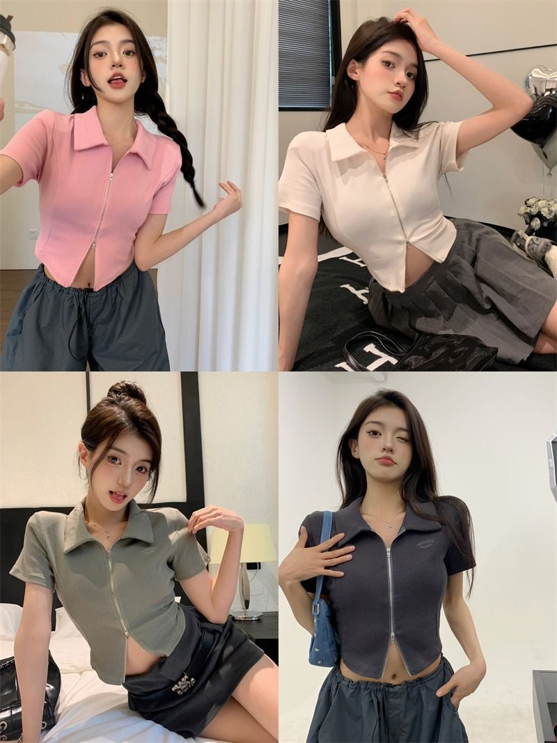 ![[In Stock] Korean Style Polo Neck T-Shirt for Women, Summer, Double Zipper Design, Unique Style, Slim Fit, Short](images/mrwg/mrwg709e_02.jpg)