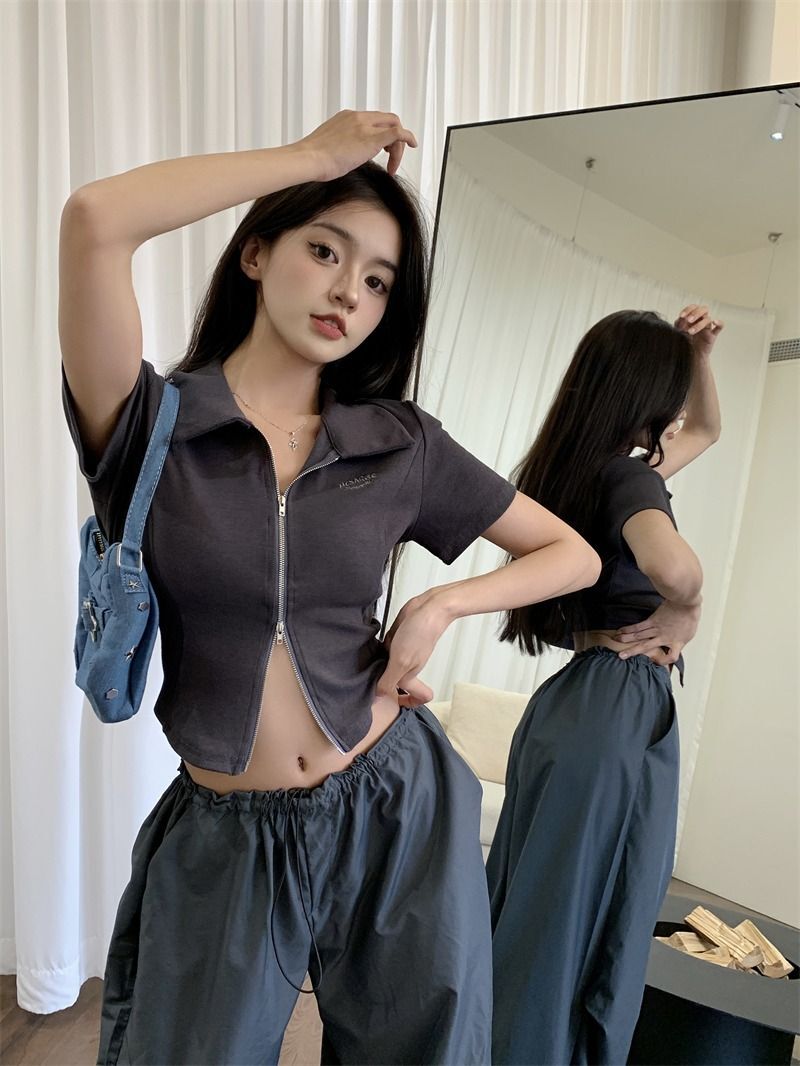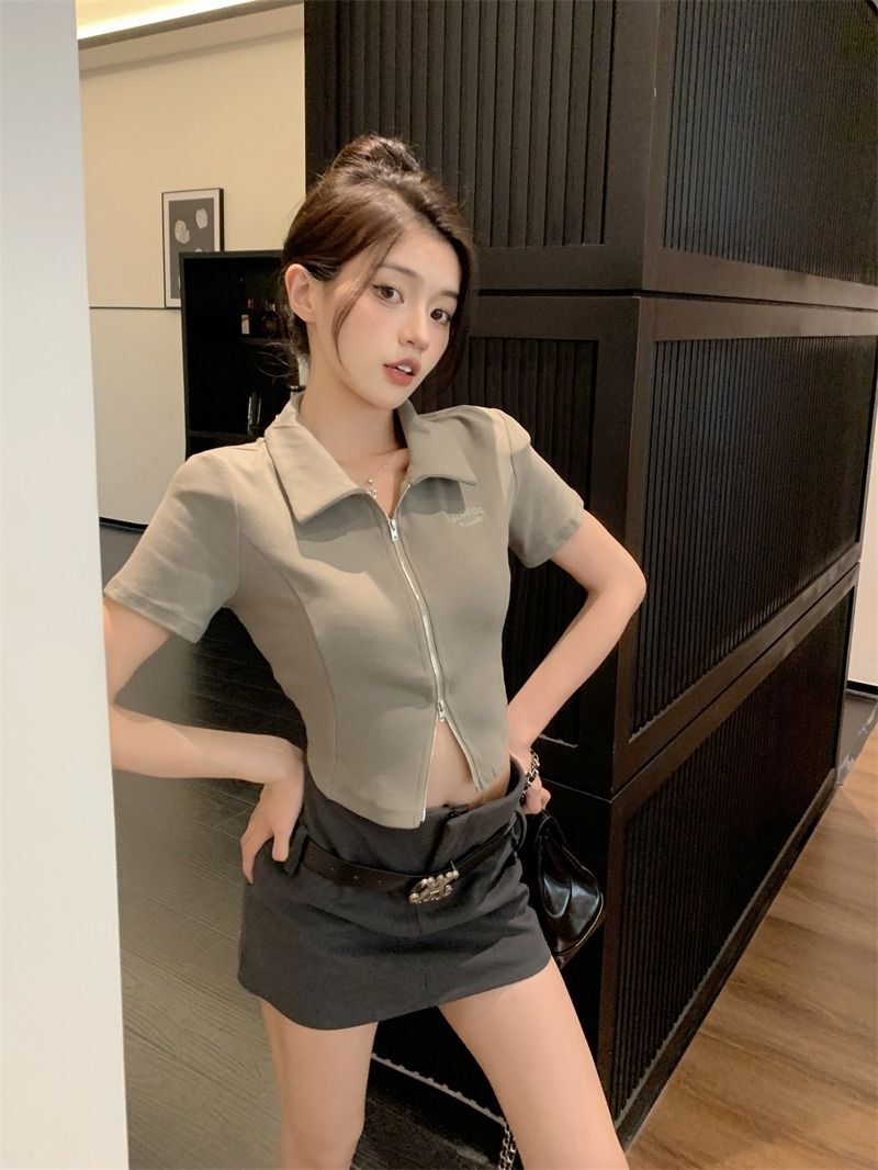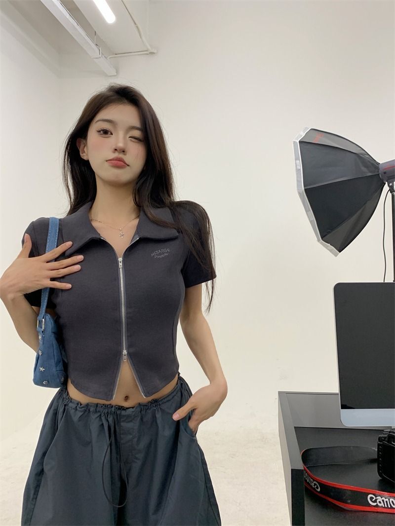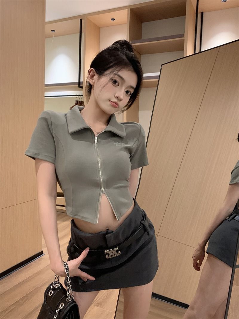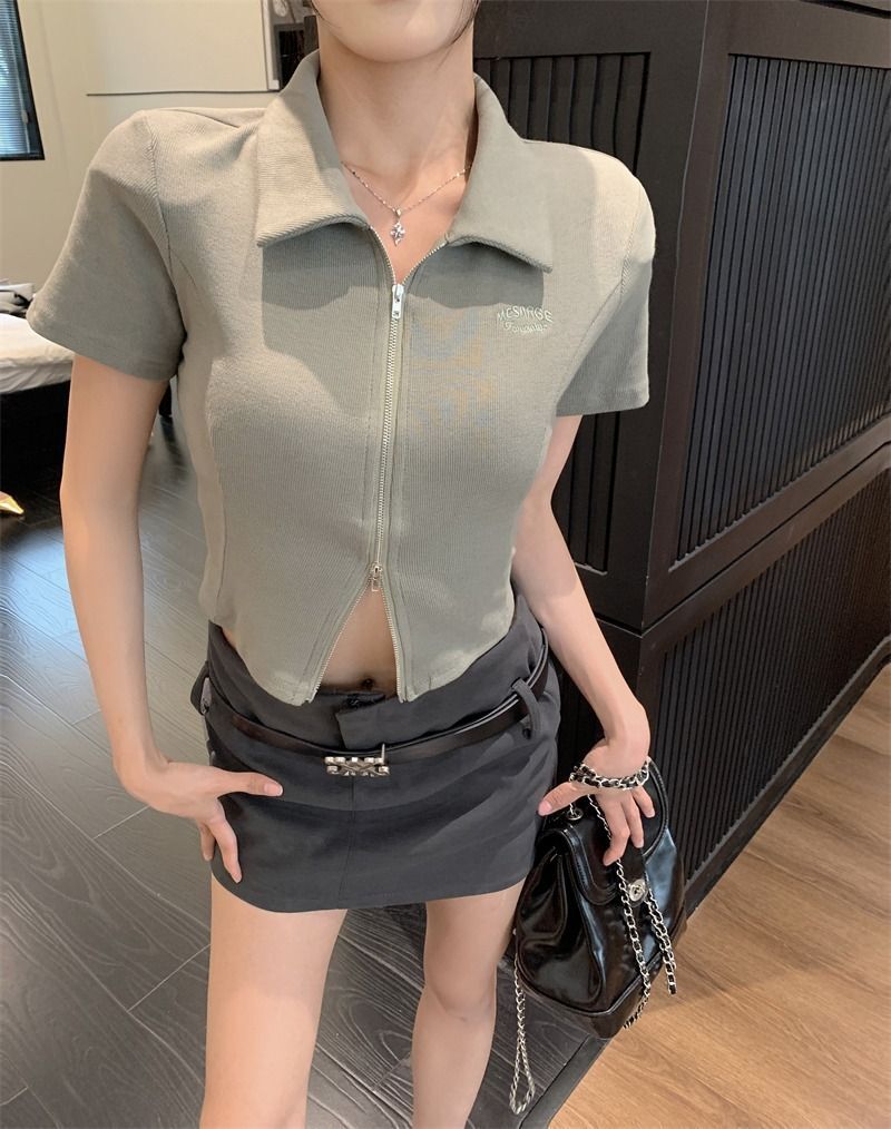 ![[In Stock] Korean Style Polo Neck T-Shirt for Women, Summer, Double Zipper Design, Unique Style, Slim Fit, Short](images/mrwg/mrwg709e_02.jpg)