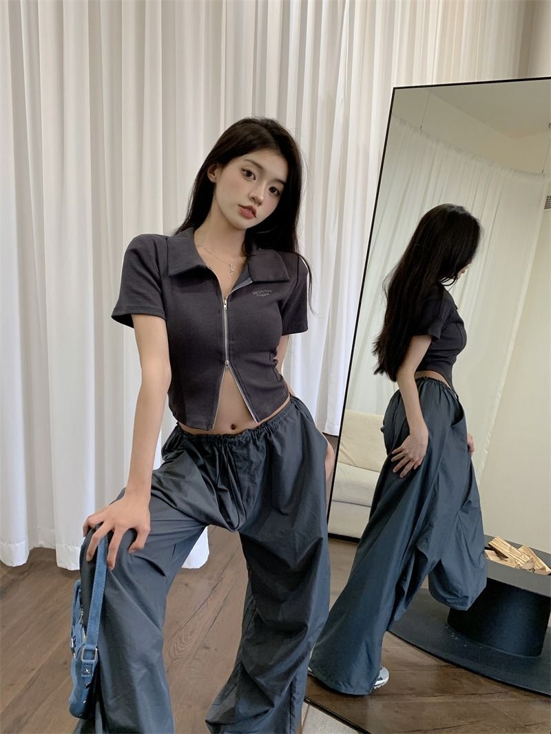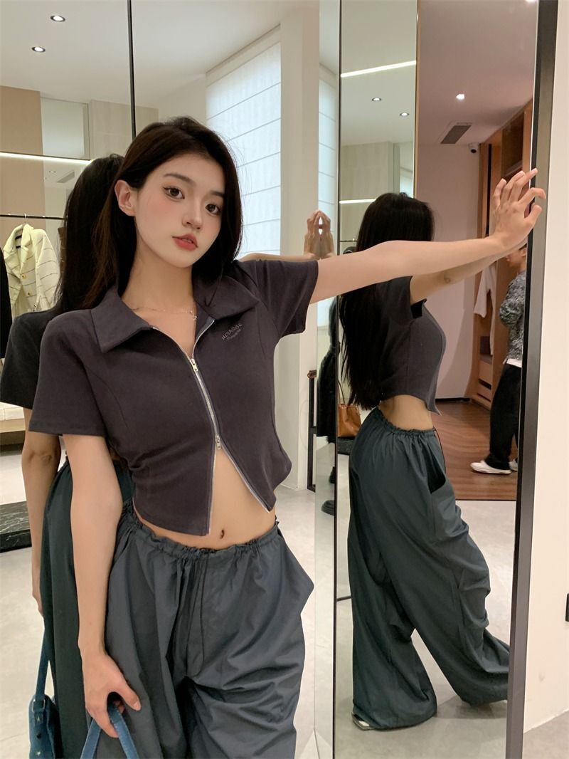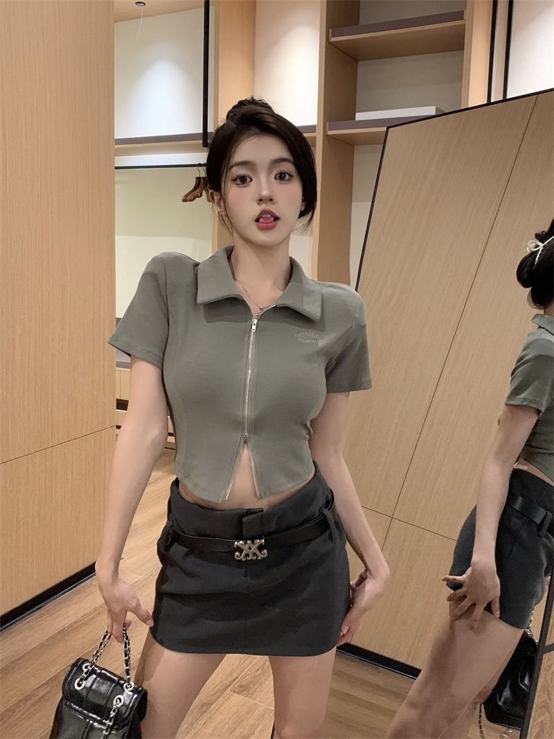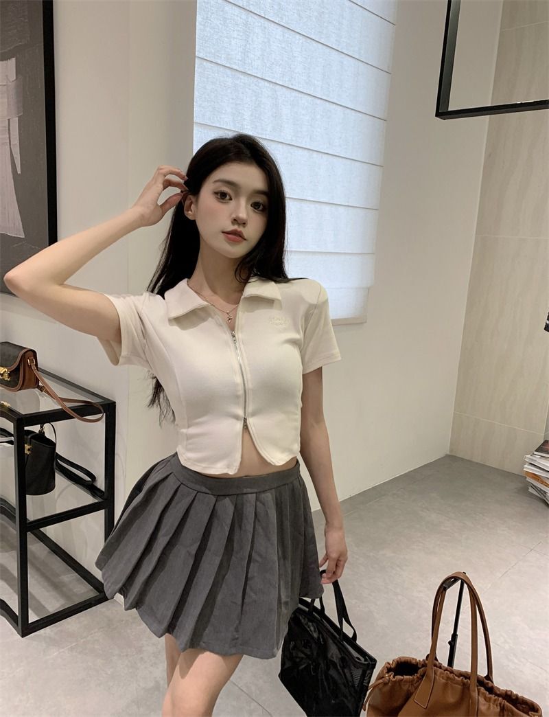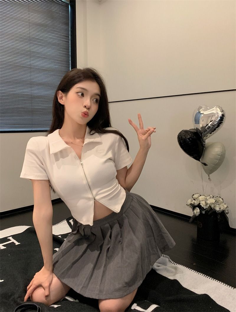 ![[In Stock] Korean Style Polo Neck T-Shirt for Women, Summer, Double Zipper Design, Unique Style, Slim Fit, Short](images/mrwg/mrwg709e_02.jpg)