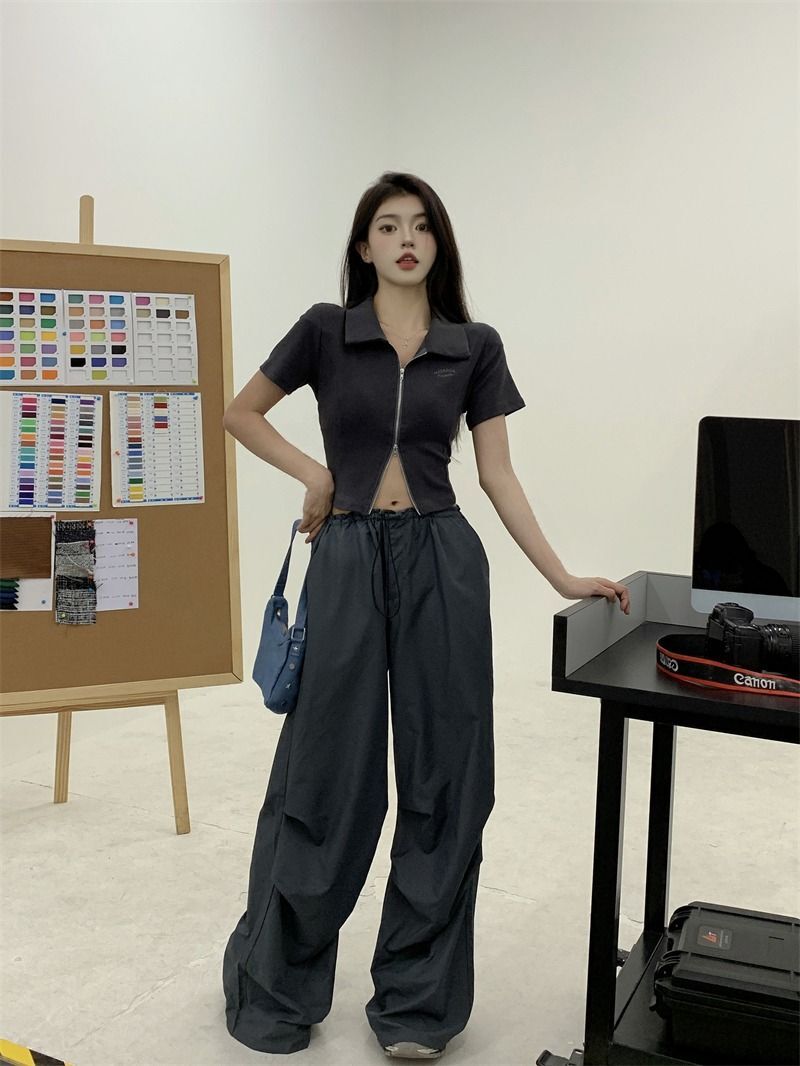 ![[In Stock] Korean Style Polo Neck T-Shirt for Women, Summer, Double Zipper Design, Unique Style, Slim Fit, Short](images/mrwg/mrwg709e_04.jpg)