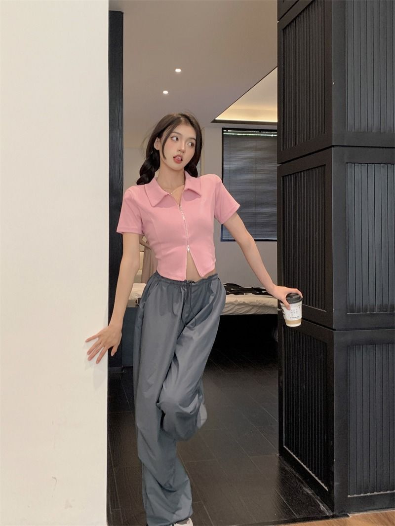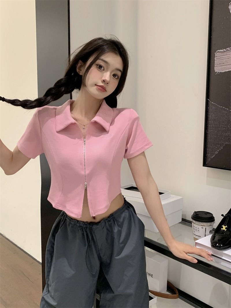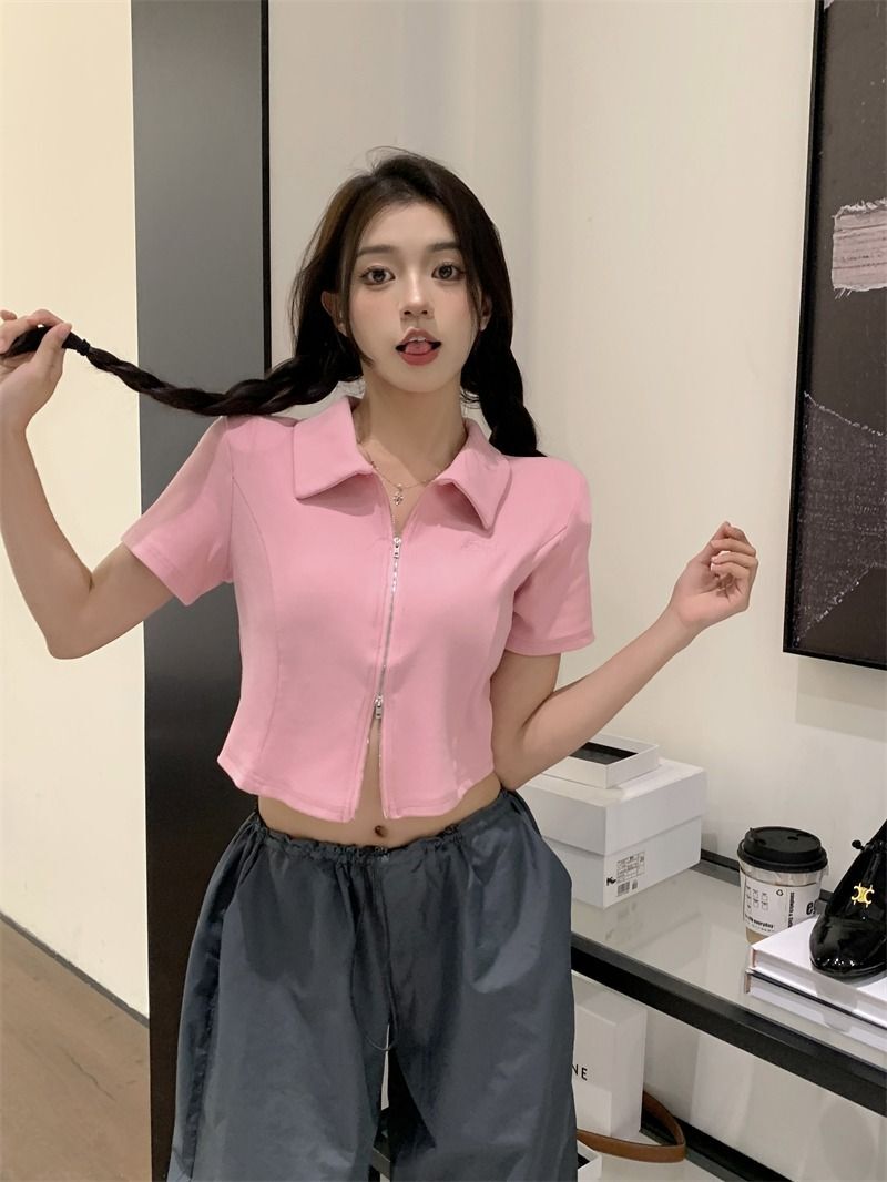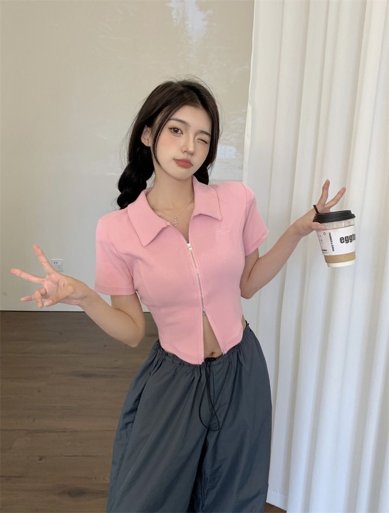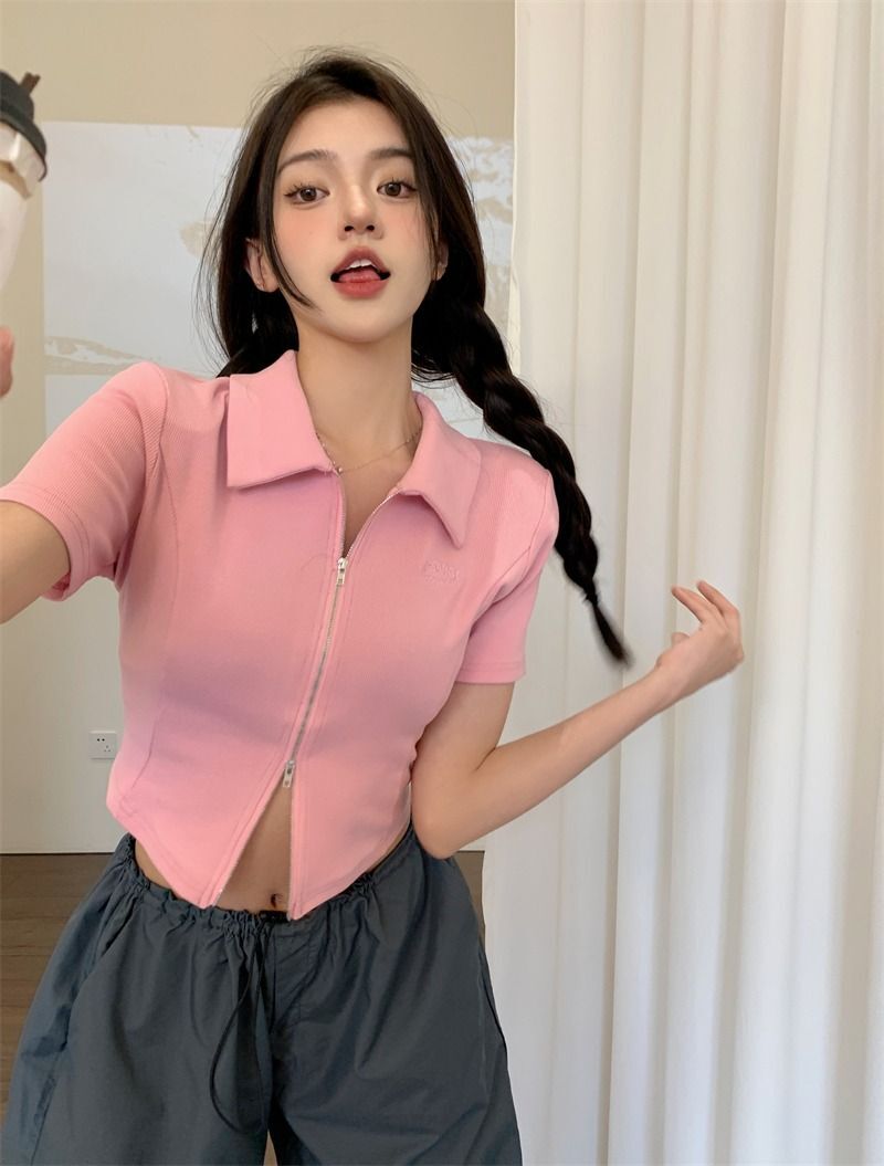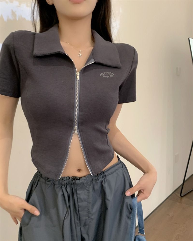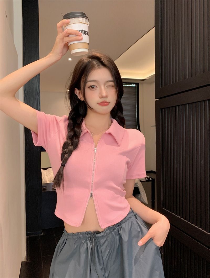 ![[In Stock] Korean Style Polo Neck T-Shirt for Women, Summer, Double Zipper Design, Unique Style, Slim Fit, Short](images/mrwg/mrwg709e_01.jpg)