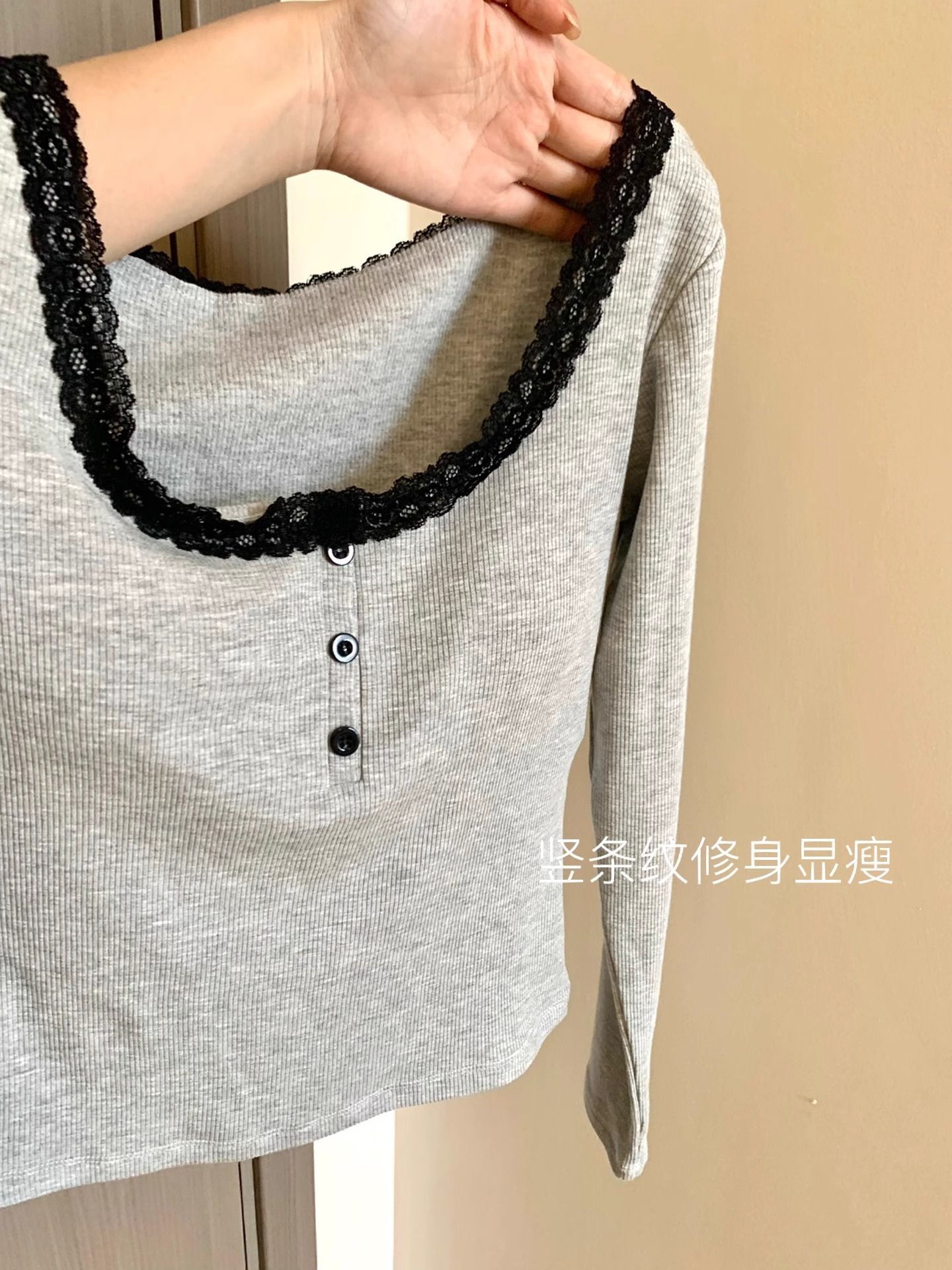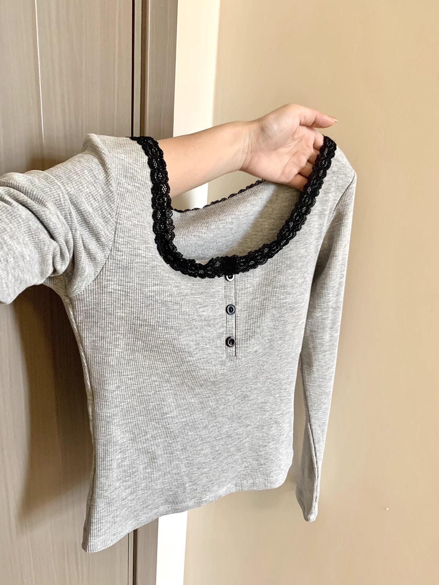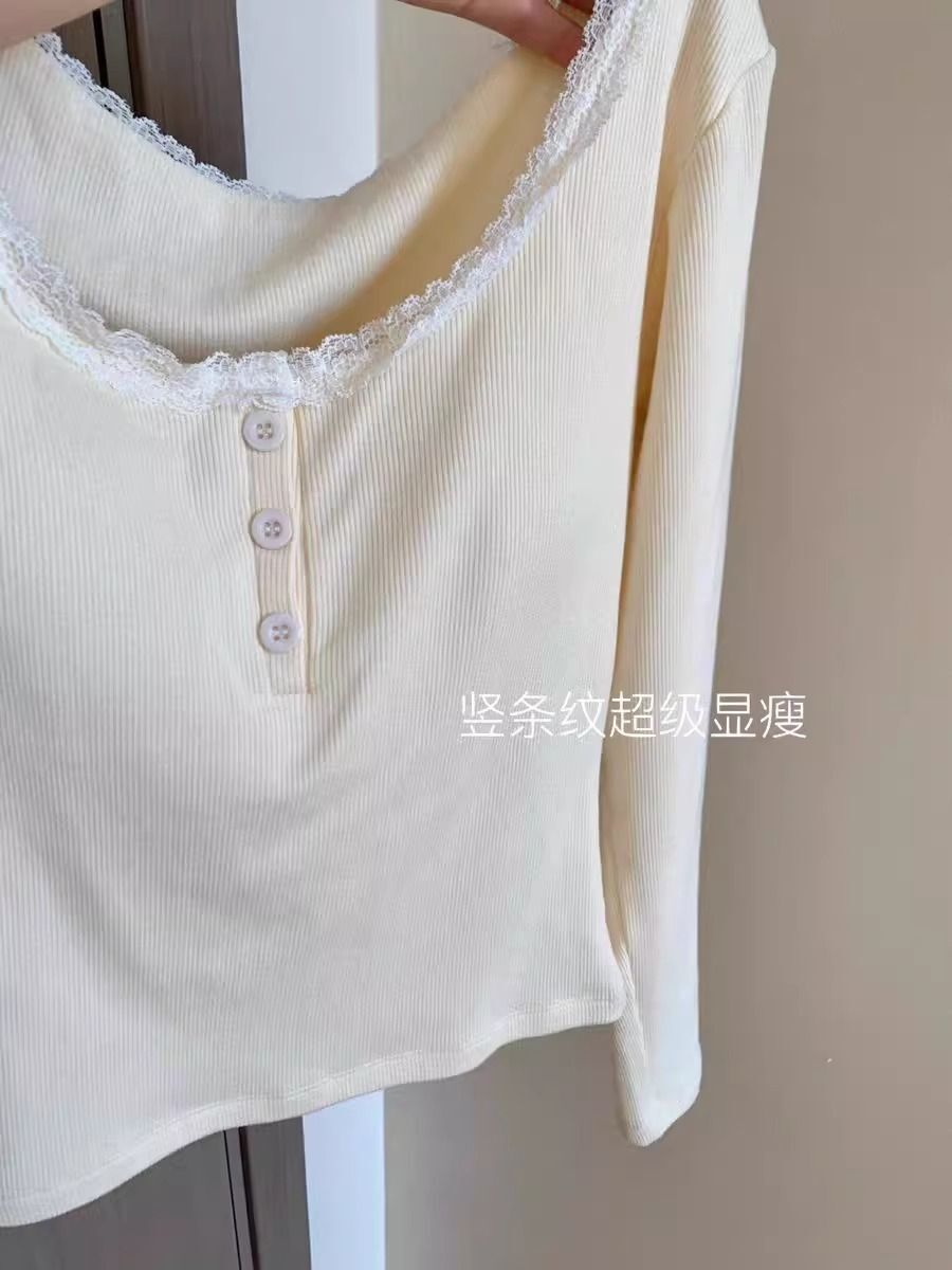 ![[With Bra Pads] Long-sleeved Lace-trimmed T-shirt for women, sweet and warm for winter, with bra pads, versatile and sexy base layer.](images/mrwg/mrwg739e_01.jpg)