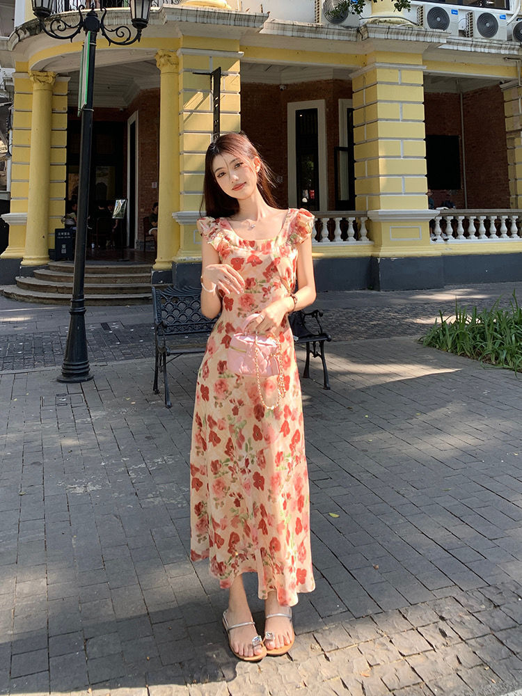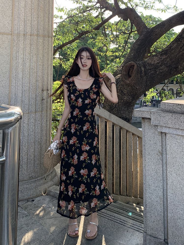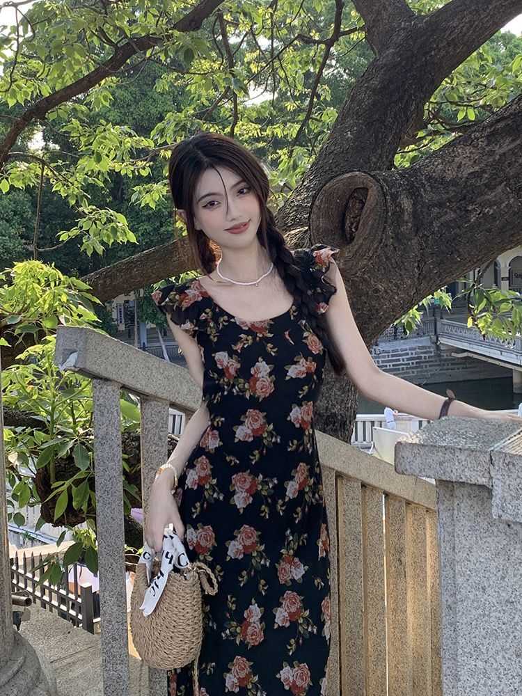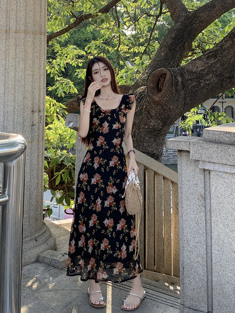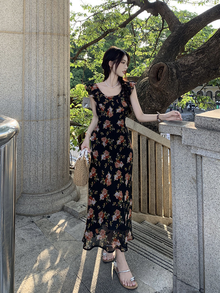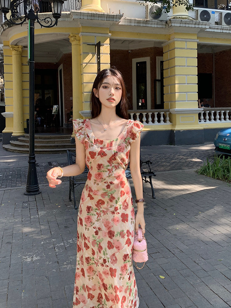 French retro floral print dress for women, new summer 2025 style, flutter sleeve design, slimming A-line silhouette.