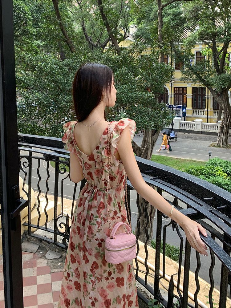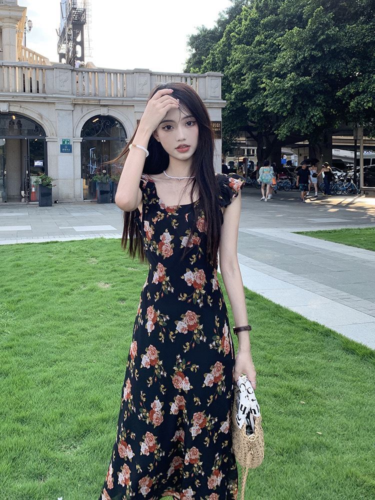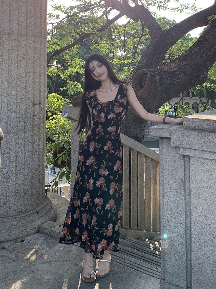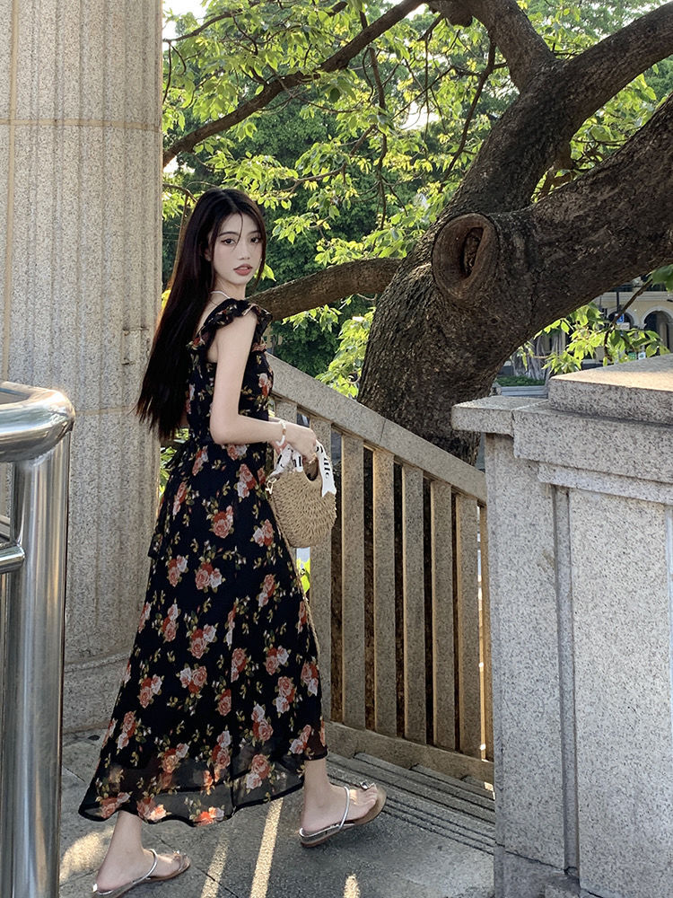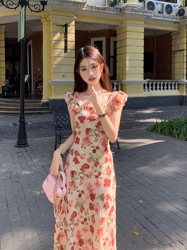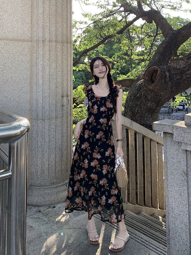 French retro floral print dress for women, new summer 2025 style, flutter sleeve design, slimming A-line silhouette.