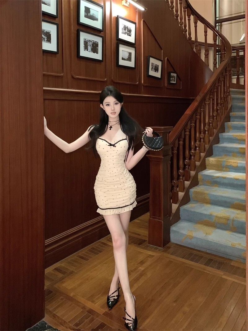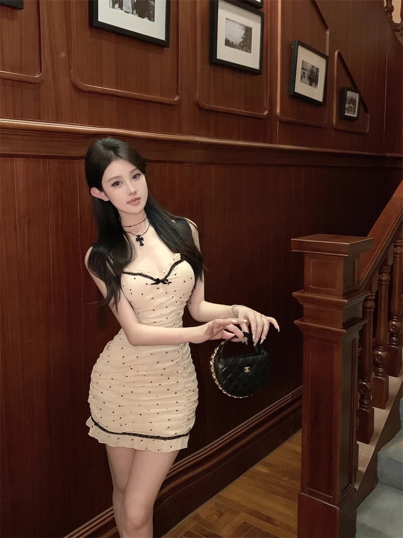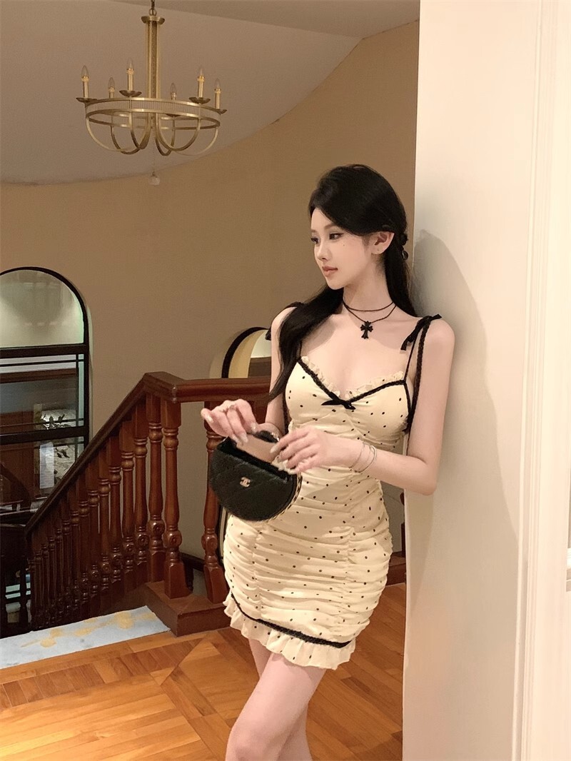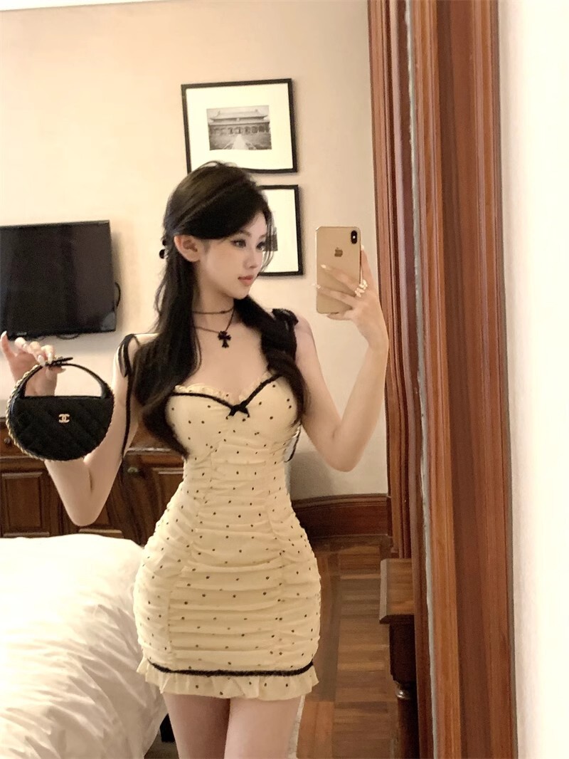 Pure and alluring bodycon halter dress, new summer style, strapless sexy polka dot color-blocked tie-up ruffled dress