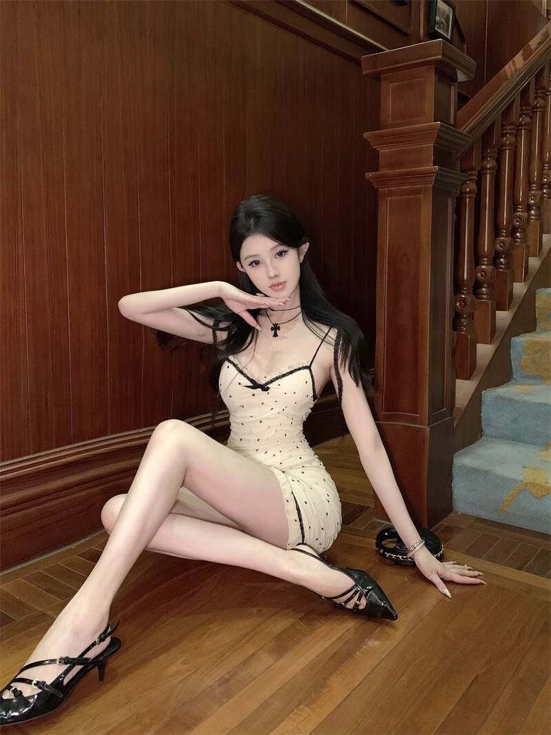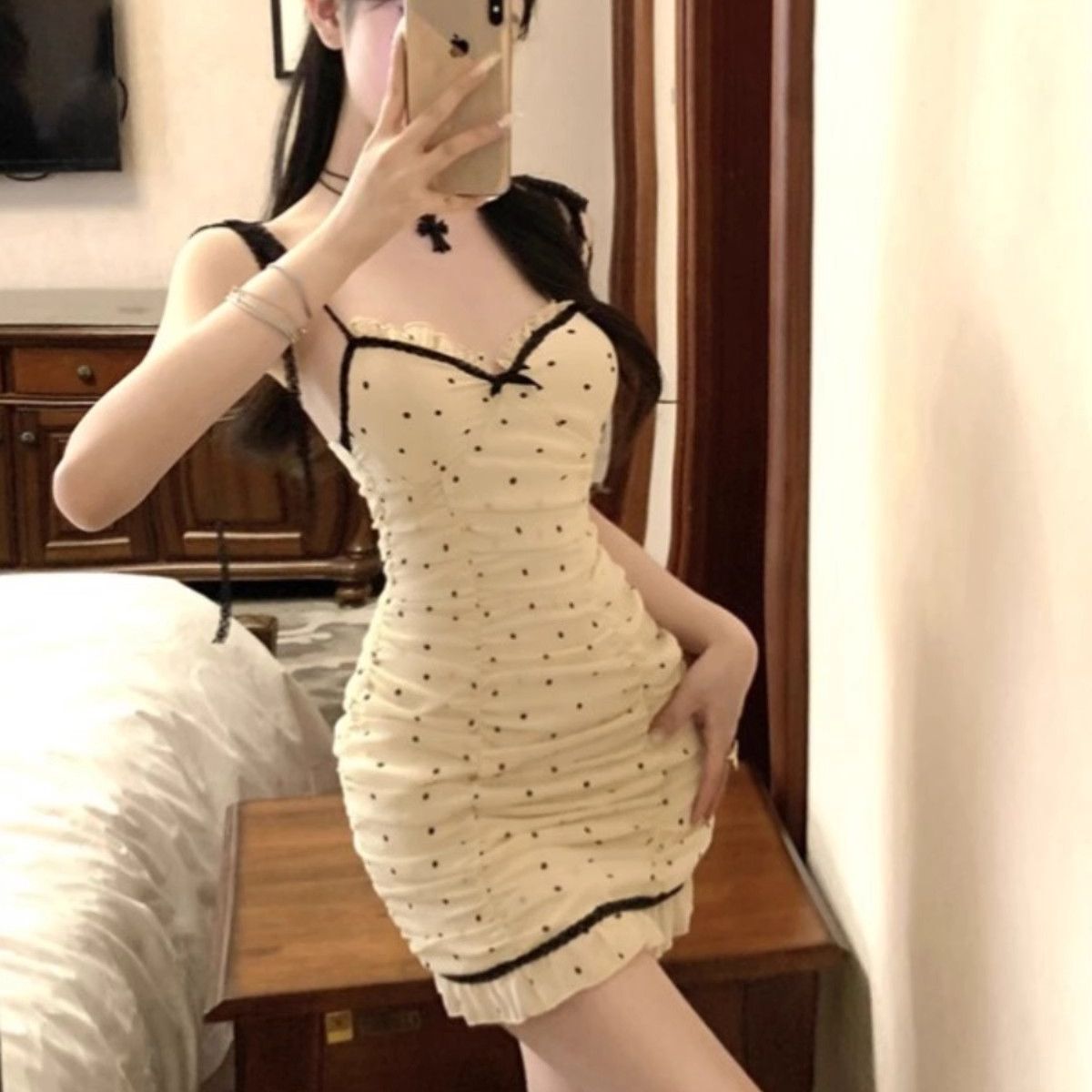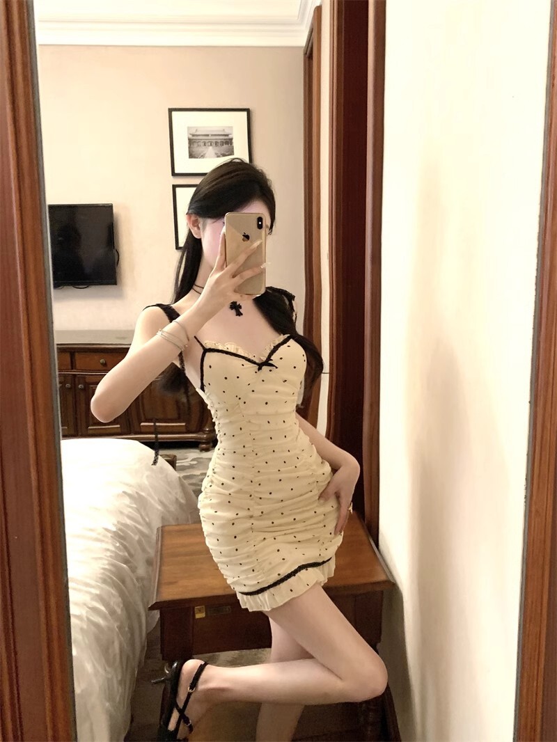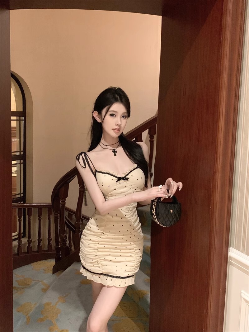 Pure and alluring bodycon halter dress, new summer style, strapless sexy polka dot color-blocked tie-up ruffled dress