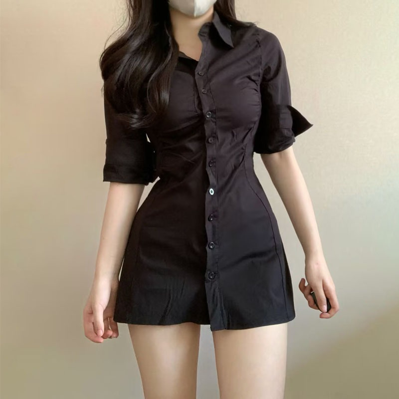 Pure and alluring Korean-style mature woman design, slim-fitting pleated collar sexy shirt dress, niche hot girl waist-cinching dress