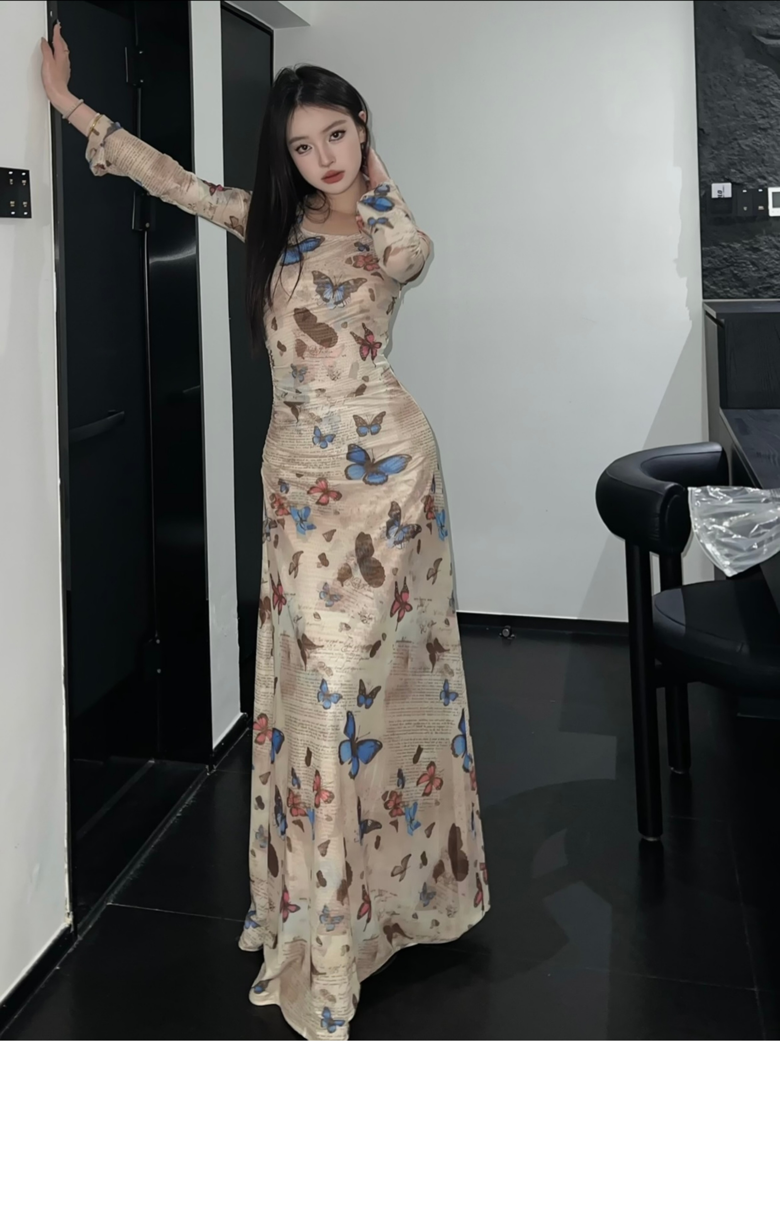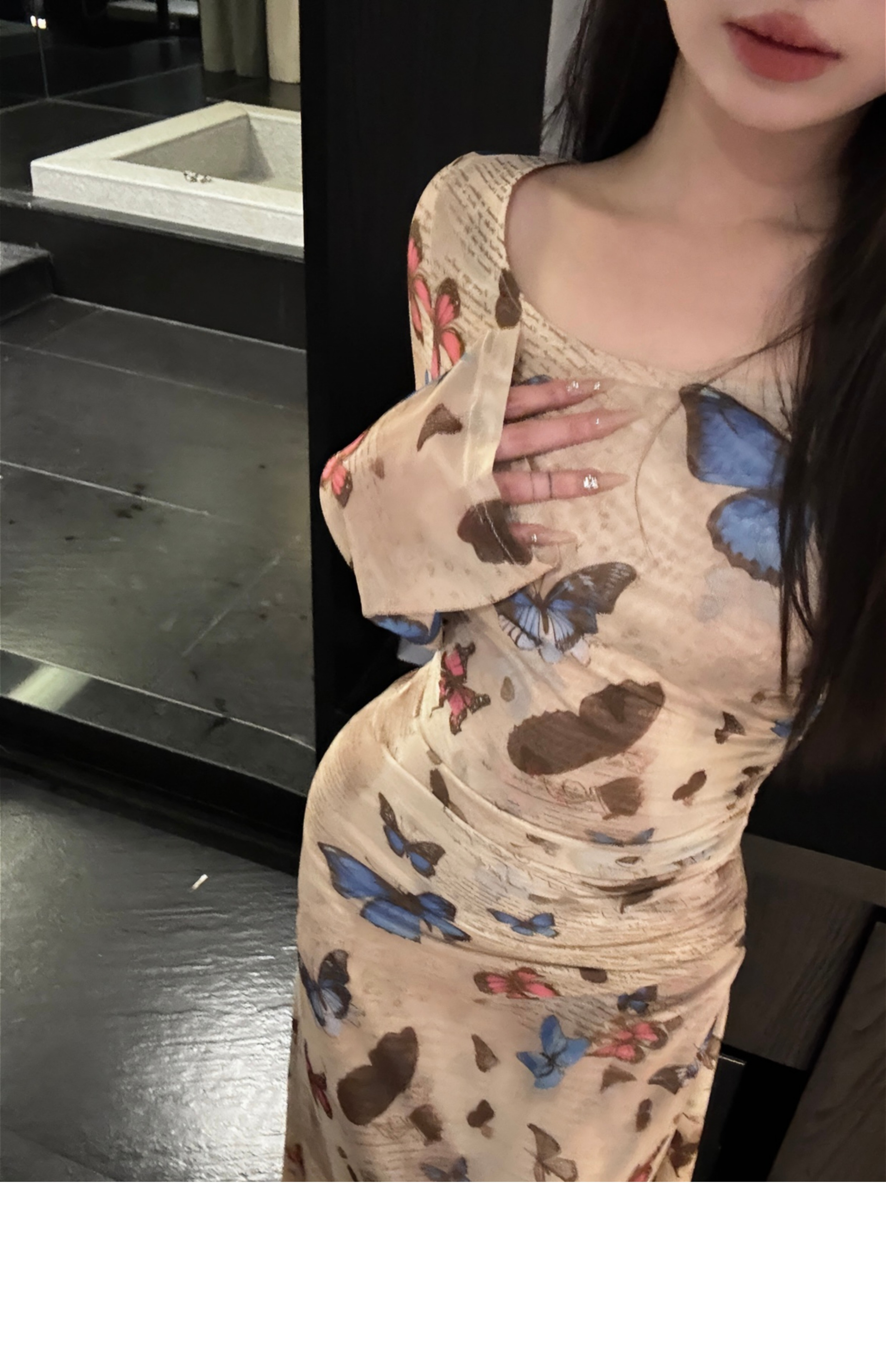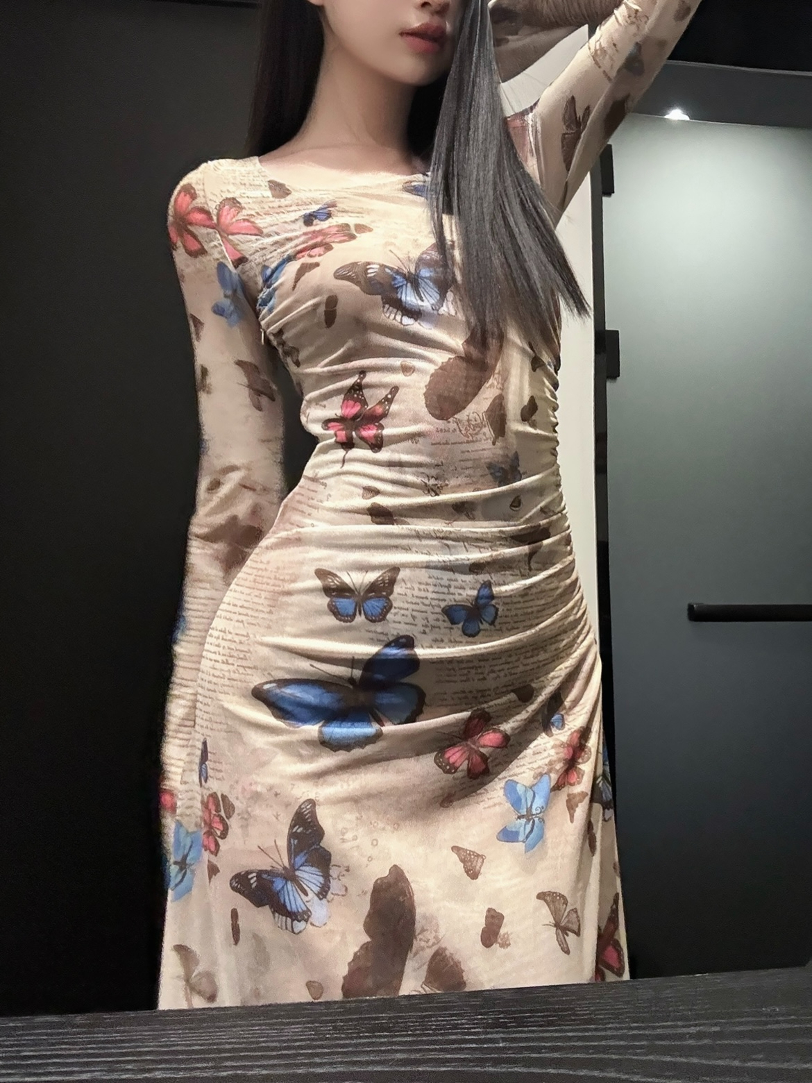 • Hot retro butterfly print long-sleeved dress for women, ruched, waist-cinching, sexy, bodycon long skirt