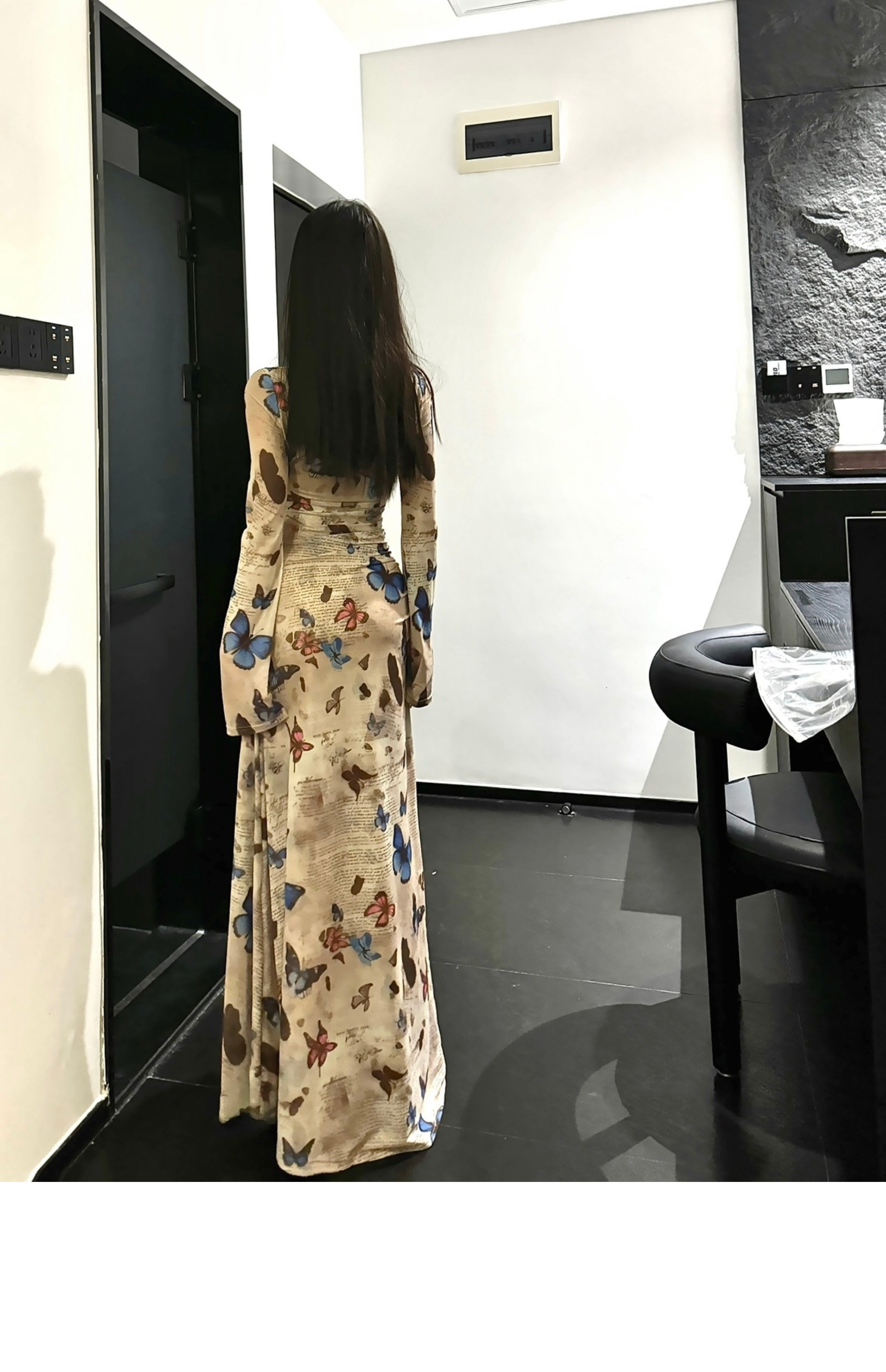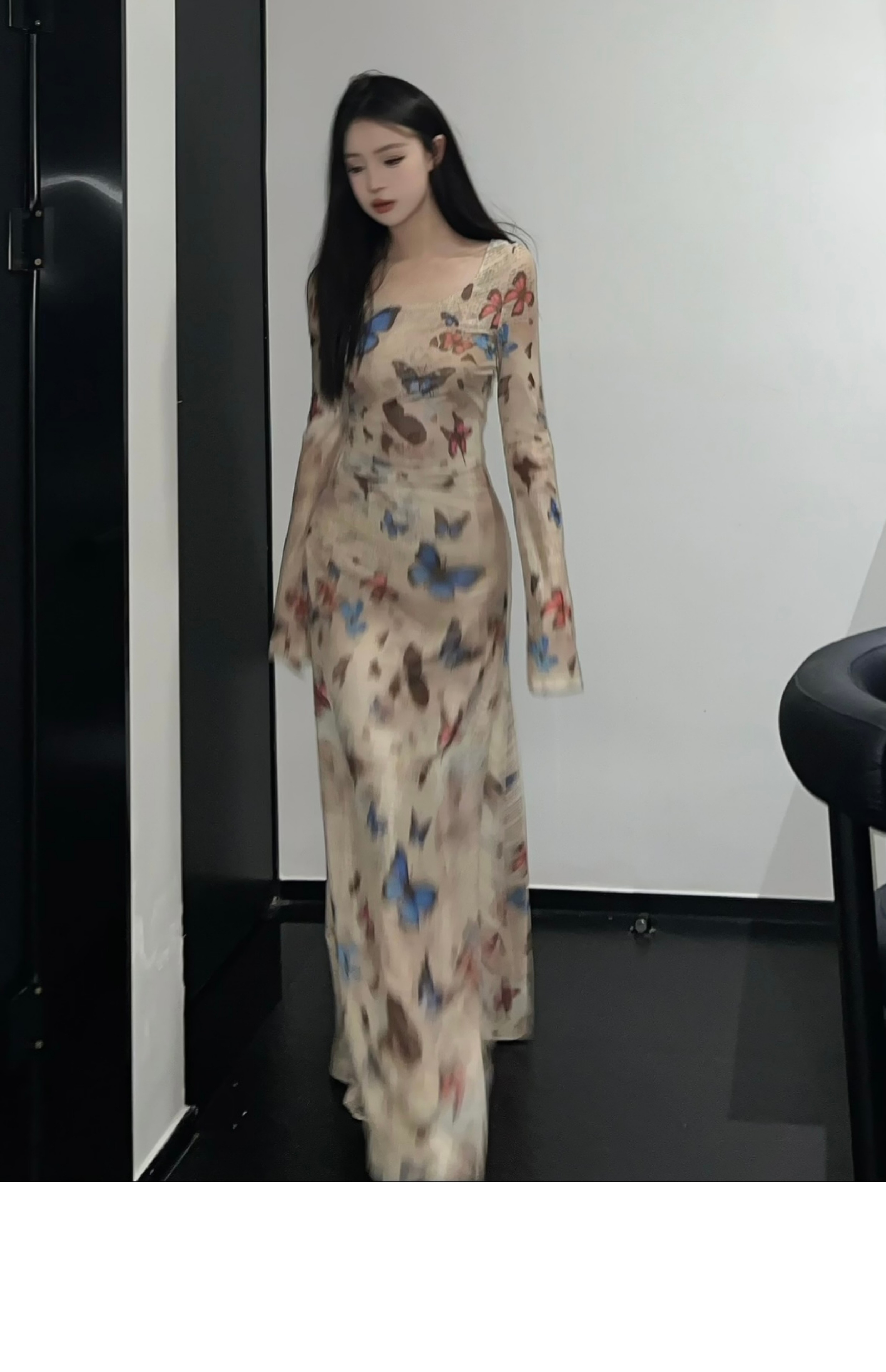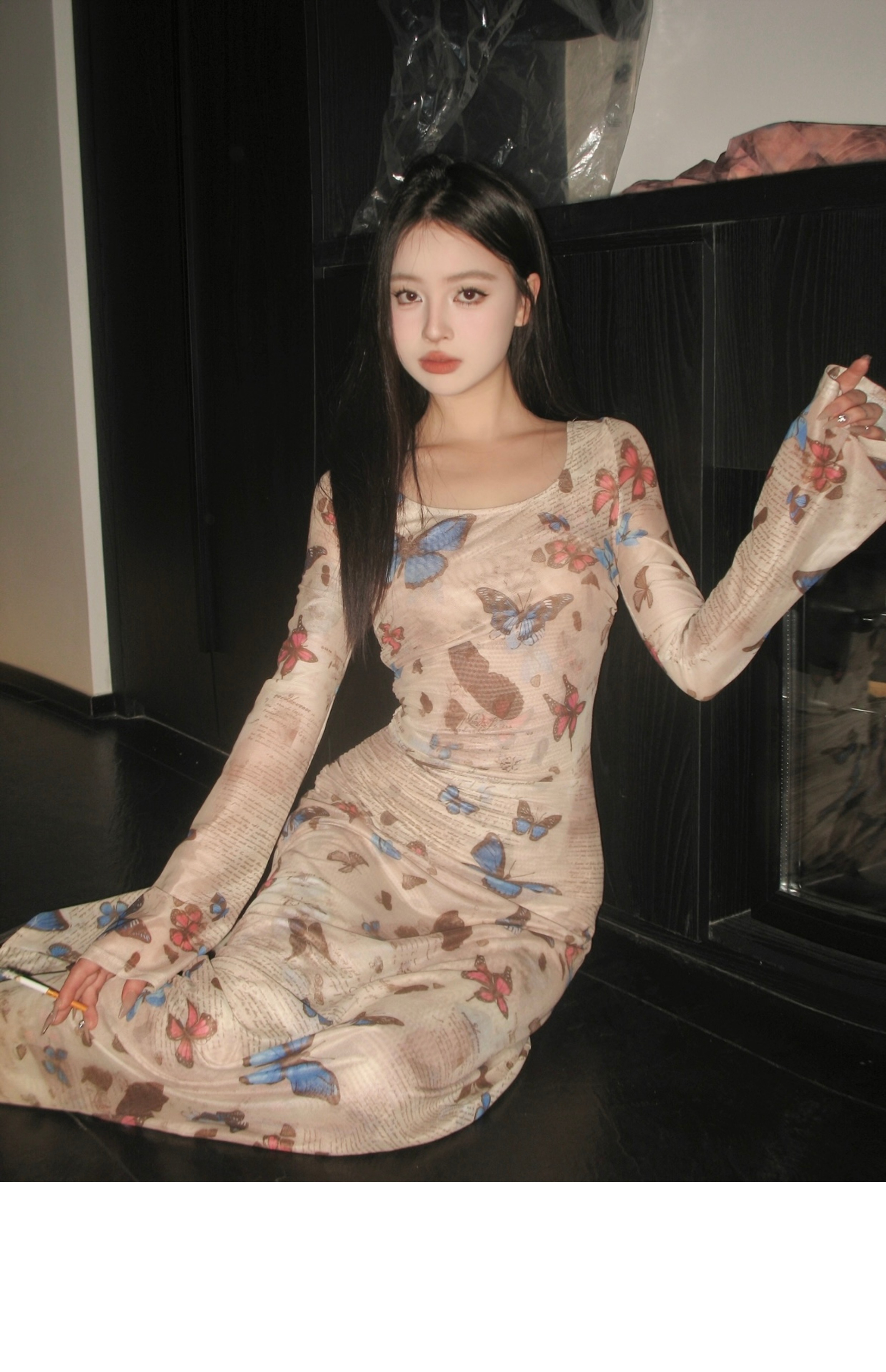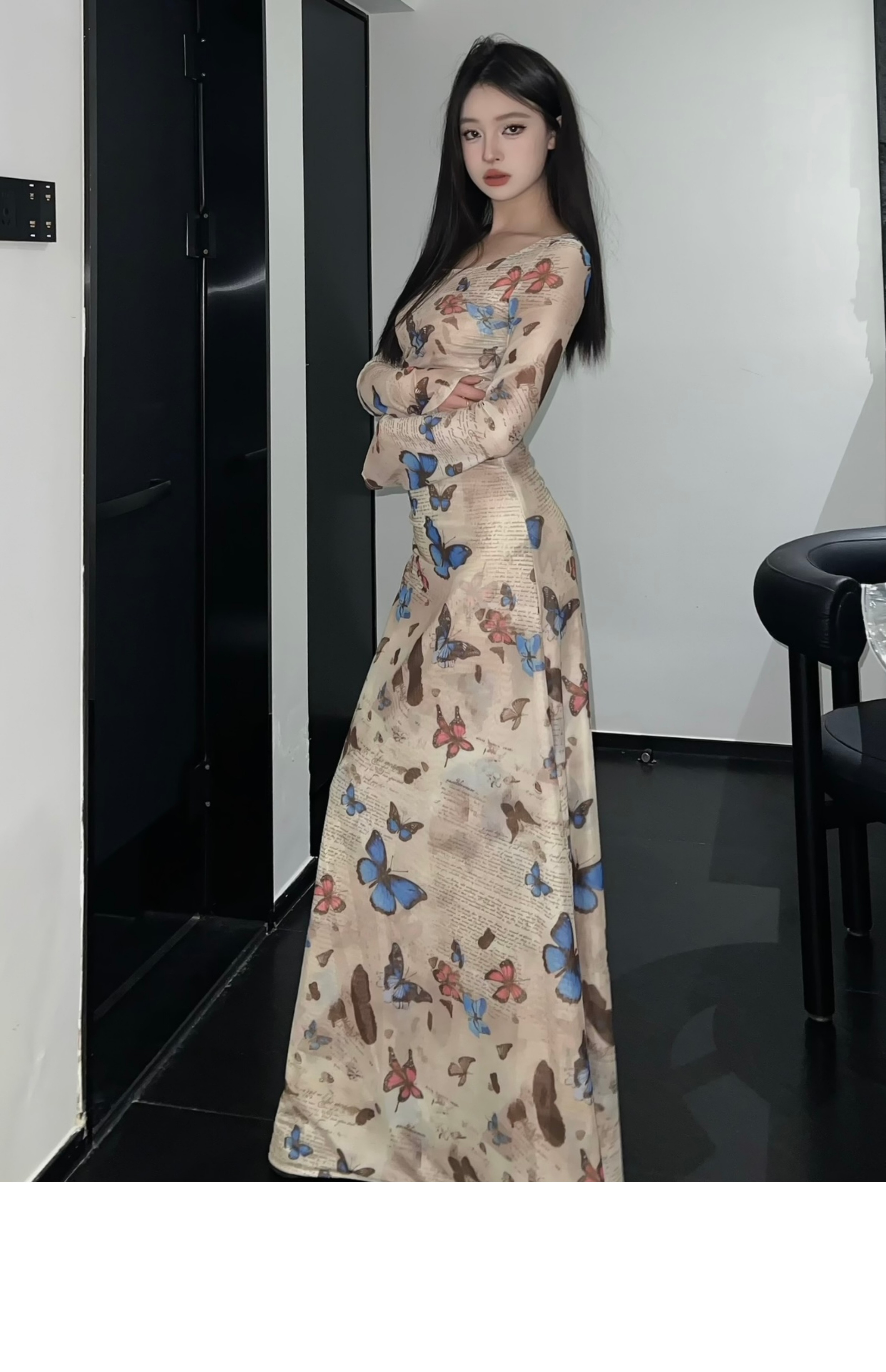 • Hot retro butterfly print long-sleeved dress for women, ruched, waist-cinching, sexy, bodycon long skirt