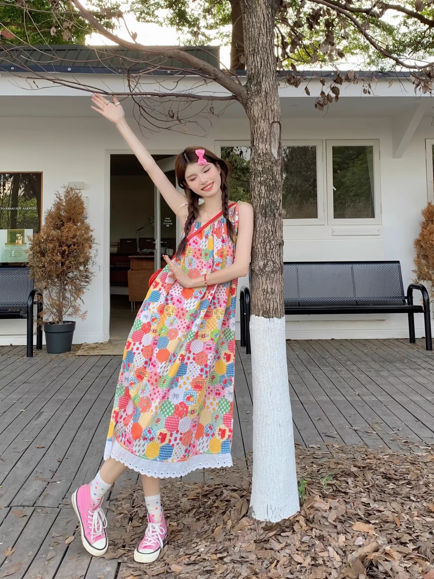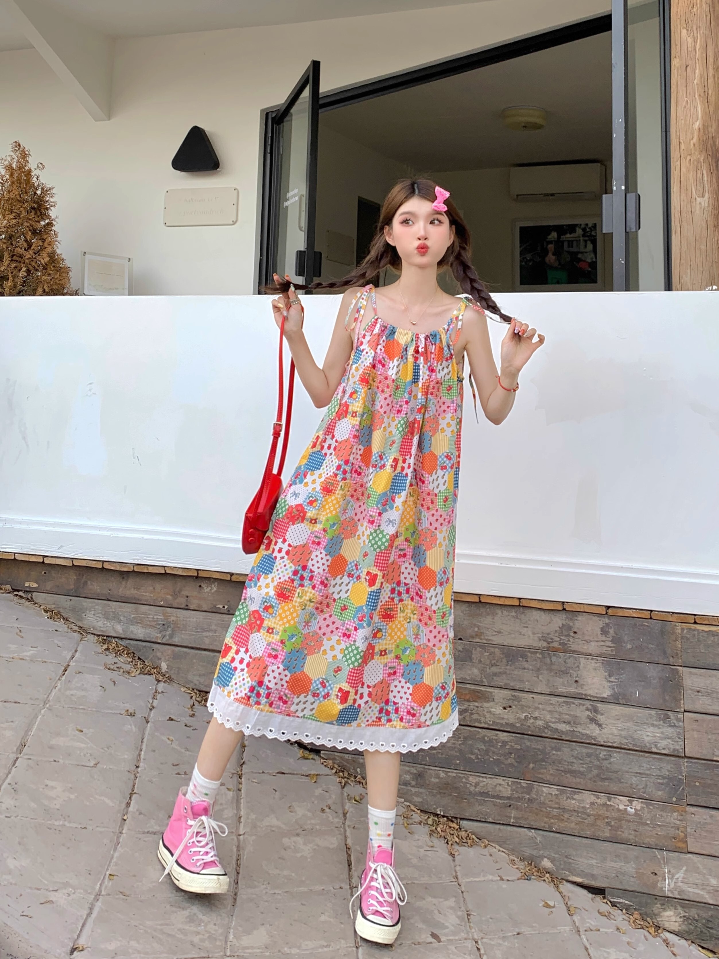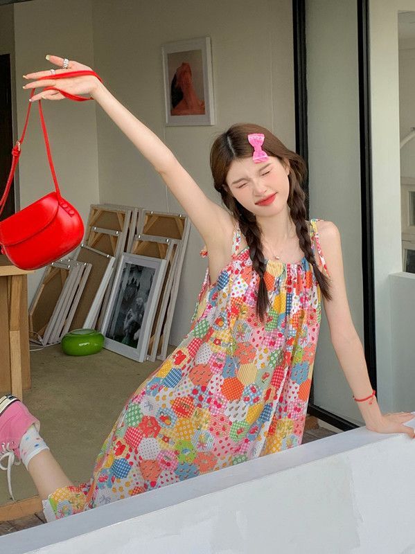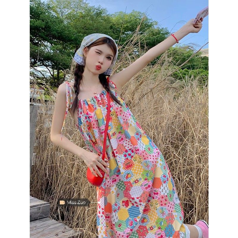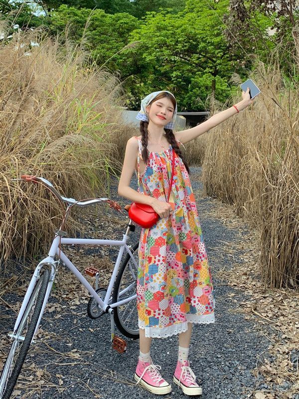 Floral print sundress for women, new summer style 2024, sweet, youthful, unique and super pretty, patchwork lace trim.
