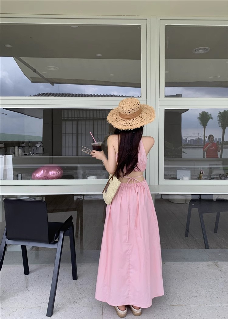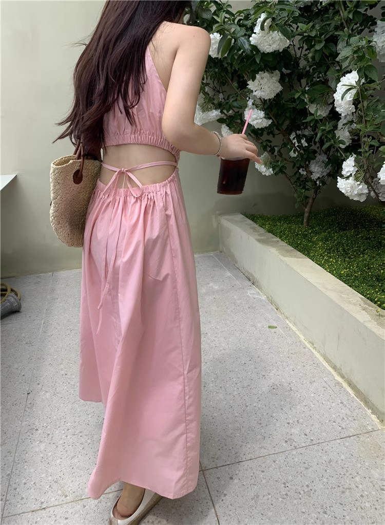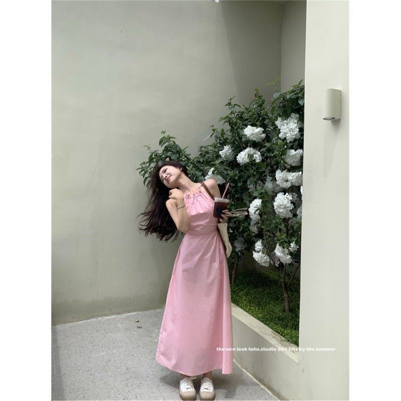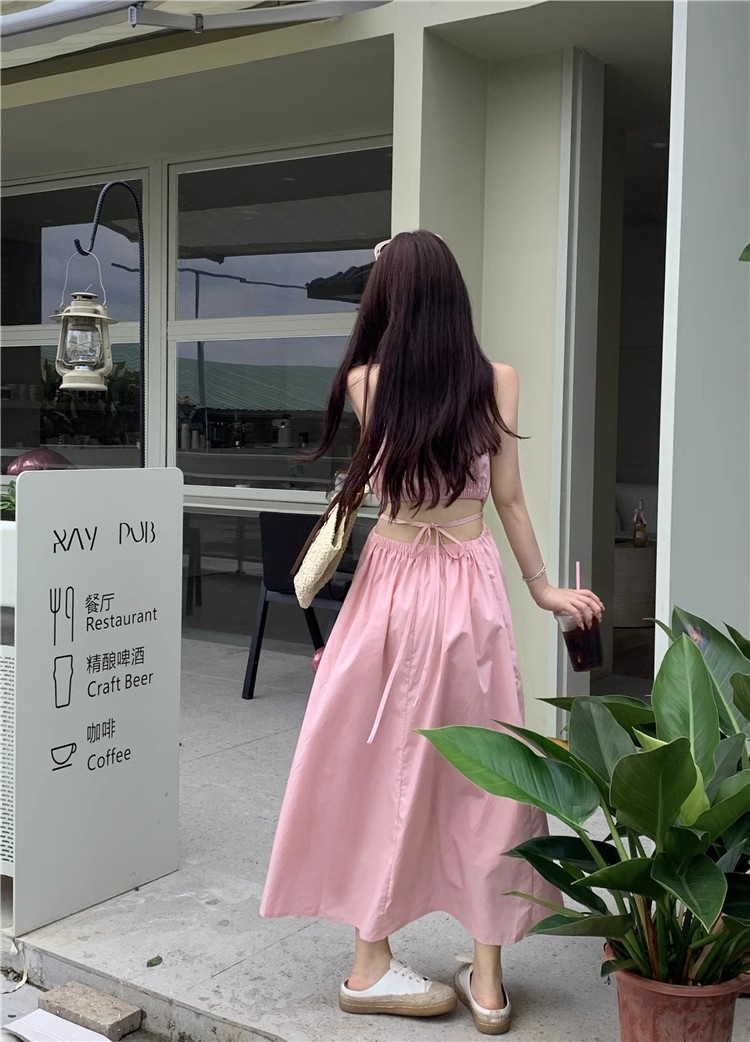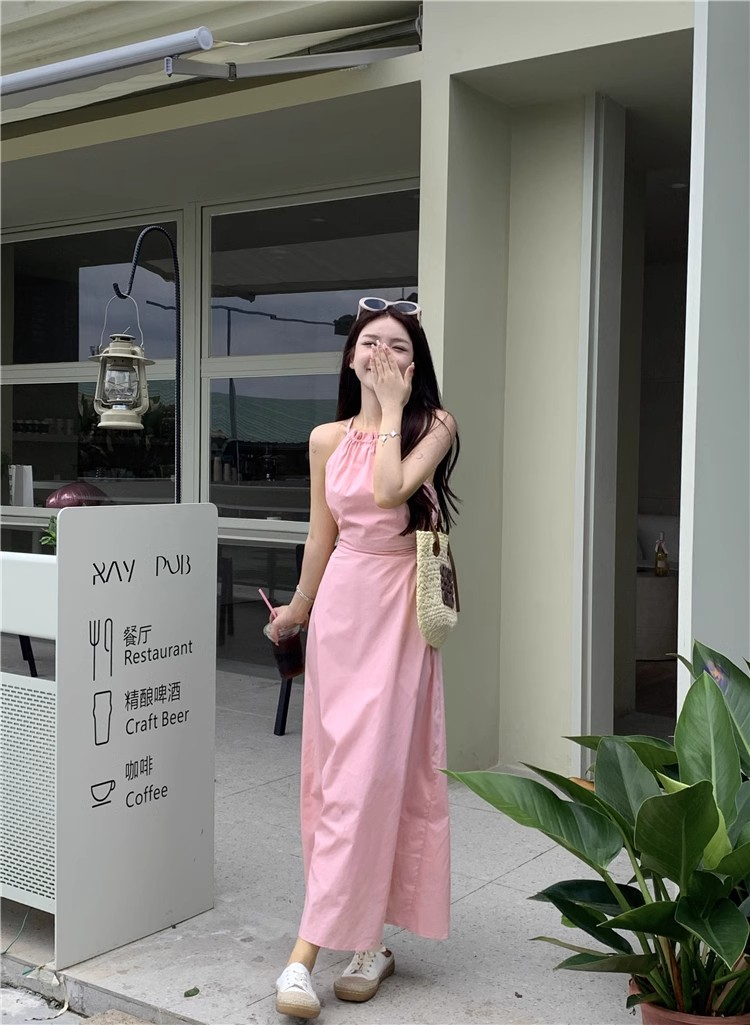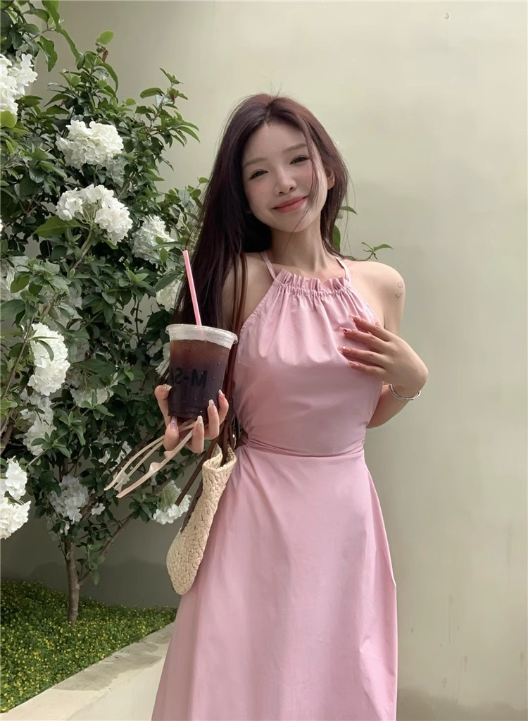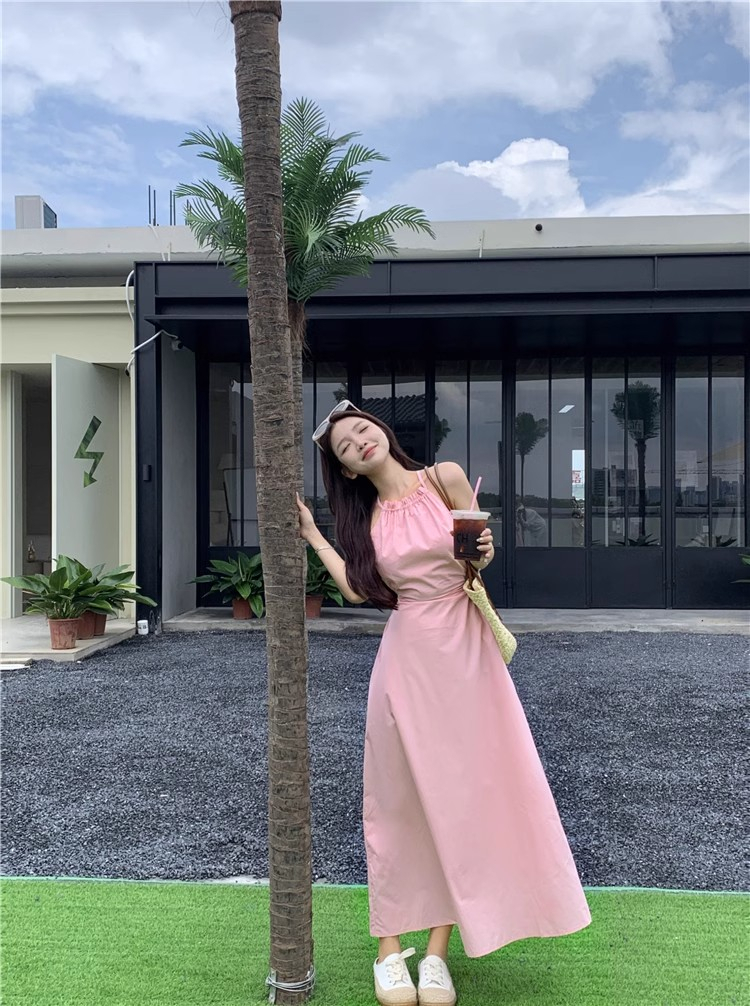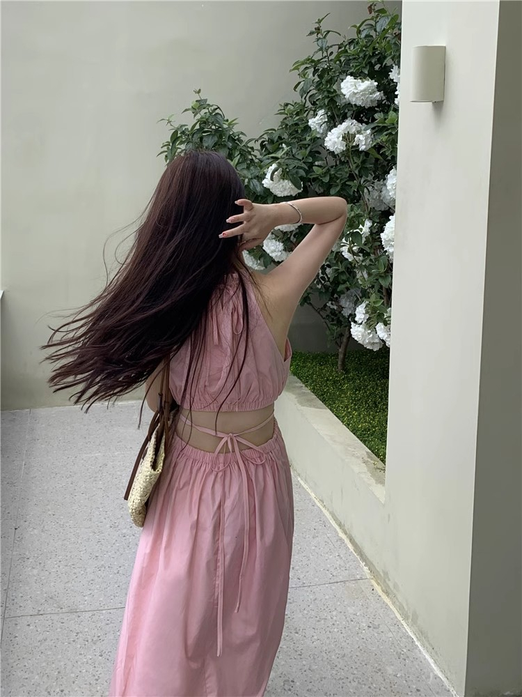 • Beach vacation style halter neck suspender dress, women's summer pink first love dress, backless waist-cinching elegant long dress