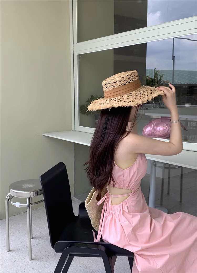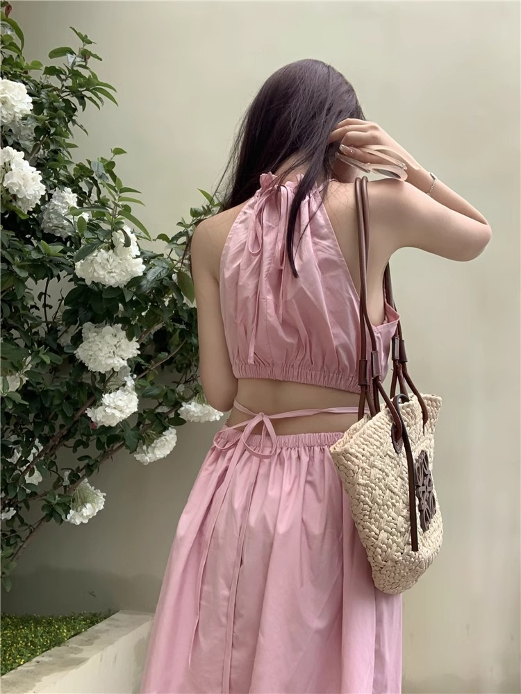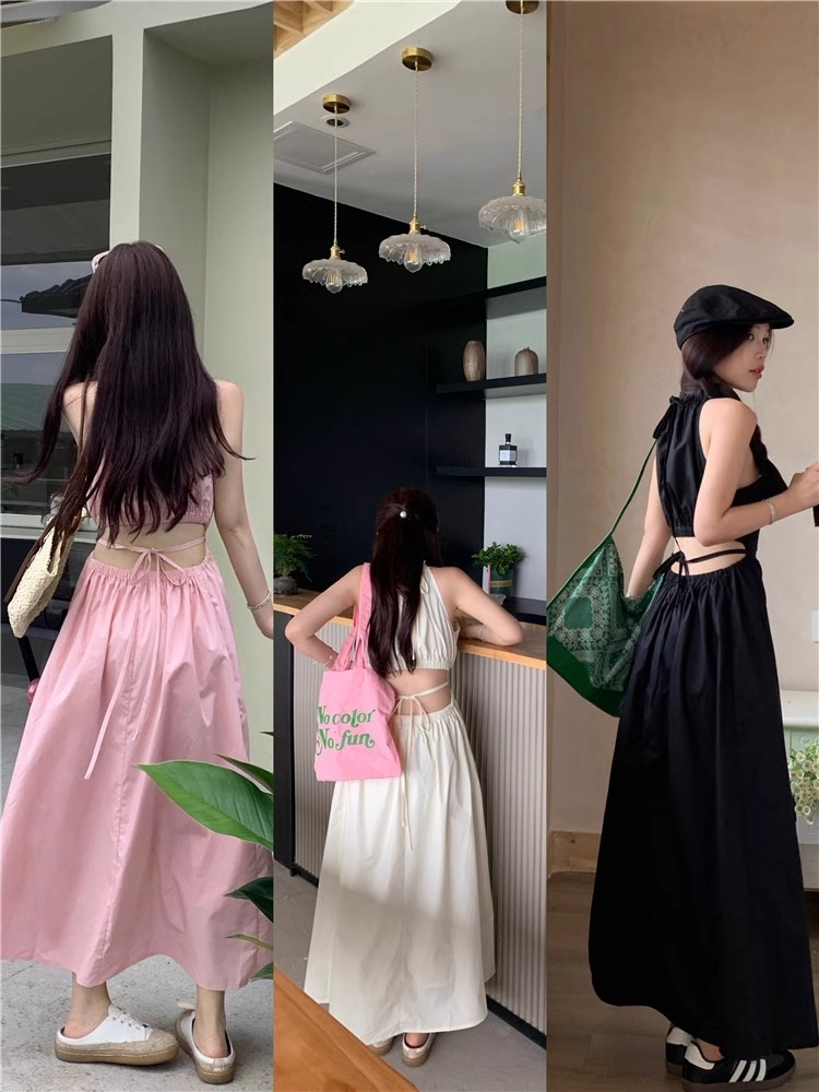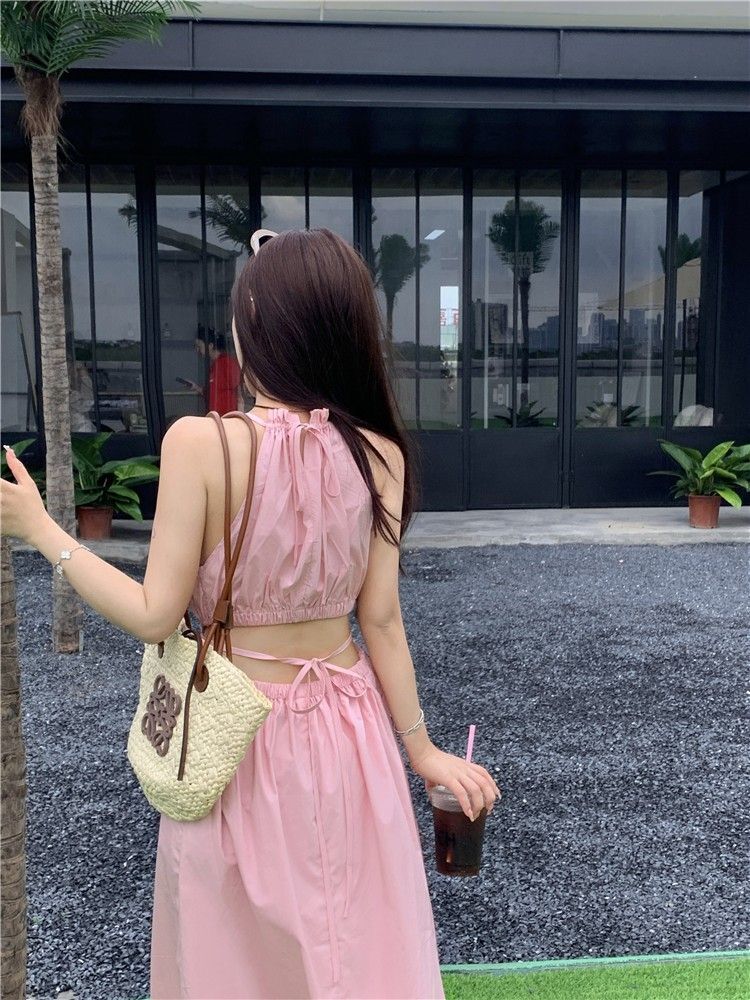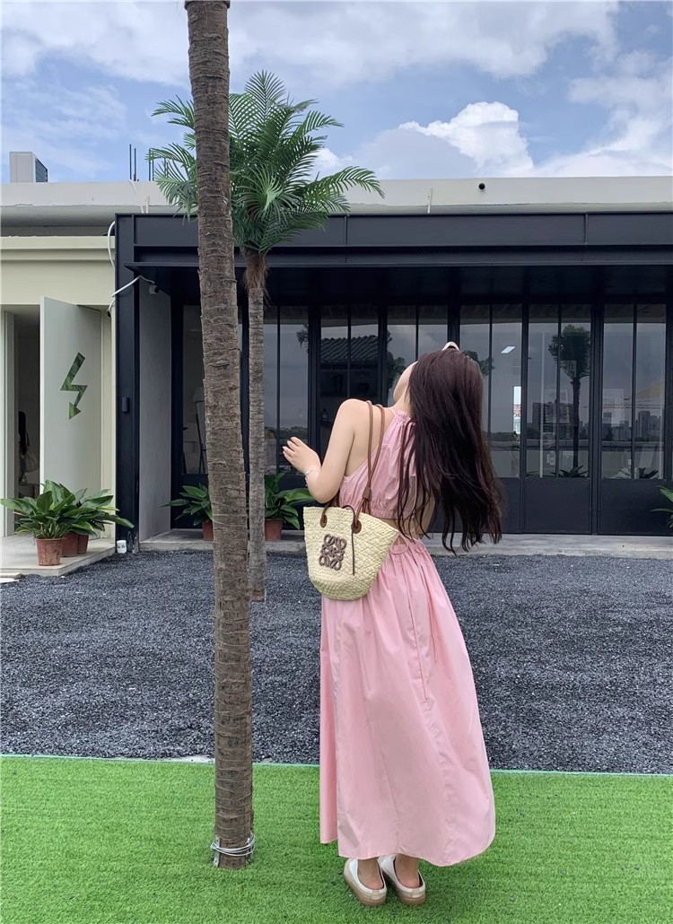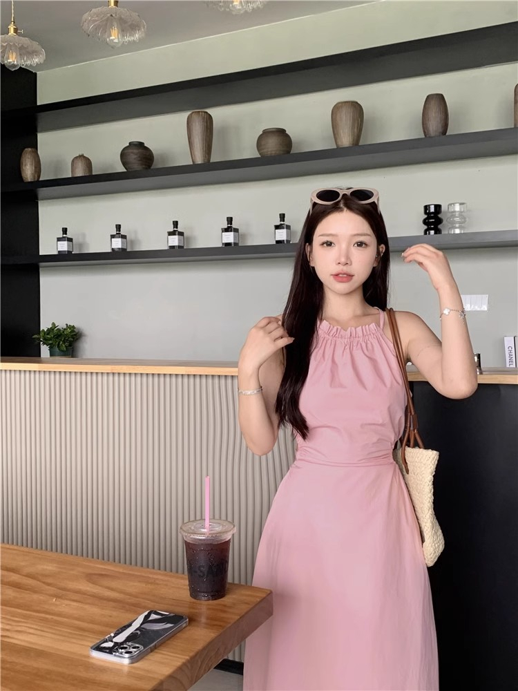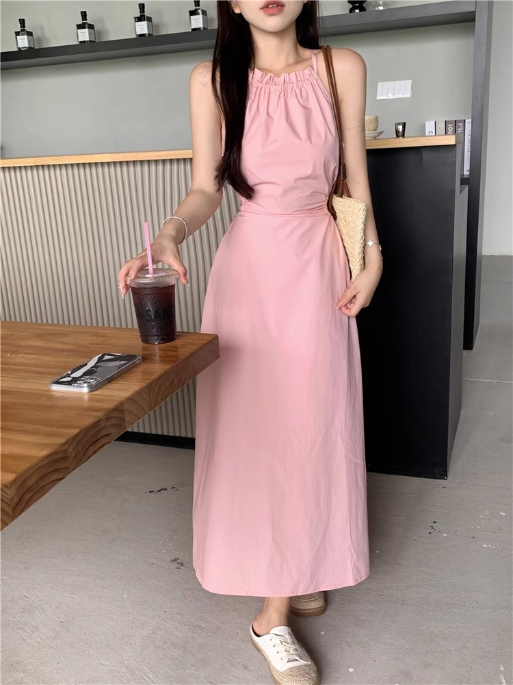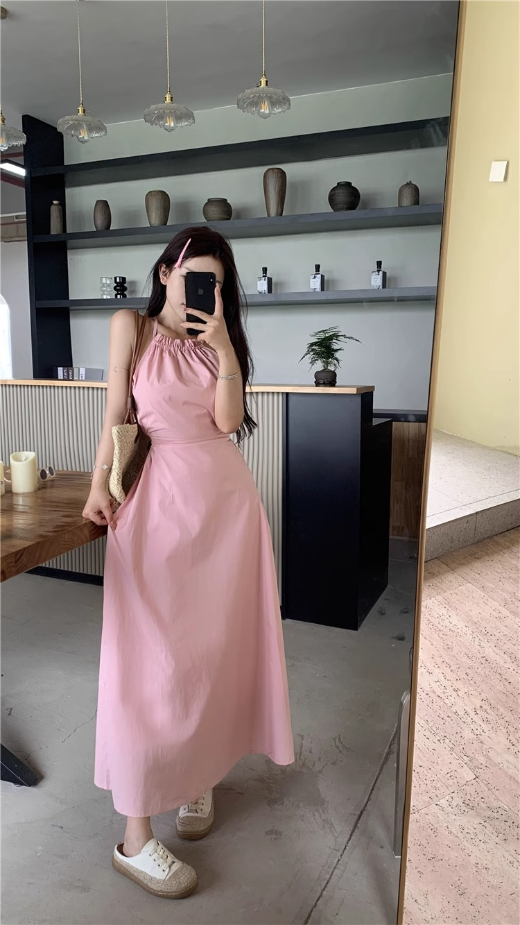 • Beach vacation style halter neck suspender dress, women's summer pink first love dress, backless waist-cinching elegant long dress