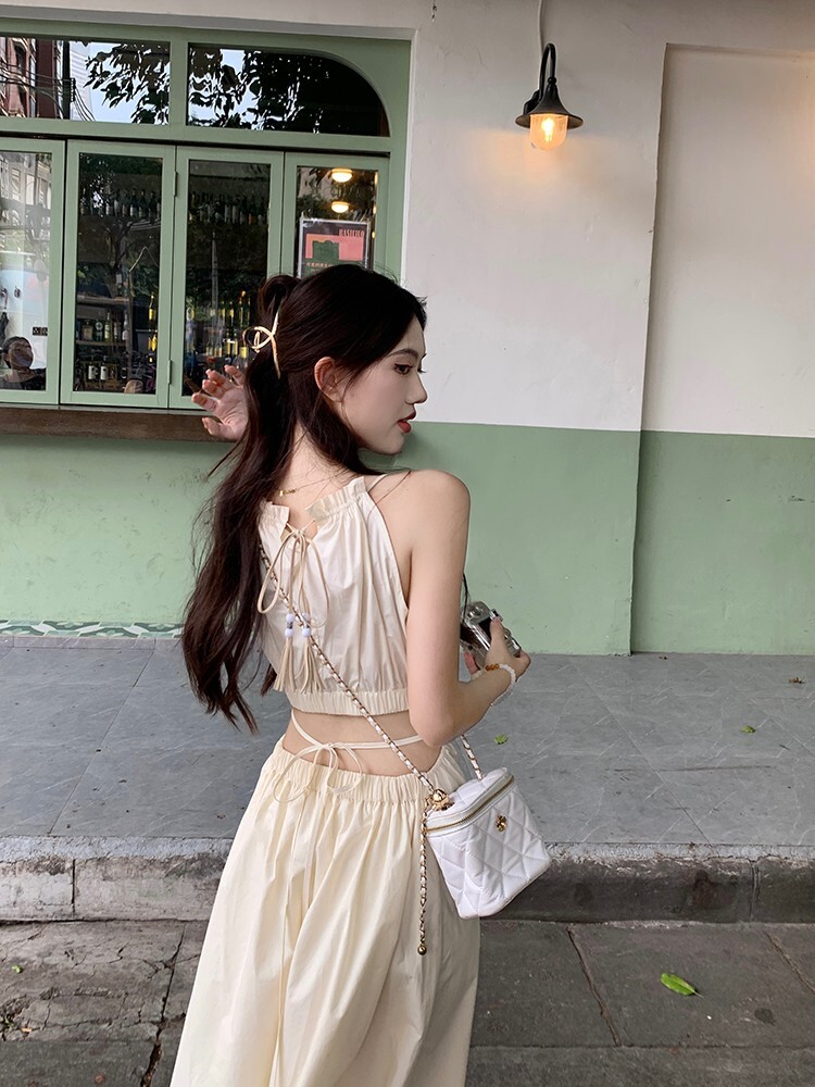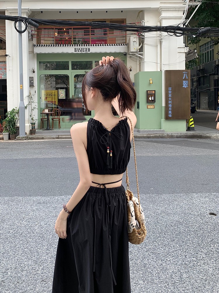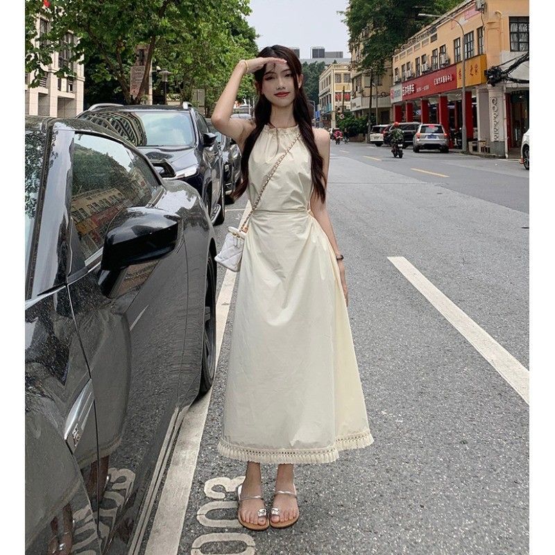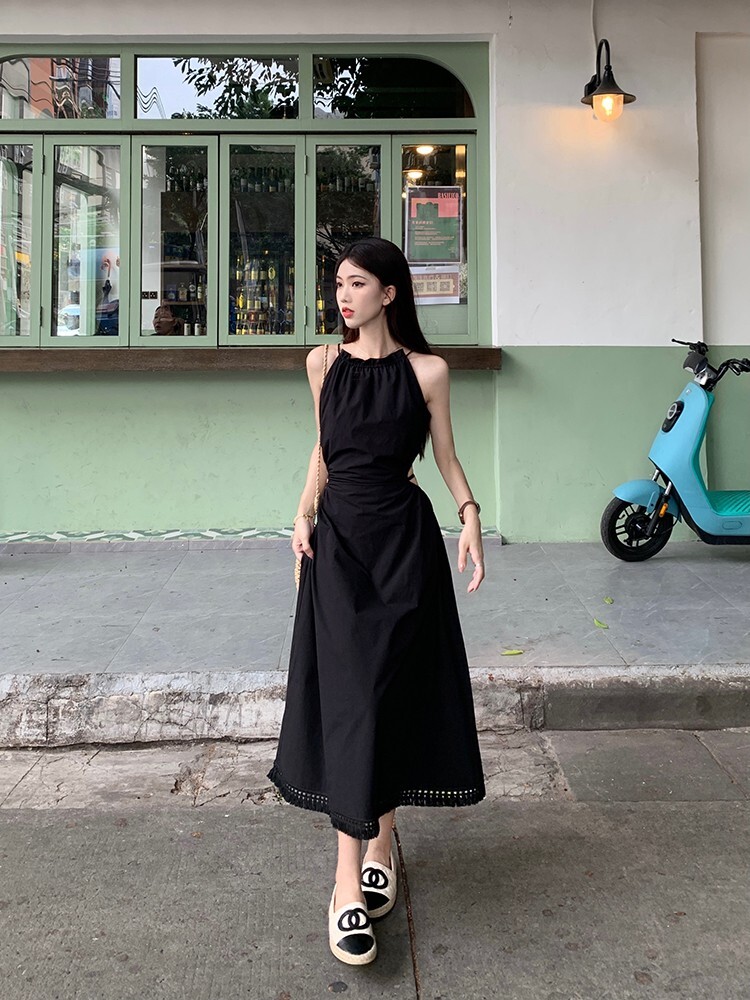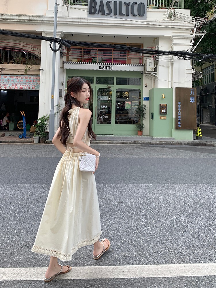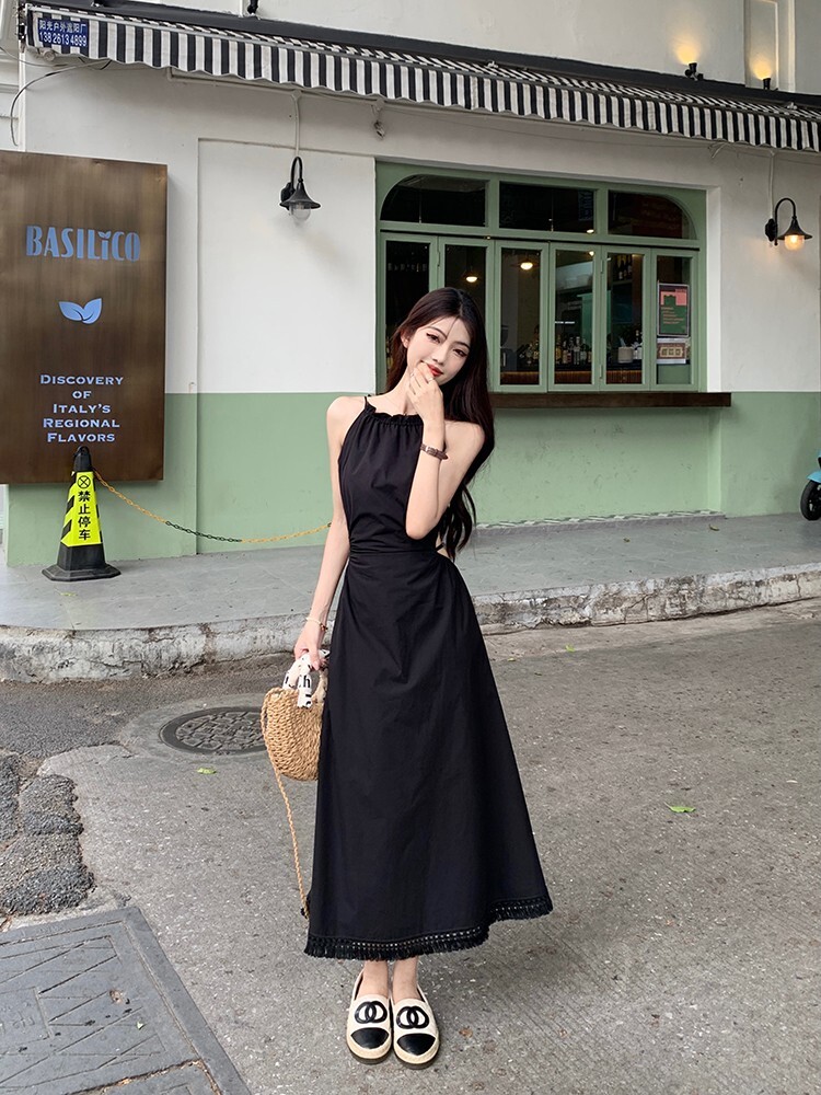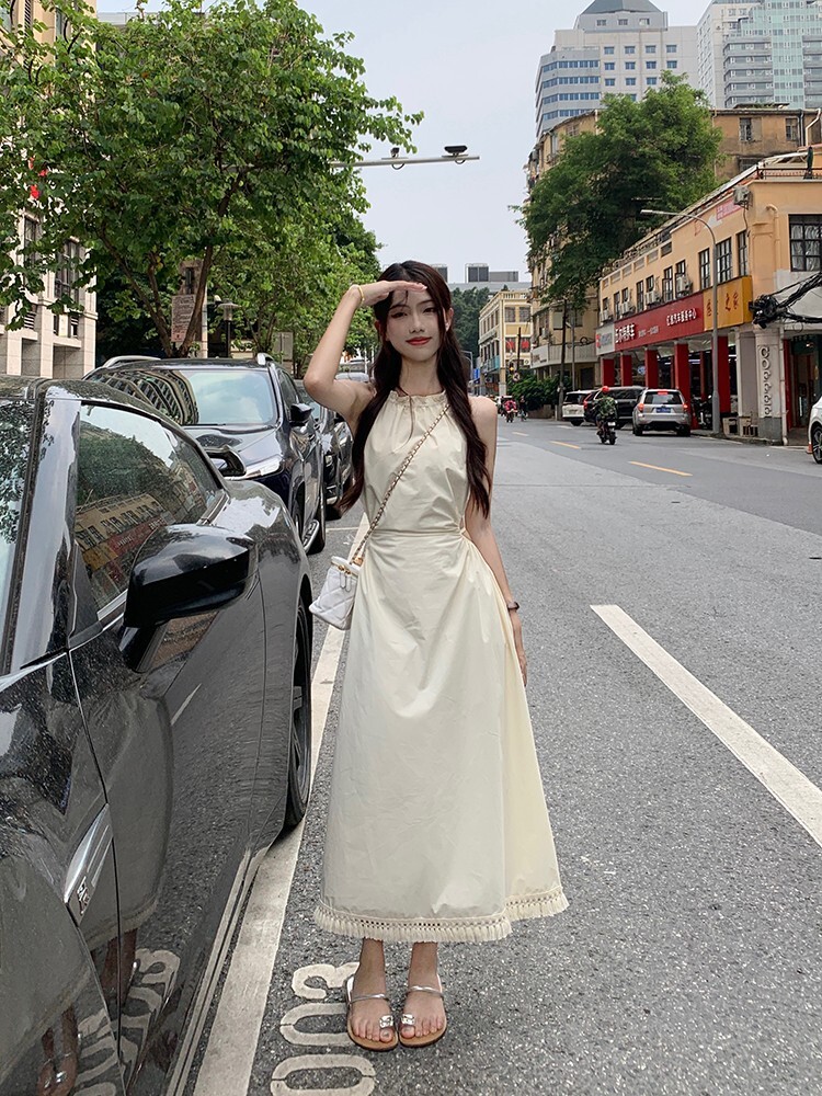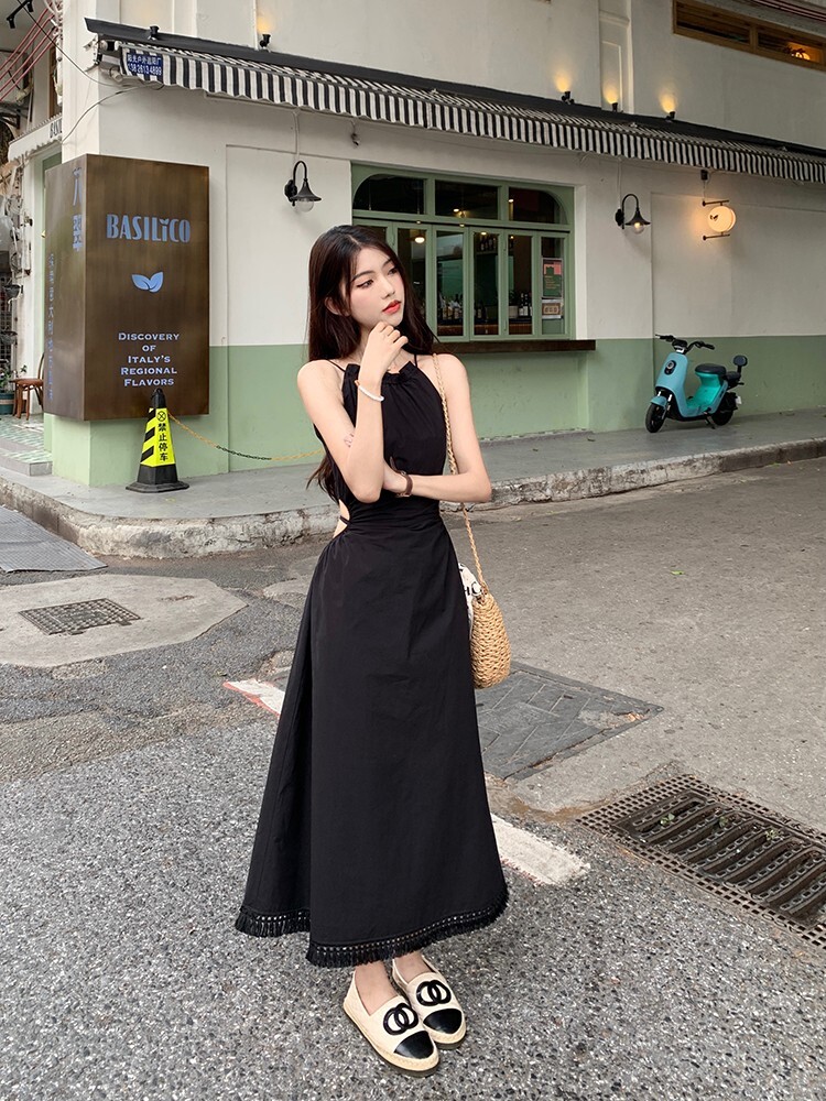 • Pure and alluring halter neck suspender dress for women, summer design, elegant and stylish, hollowed-out waist, slimming and tassel long skirt