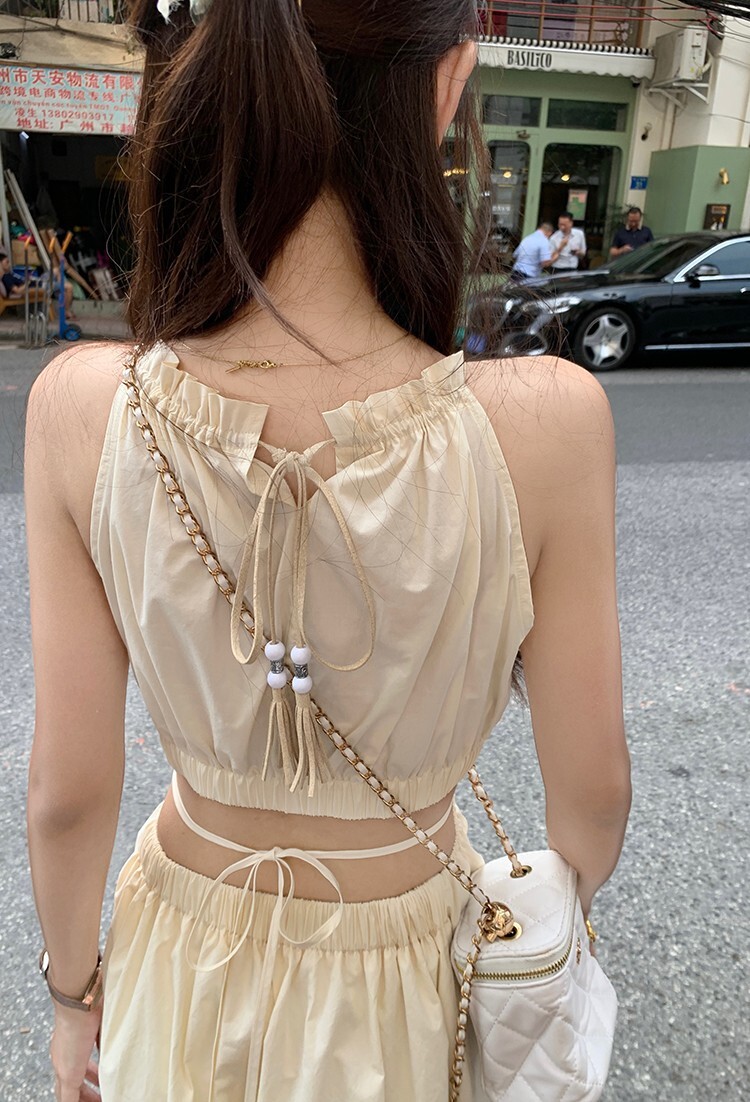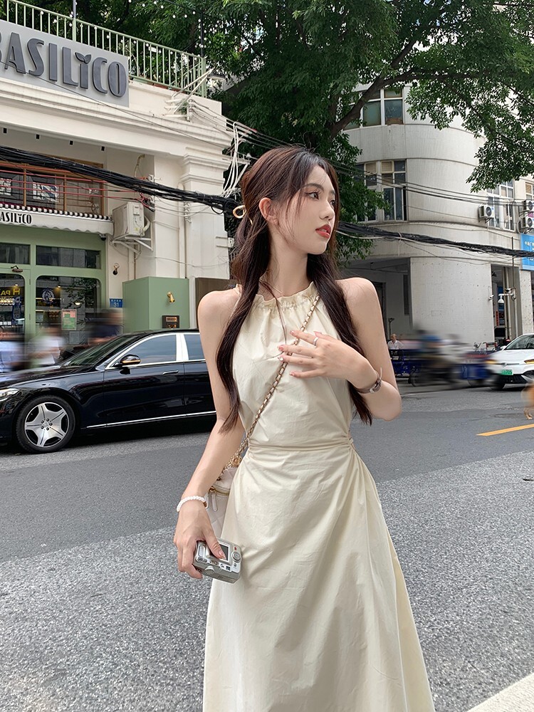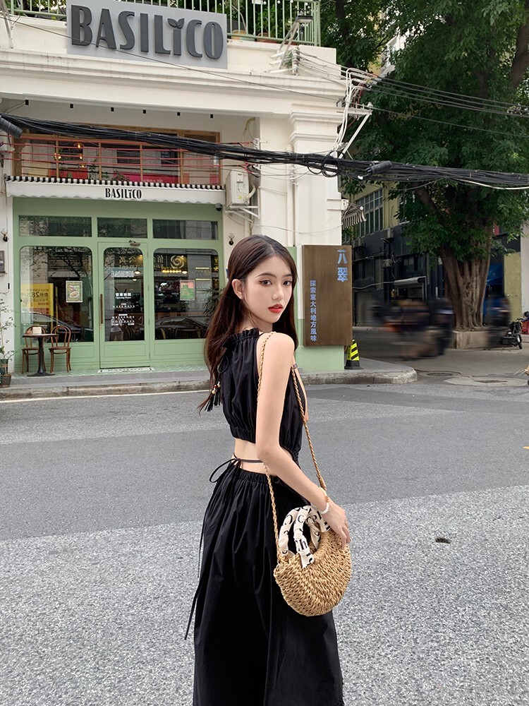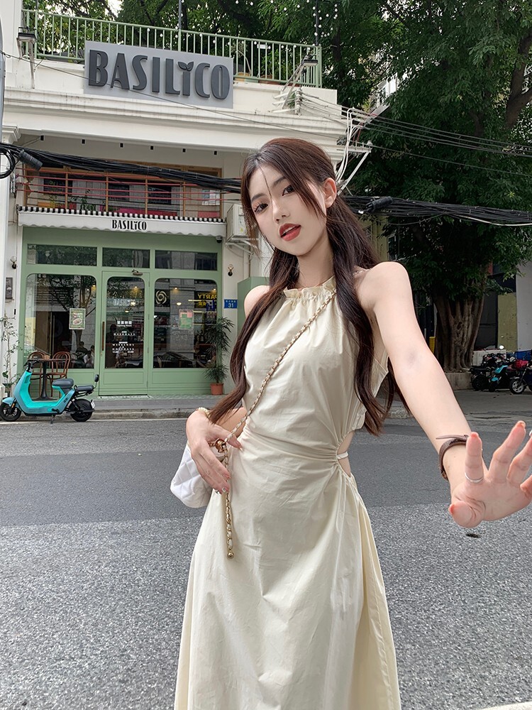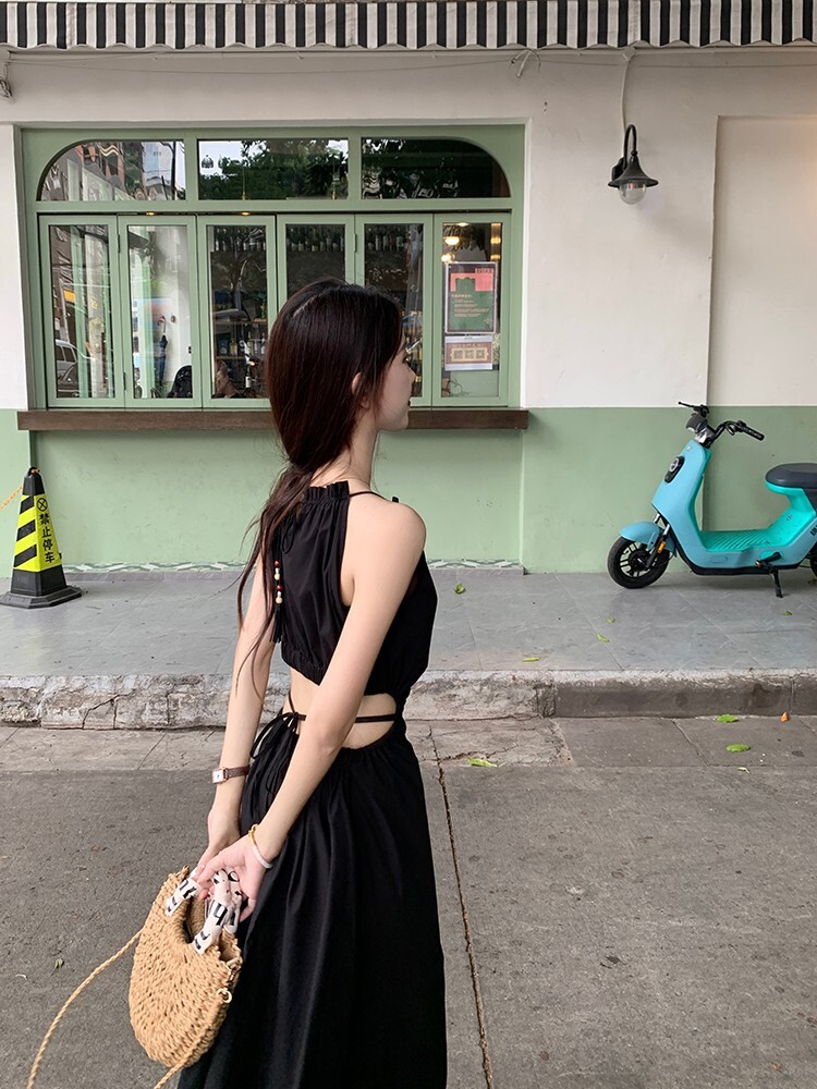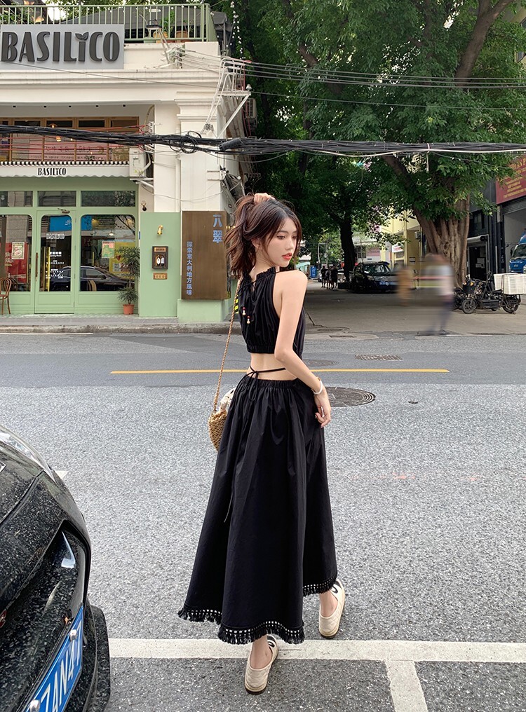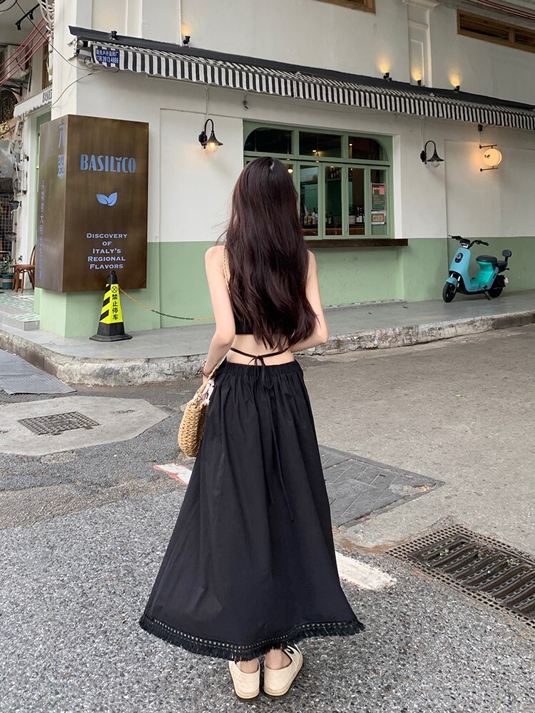 • Pure and alluring halter neck suspender dress for women, summer design, elegant and stylish, hollowed-out waist, slimming and tassel long skirt