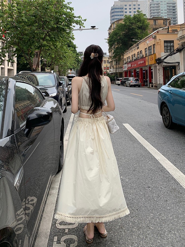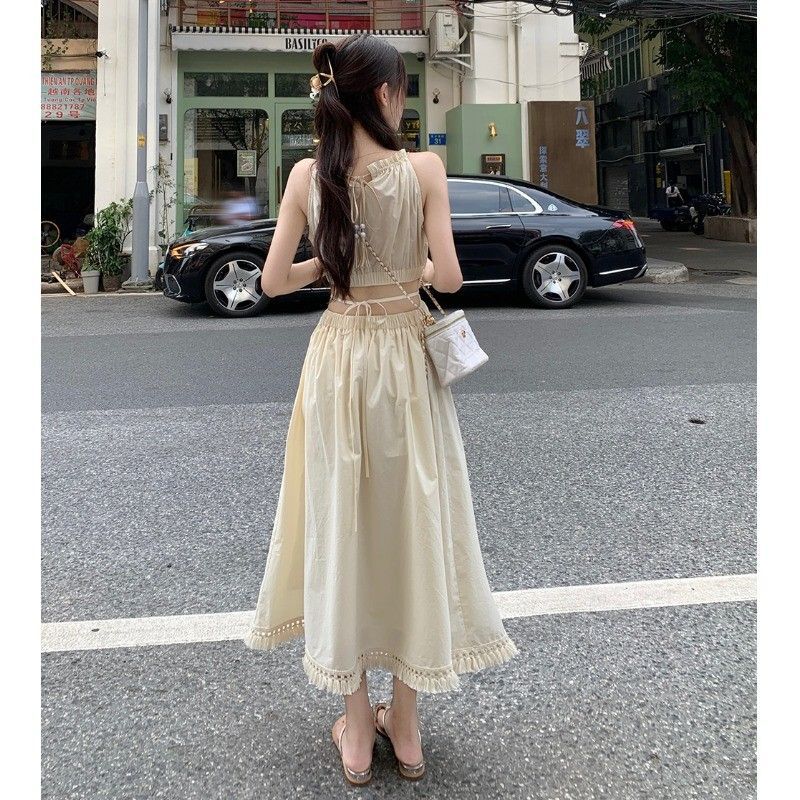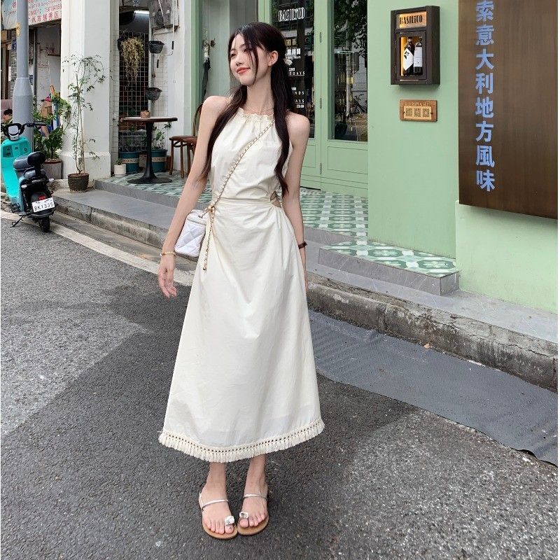 Pure and alluring halter neck suspender dress for women, summer design, elegant and stylish, hollowed-out waist, slimming and tassel long skirt
